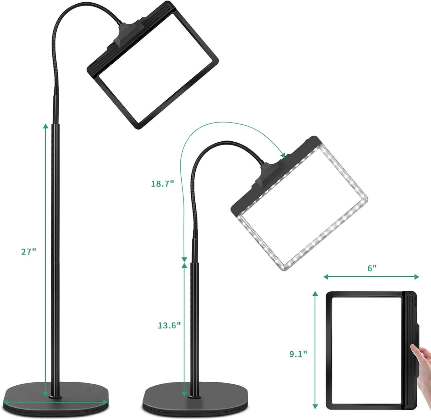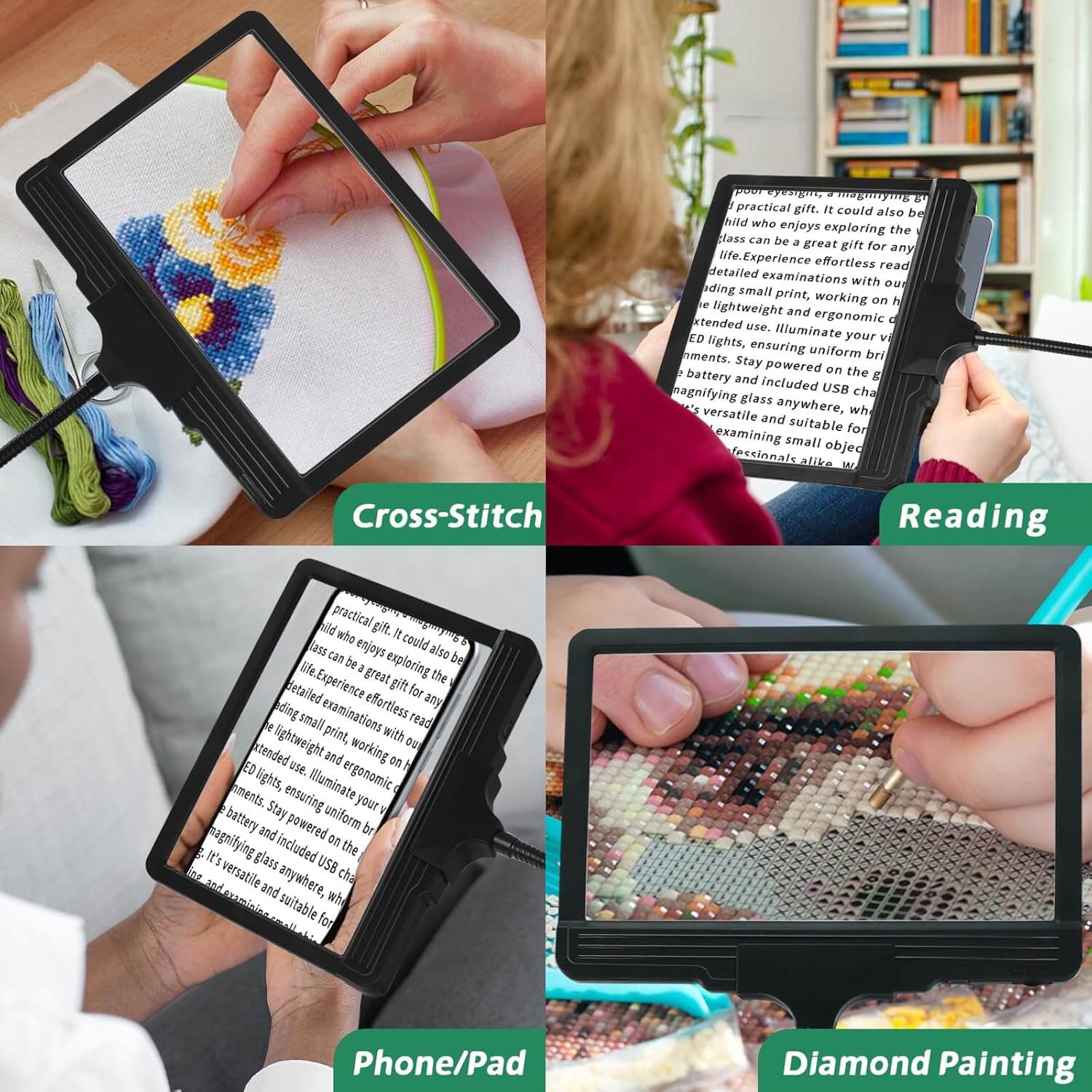 3-v-1 povečevalna lupa združuje funkcionalnost, udobje in kakovost, kar jo naredi popolno izbiro za hobije, branje, ročna dela in številne druge aktivnosti.