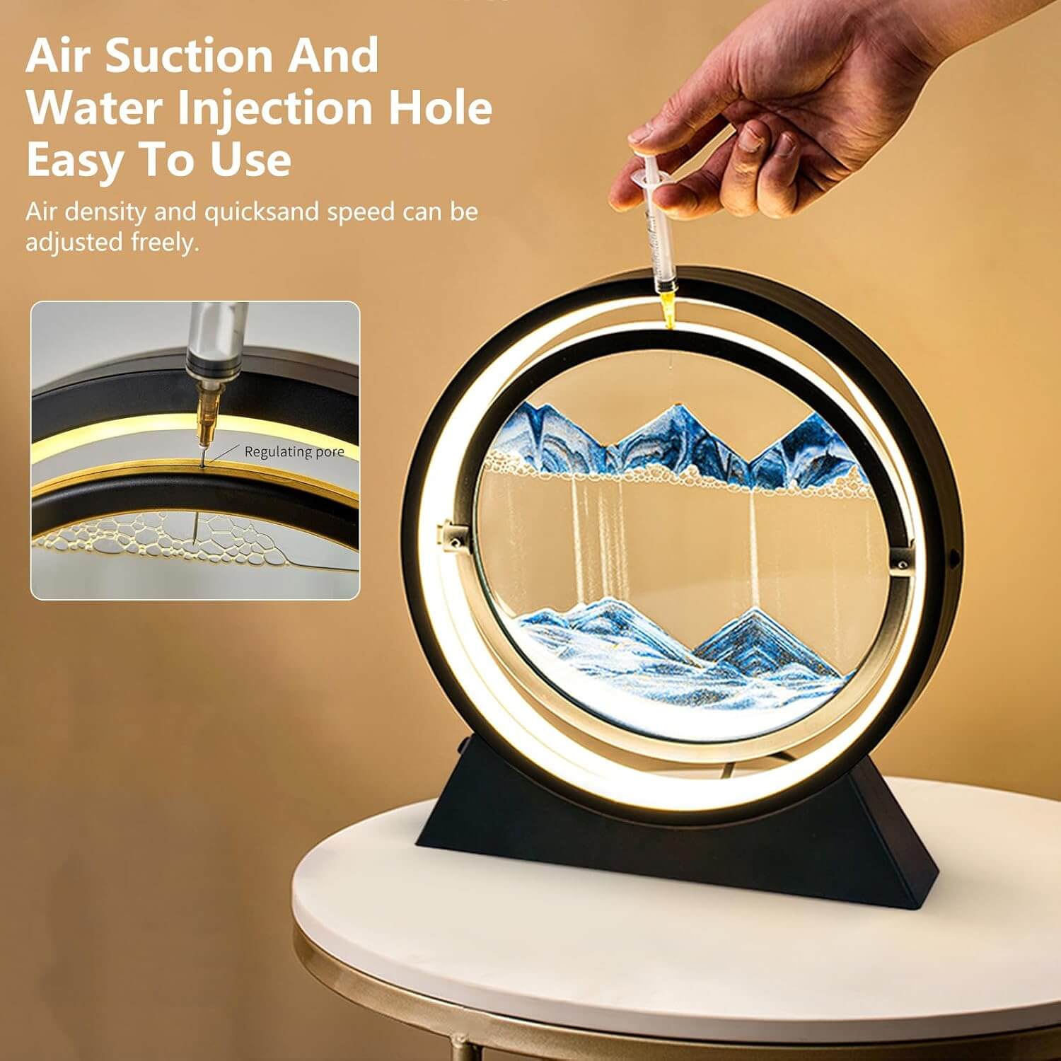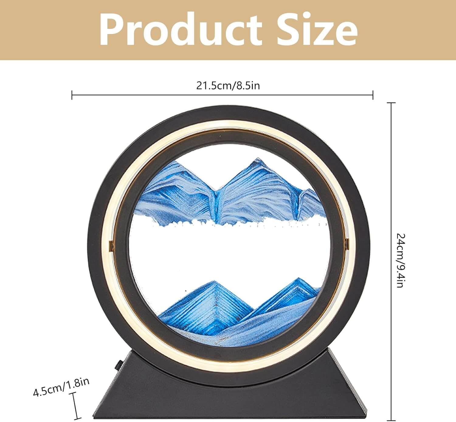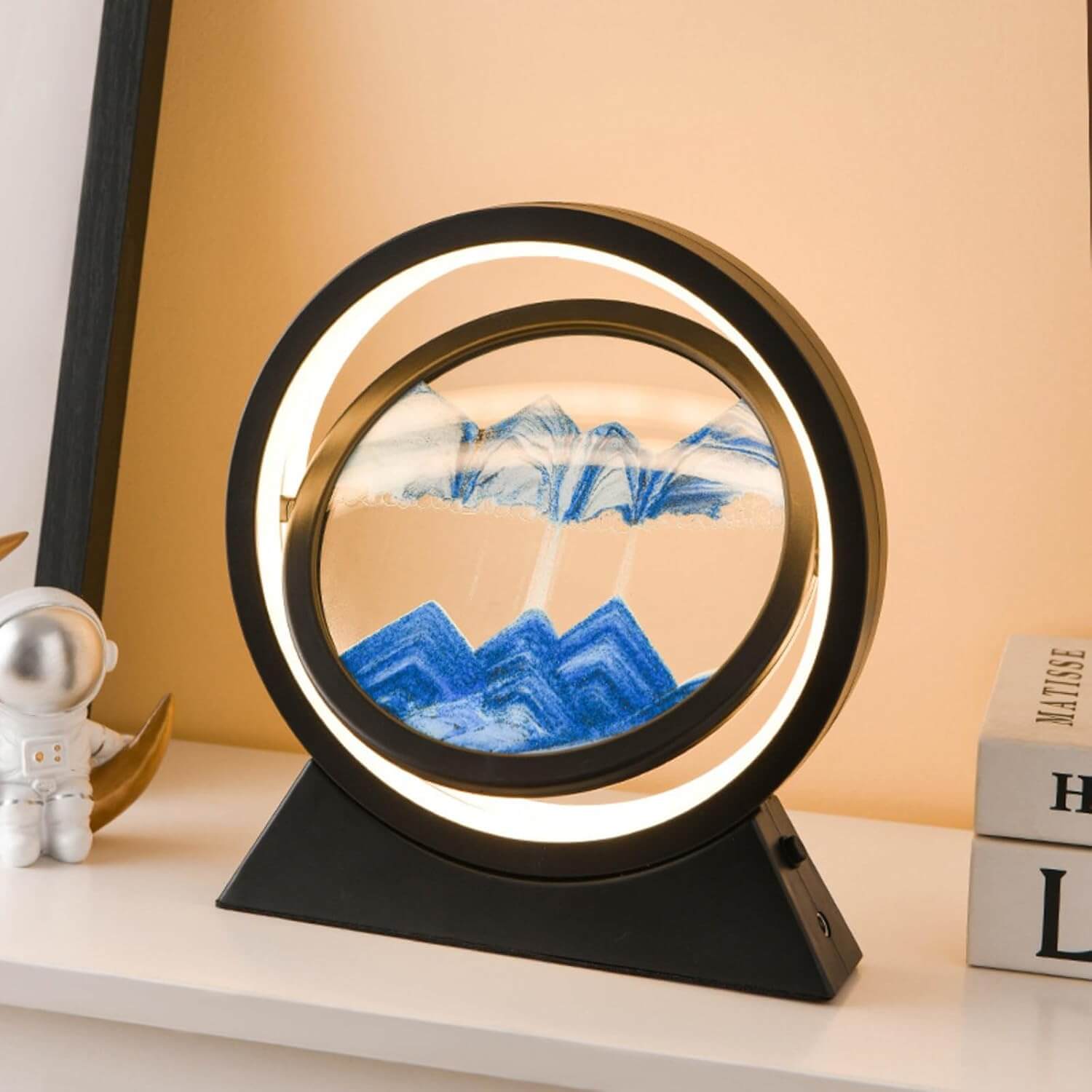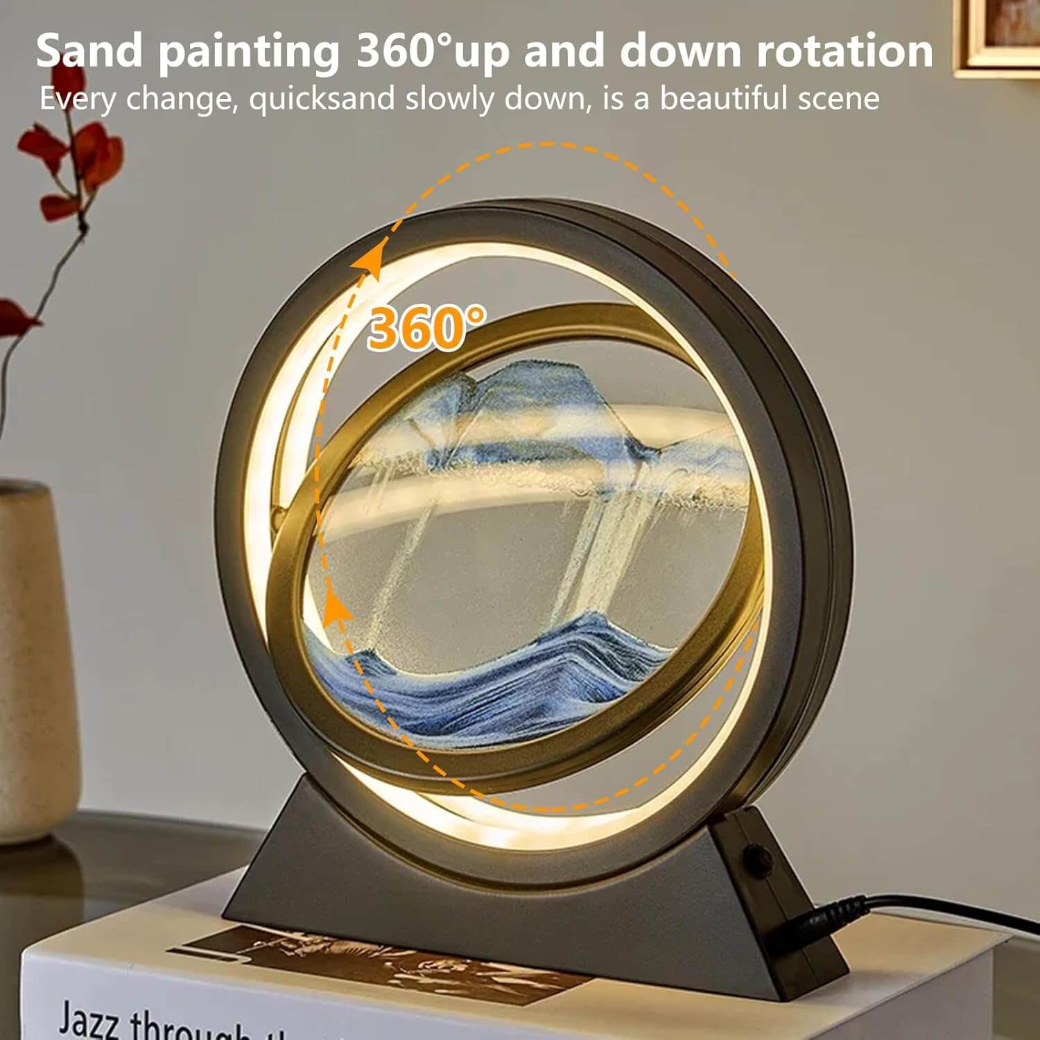 Elegantna in edinstvena 3D peščena slika s svetlobnim efektom in možnostjo vrtenja ponuja čudovit naravni pogled na peščene pokrajine, ki se spreminjajo v realnem času. S tem umetniškim kosom boste svoj prostor napolnili z mirom in lepoto.