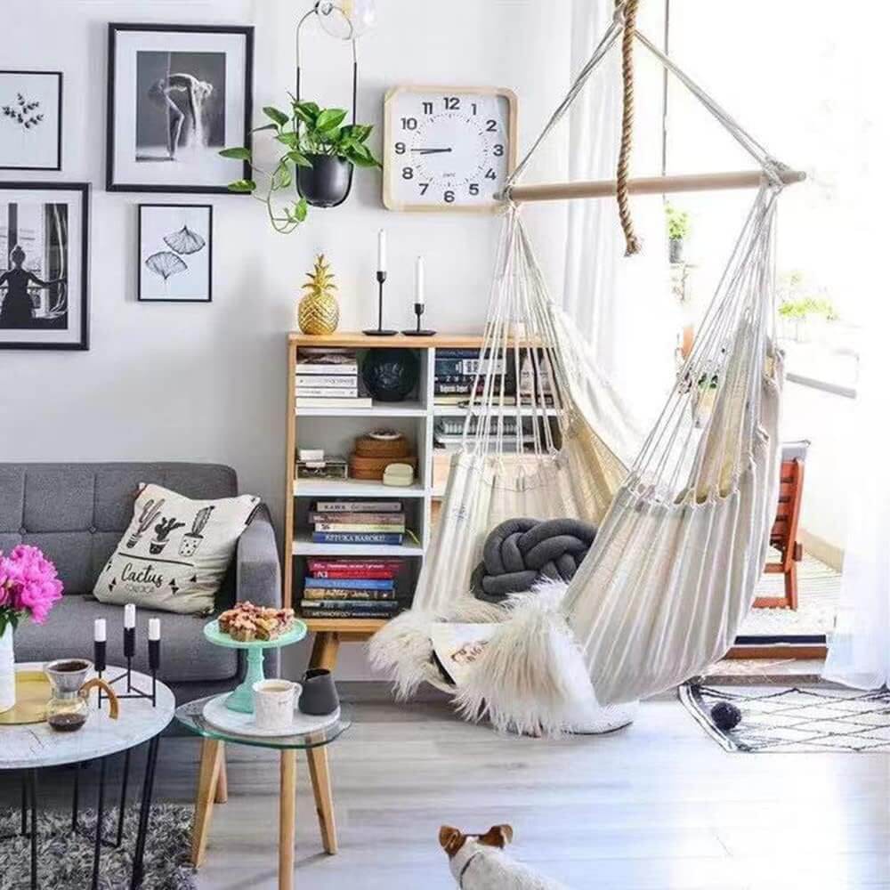 Viseči gugalnik iz kakovostnega bombažnega platna ponuja mehko, udobno “kokon” zibelko za sproščanje, branje ali uživanje na terasi, vrtu ali v dnevni sobi. Enostavno ga lahko premikaš med prostori, vključena montažna oprema iz nerjavečega jekla pa omogoča varno in hitro namestitev.