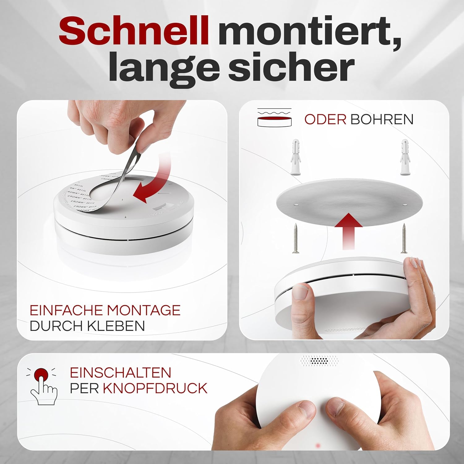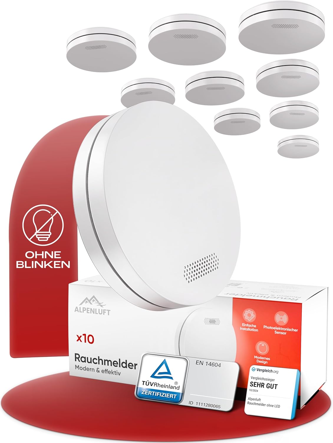 Izjemno tanek in sodobno zasnovan detektor dima ALPENLUFT zagotavlja zanesljivo požarno zaščito z dolgo življenjsko dobo baterije. Enostavna namestitev brez vrtanja in nevsiljiv dizajn omogočata diskretno varnost v vseh prostorih doma.