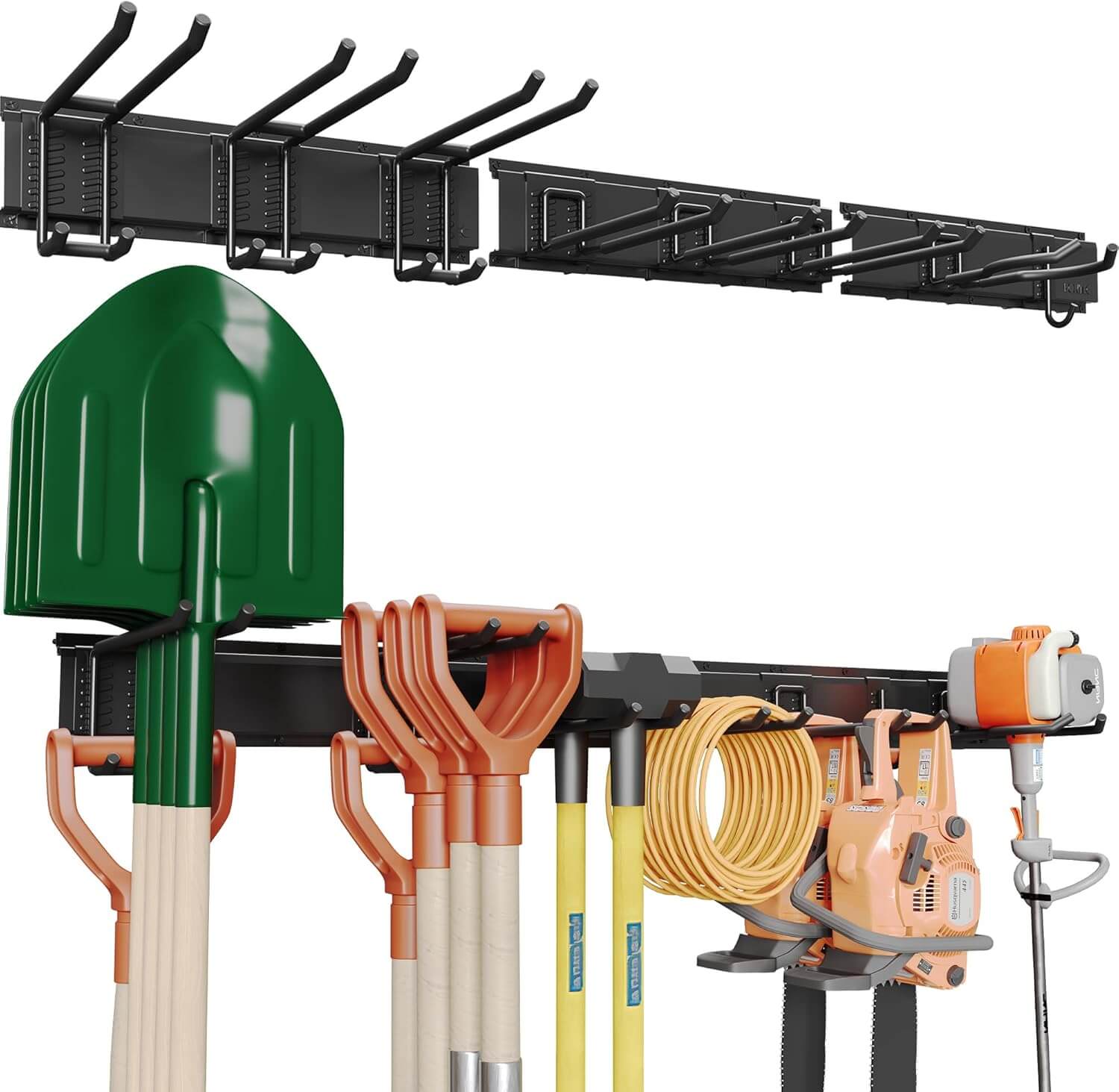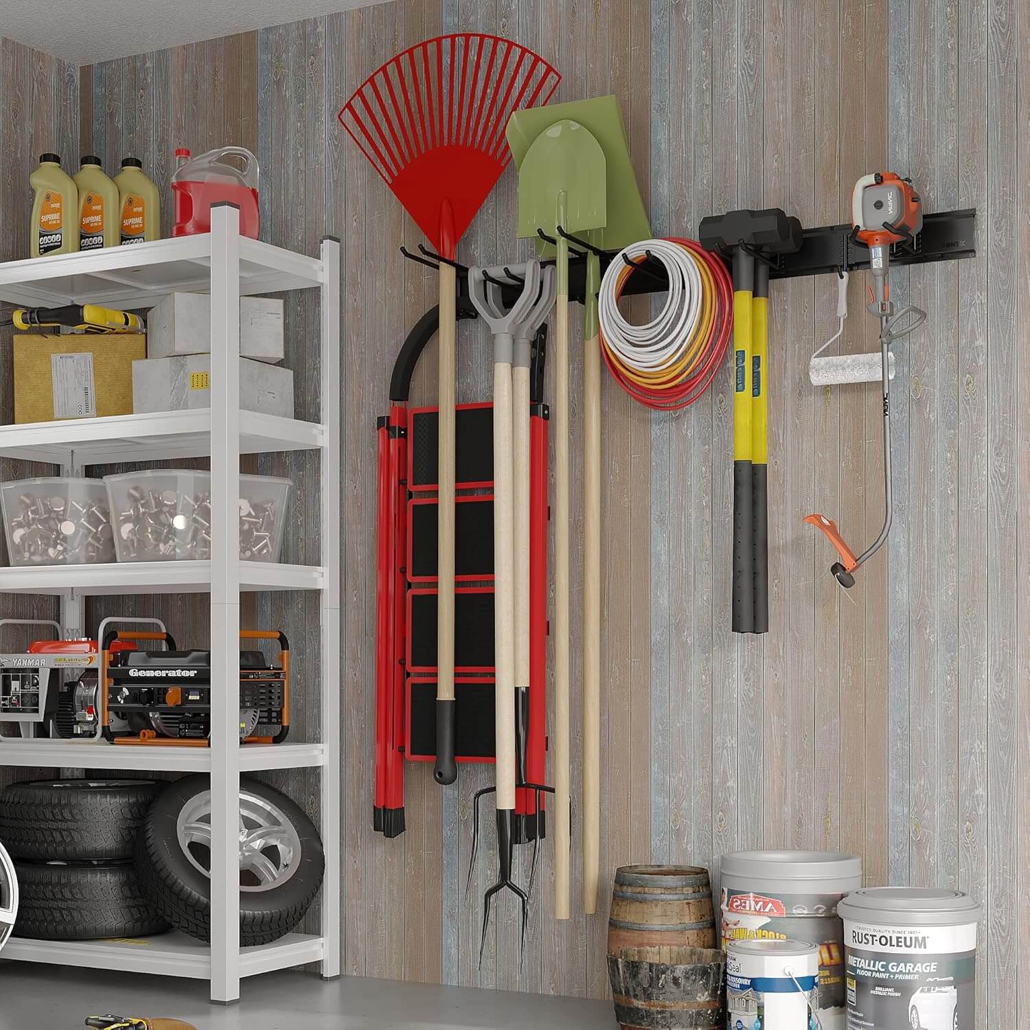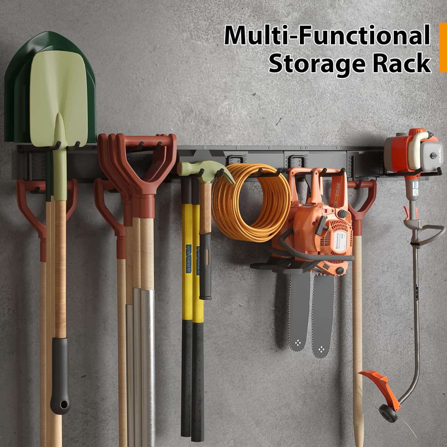 Izjemna nosilnost: stabilna konstrukcija omogoča shranjevanje tudi zelo težkega orodja, kot so električna orodja, lopate, motike, grablje, cevi in večji pripomočki.
