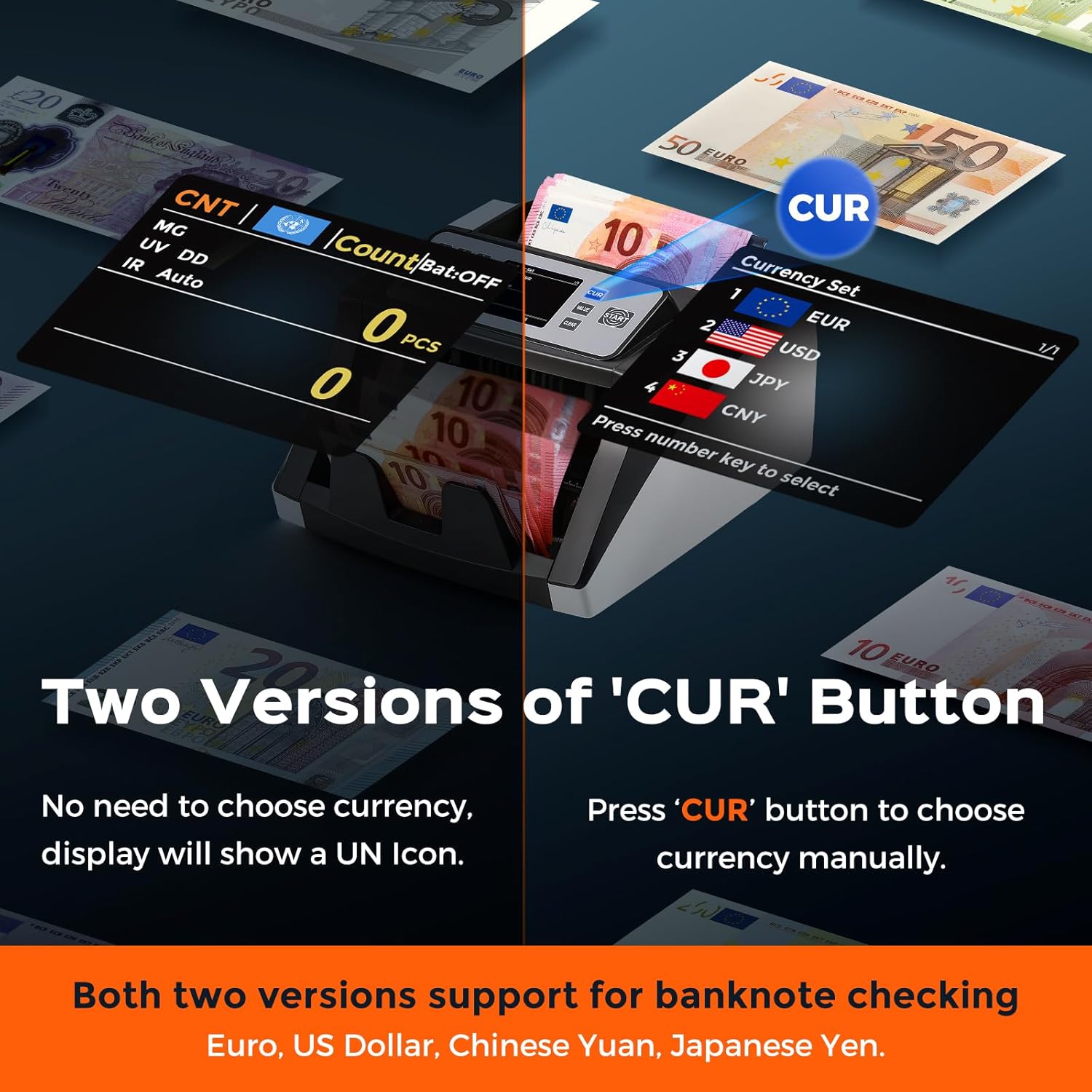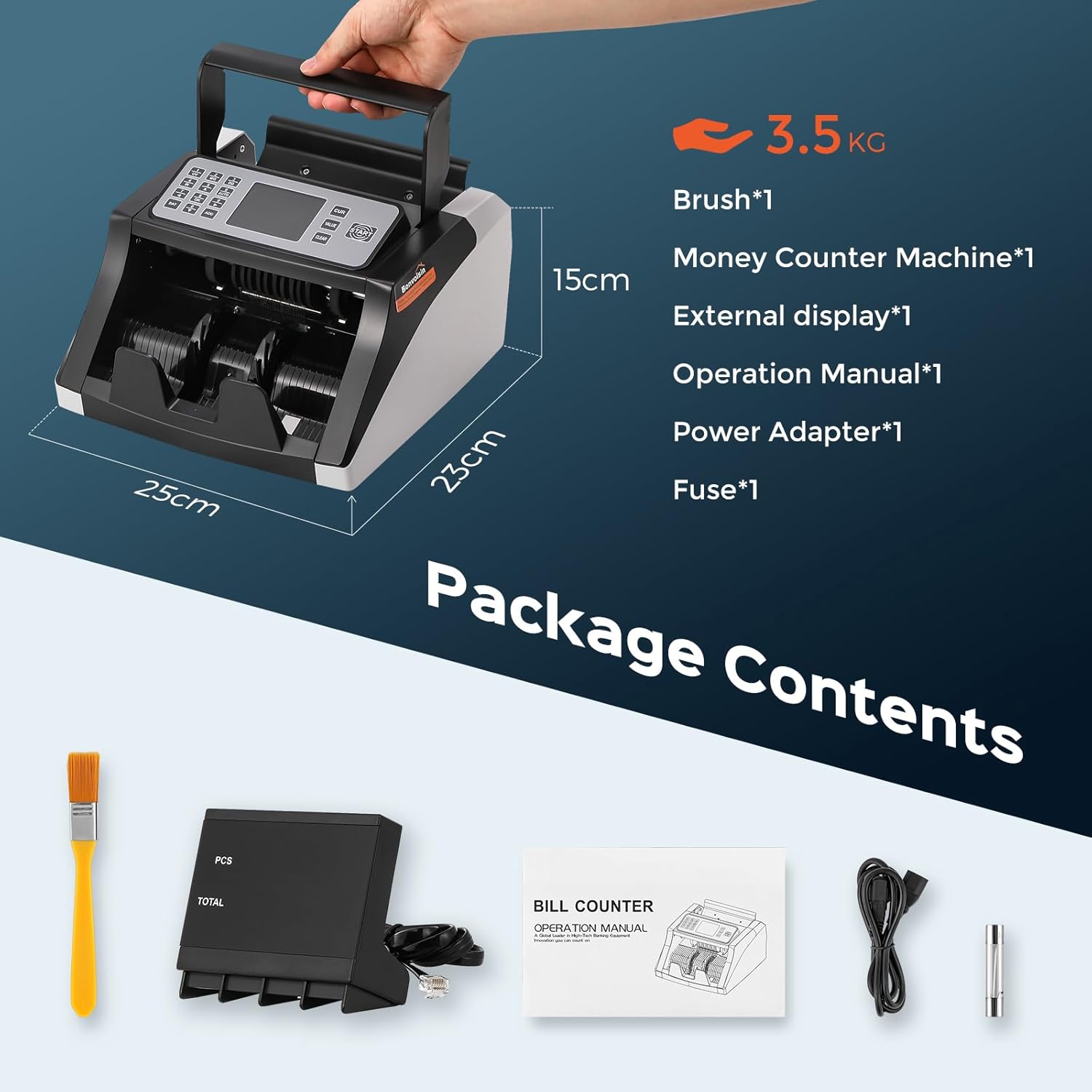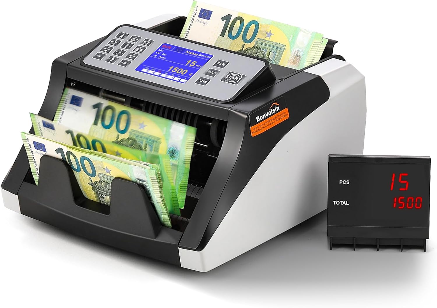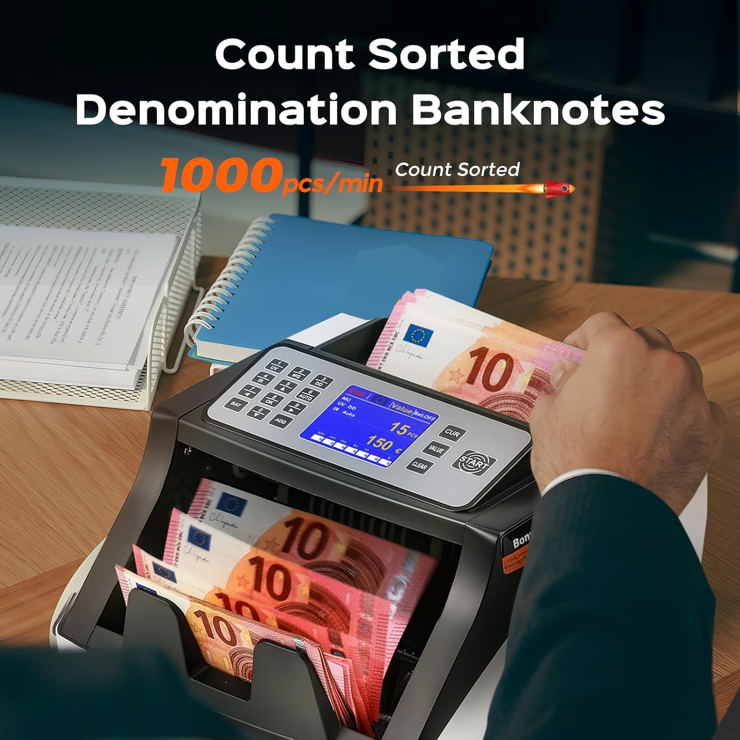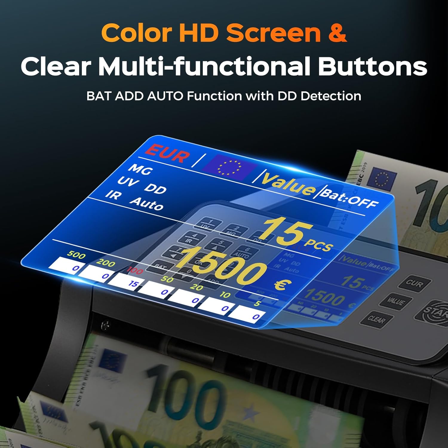 Profesionalni števec denarja omogoča hitro, natančno in varno štetje bankovcev z možnostjo izračuna vrednosti za enotno sortirane bankovce. Opremljen je z večstopenjskim sistemom preverjanja pristnosti (UV, MG, IR, DD) in barvnim zaslonom za jasen prikaz rezultatov. Idealen je za poslovno uporabo v bankah, trgovinah in pisarnah, kjer je hitrost in zanesljivost ključnega pomena.