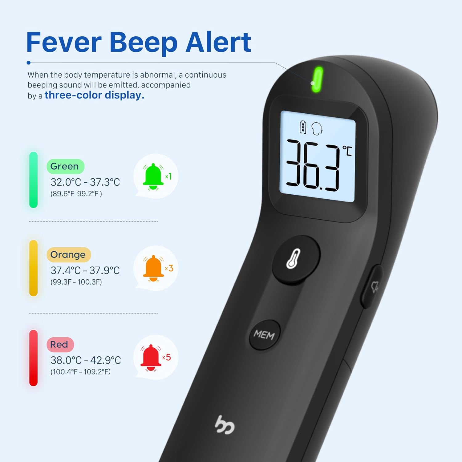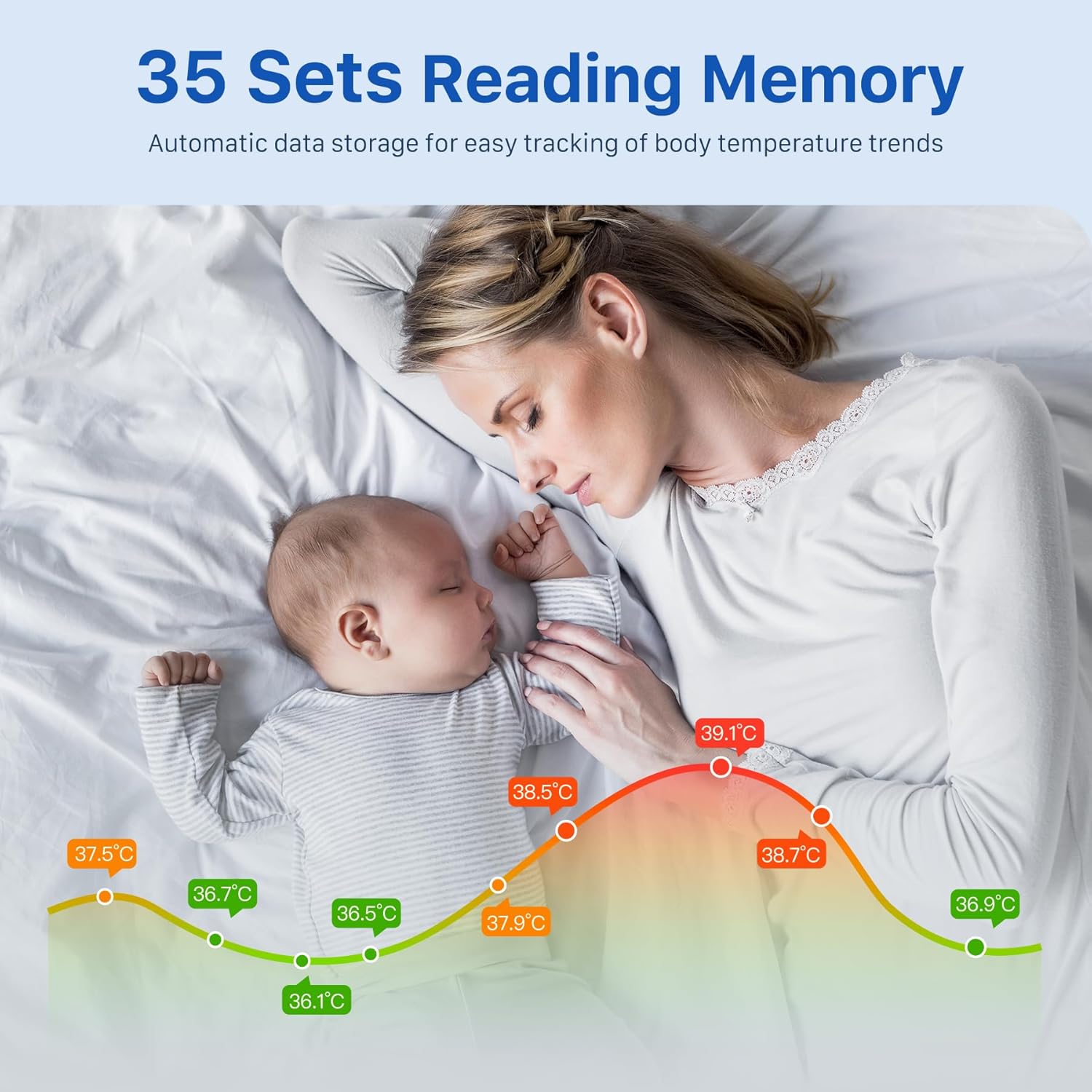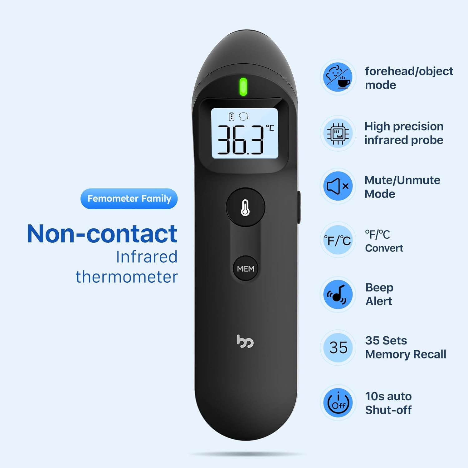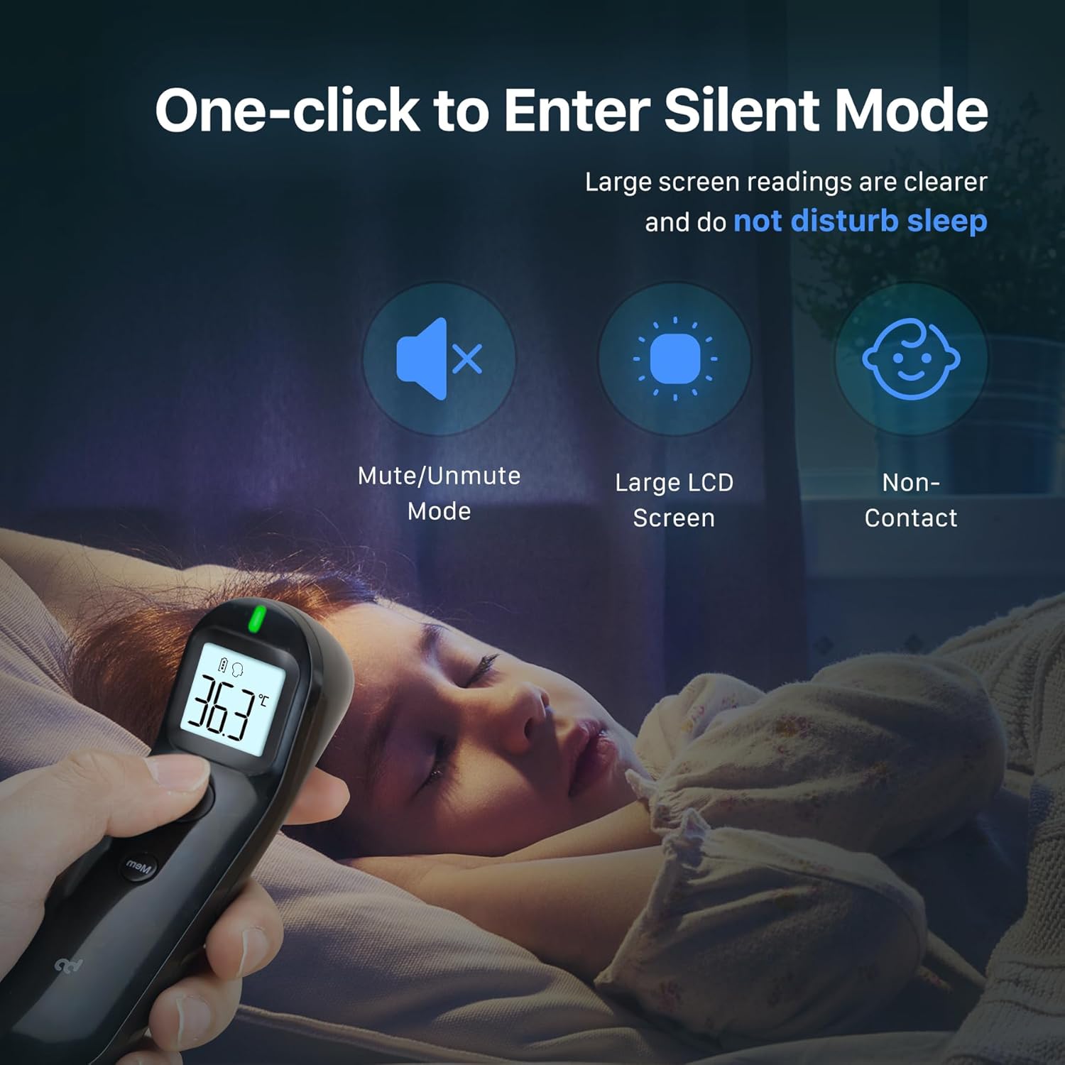 Digitalni infrardeči termometer omogoča hitro, tiho in zanesljivo merjenje telesne temperature brez dotika. Opremljen je z barvnim zaslonom in svetlobnim senzorjem za optimalno razdaljo in natančne rezultate. Zaradi tihega načina je idealen za uporabo pri dojenčkih, otrocih in odraslih, tudi med spanjem.