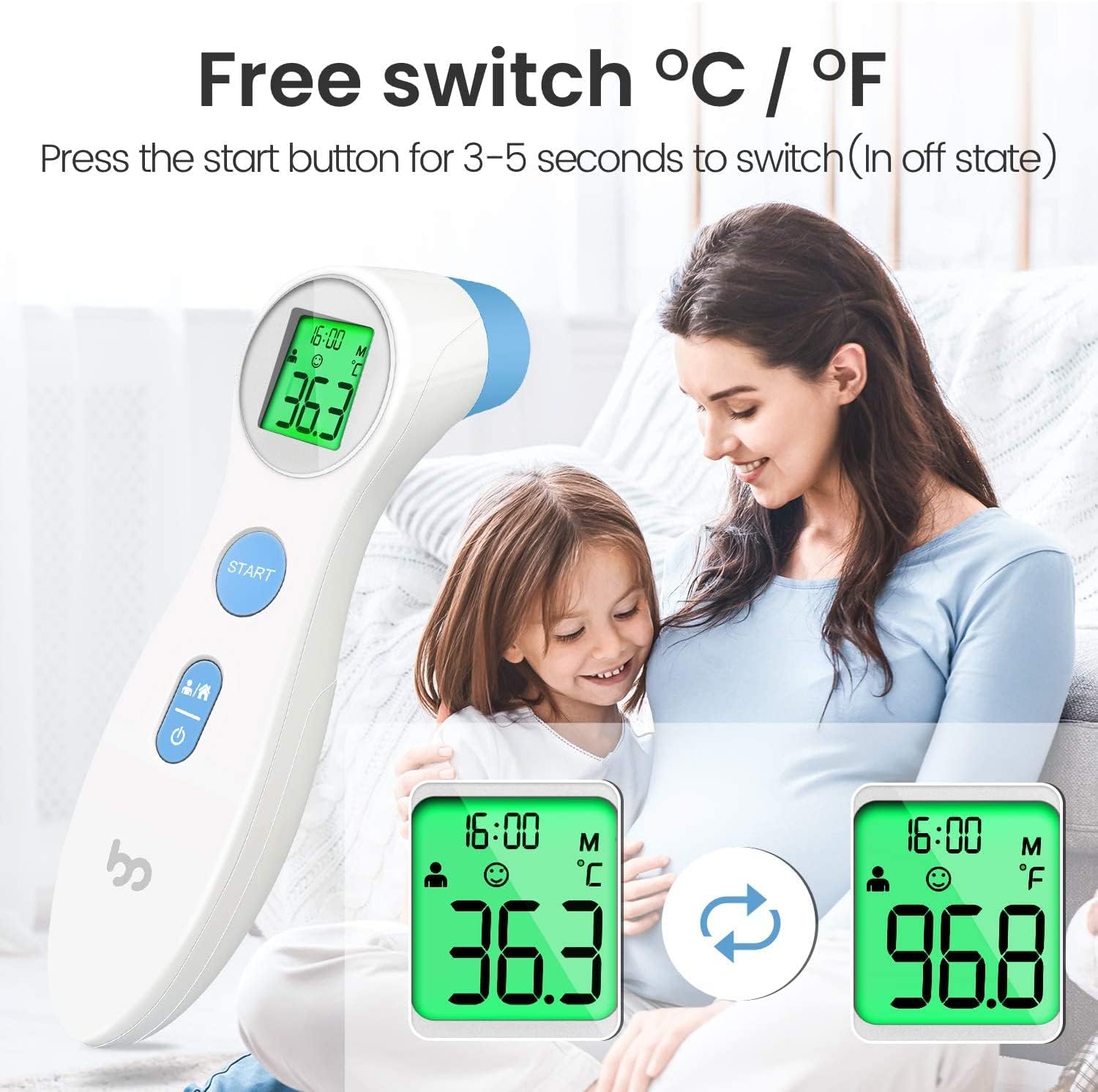Infrardeči brezkontaktni termometer natančno meri telesno temperaturo brez dotika, kar omogoča varno uporabo pri odraslih in otrocih. Z velikim LCD zaslonom in barvnimi opozorili za vročino omogoča hitro in jasno odčitavanje. Primeren je tudi za merjenje temperature predmetov in prostora ter shranjuje do 10 meritev.