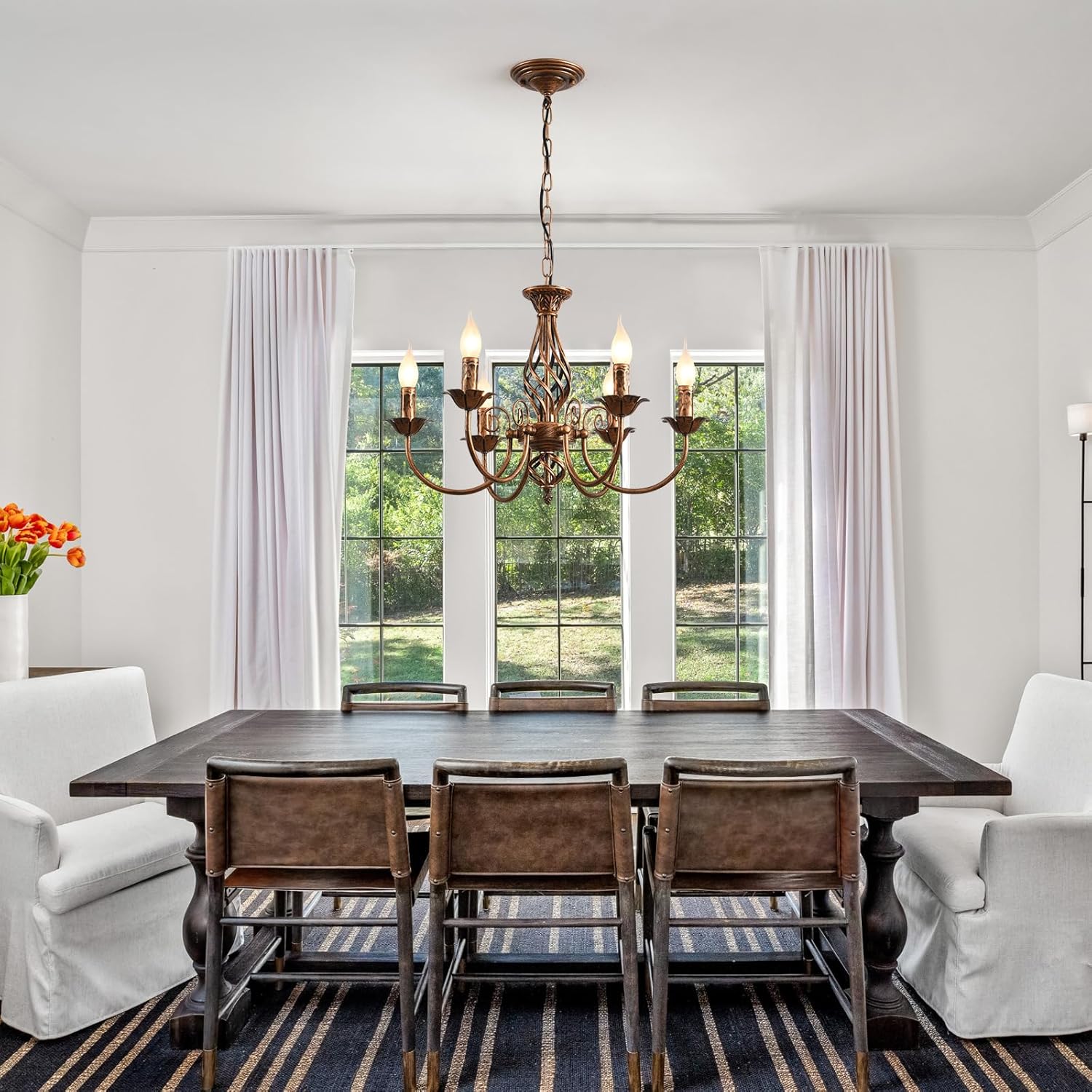 Elegantni lestenec v rustikalnem slogu prinaša toplino in značaj v vsak prostor. Kovana konstrukcija s klasičnimi ukrivljenimi rokami ustvarja tradicionalen videz. Višina svetila je prilagodljiva za različno visoke stropove.