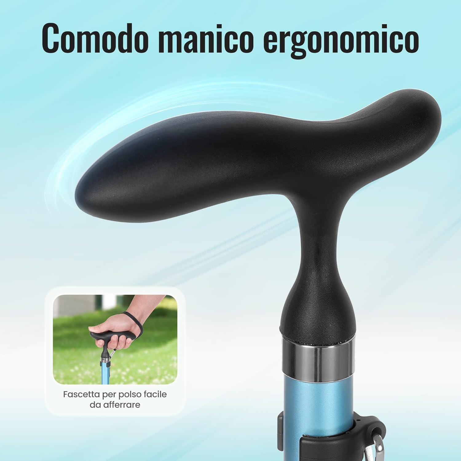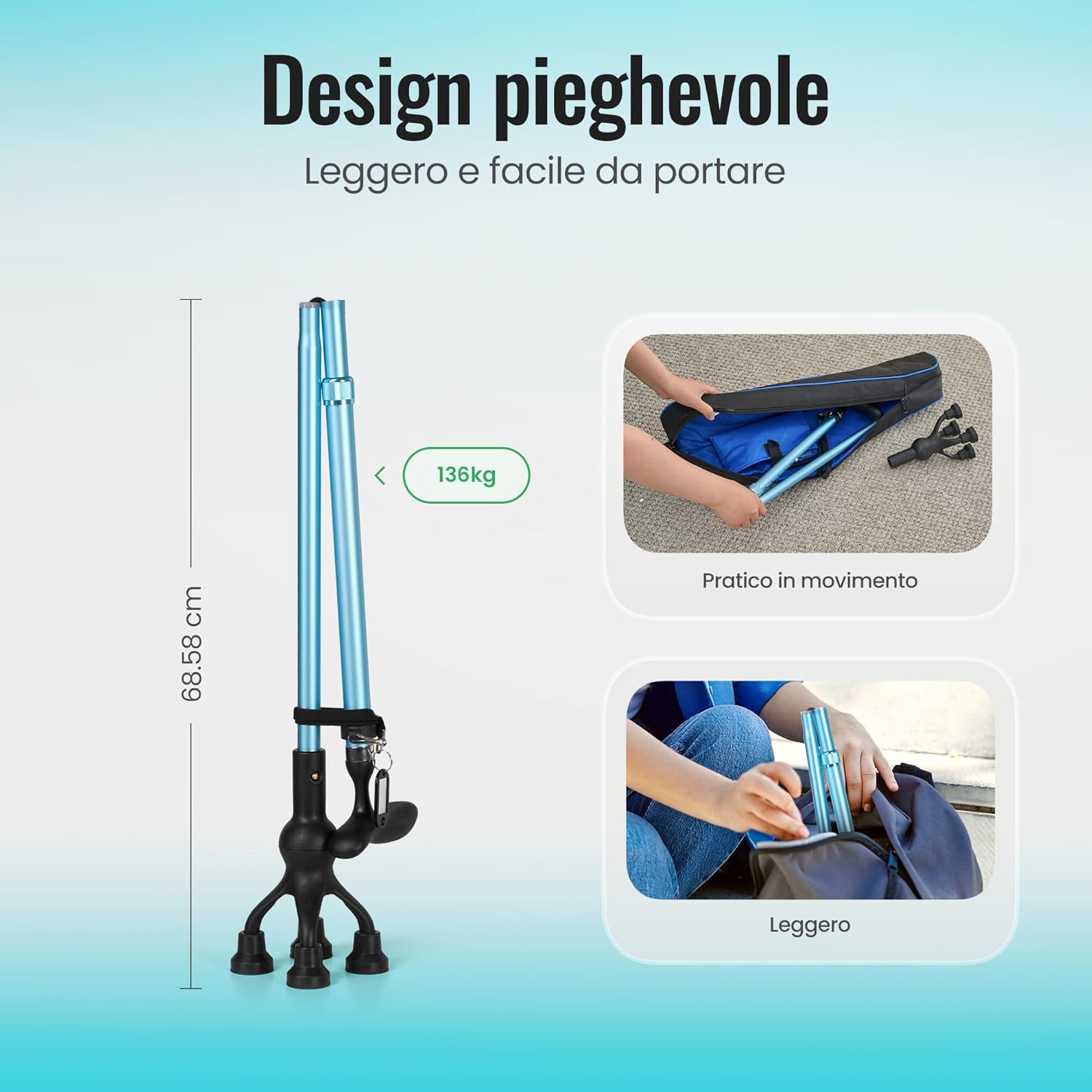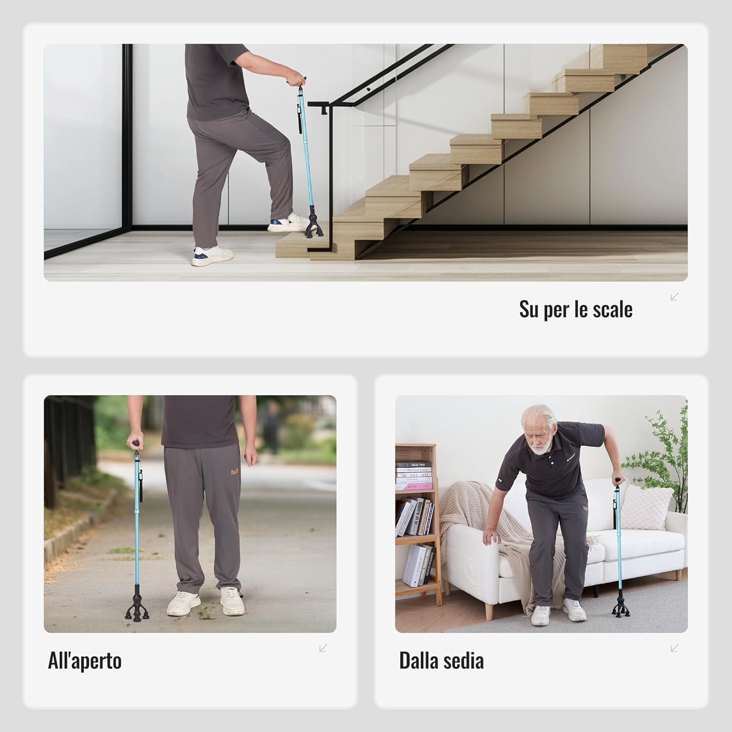 Lahka in stabilna sprehajalna palica iz aluminija nudi zanesljivo oporo pri hoji za starejše osebe in odrasle z zmanjšano gibljivostjo. Zložljiva konstrukcija, nastavljiva višina in štirizobi stabilizacijski podstavek zagotavljajo udobno, varno in praktično uporabo v vsakodnevnem življenju ali na poti.