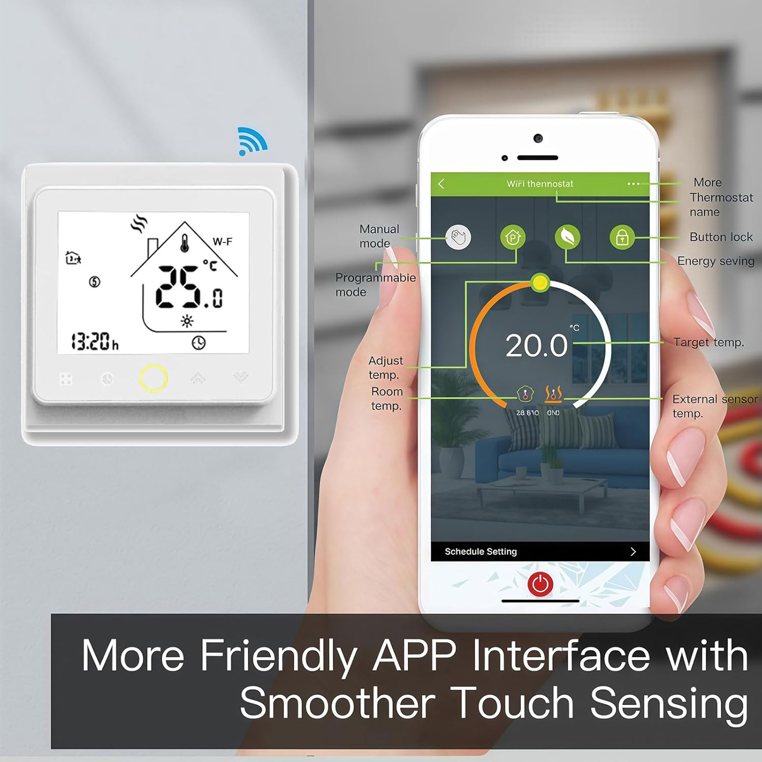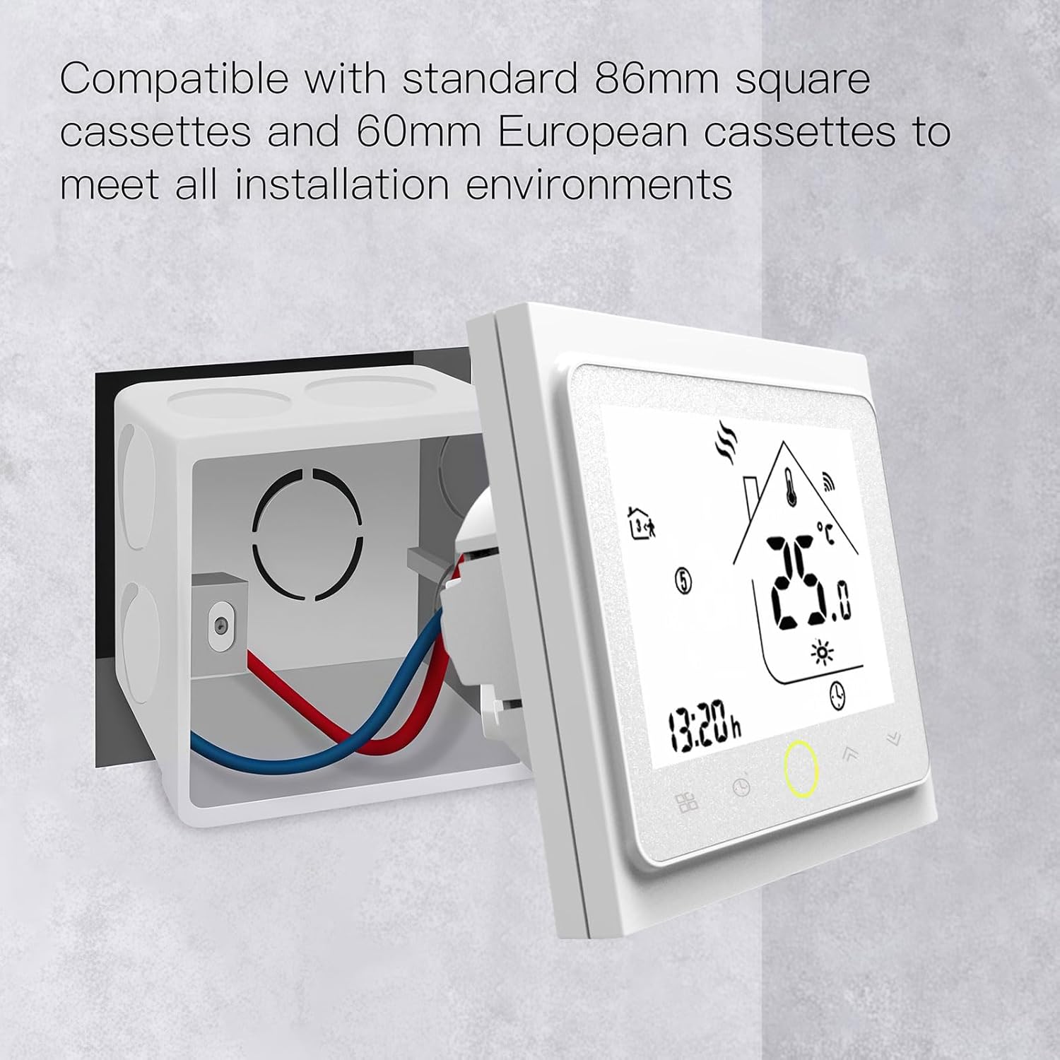 Pametni termostat CASLANT 002 serije je sodobna rešitev za natančno in udobno upravljanje ogrevalnih sistemov, električnega talnega gretja ter klimatskih naprav (2-cevni ali 4-cevni fan-coil sistemi). Z uporabo WiFi povezave (Tuya protokol), elegantnega touch zaslona in upravljanja na daljavo preko pametnega telefona zagotavlja visoko raven udobja, energetsko učinkovitost in popolno integracijo v pametni dom.