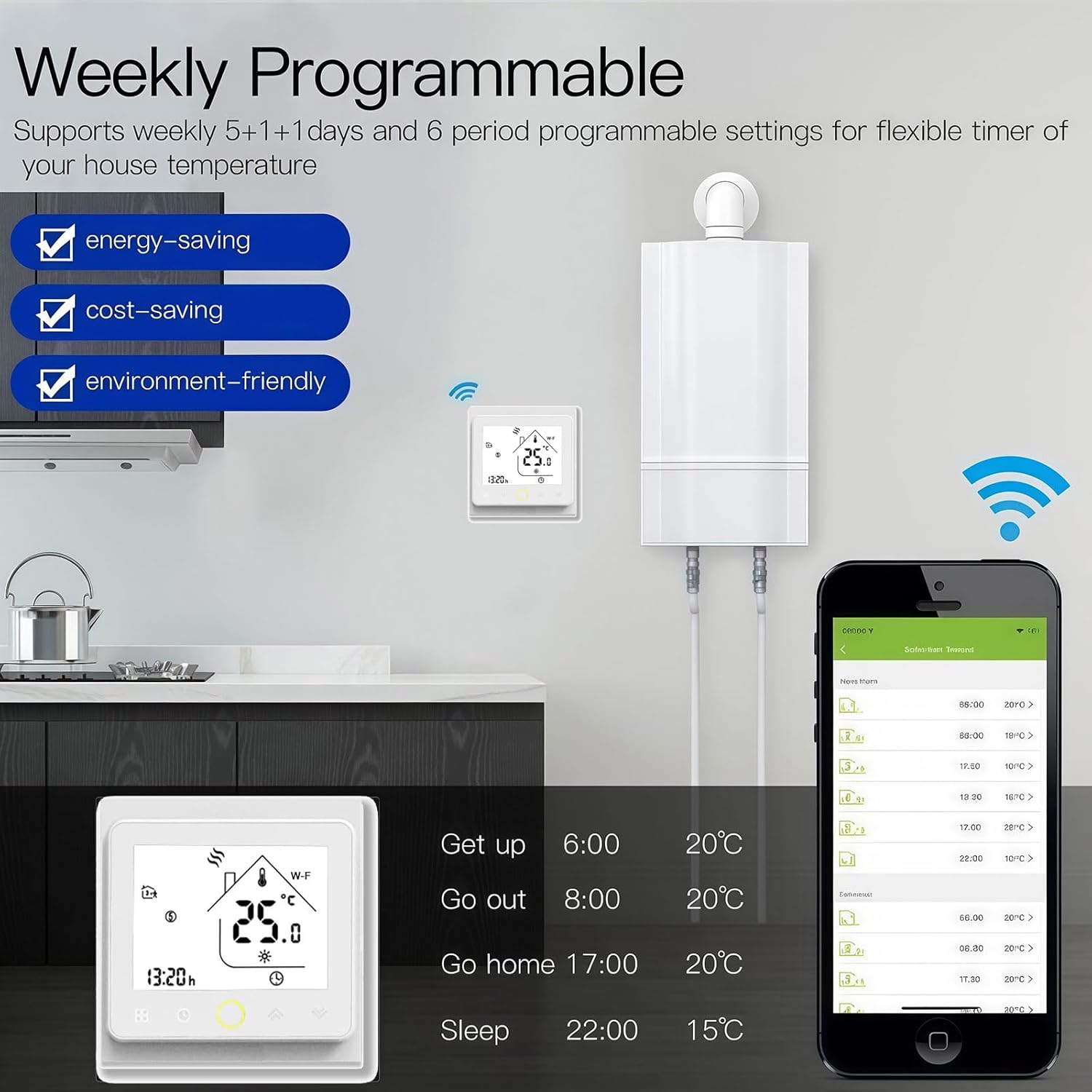 Omogoča samodejne ali ročne tedenske programe (5 + 1 + 1) z do 6 časovnimi intervali na dan. To pripomore k nižji porabi energije, manjšim stroškom in bolj trajnostni rabi.