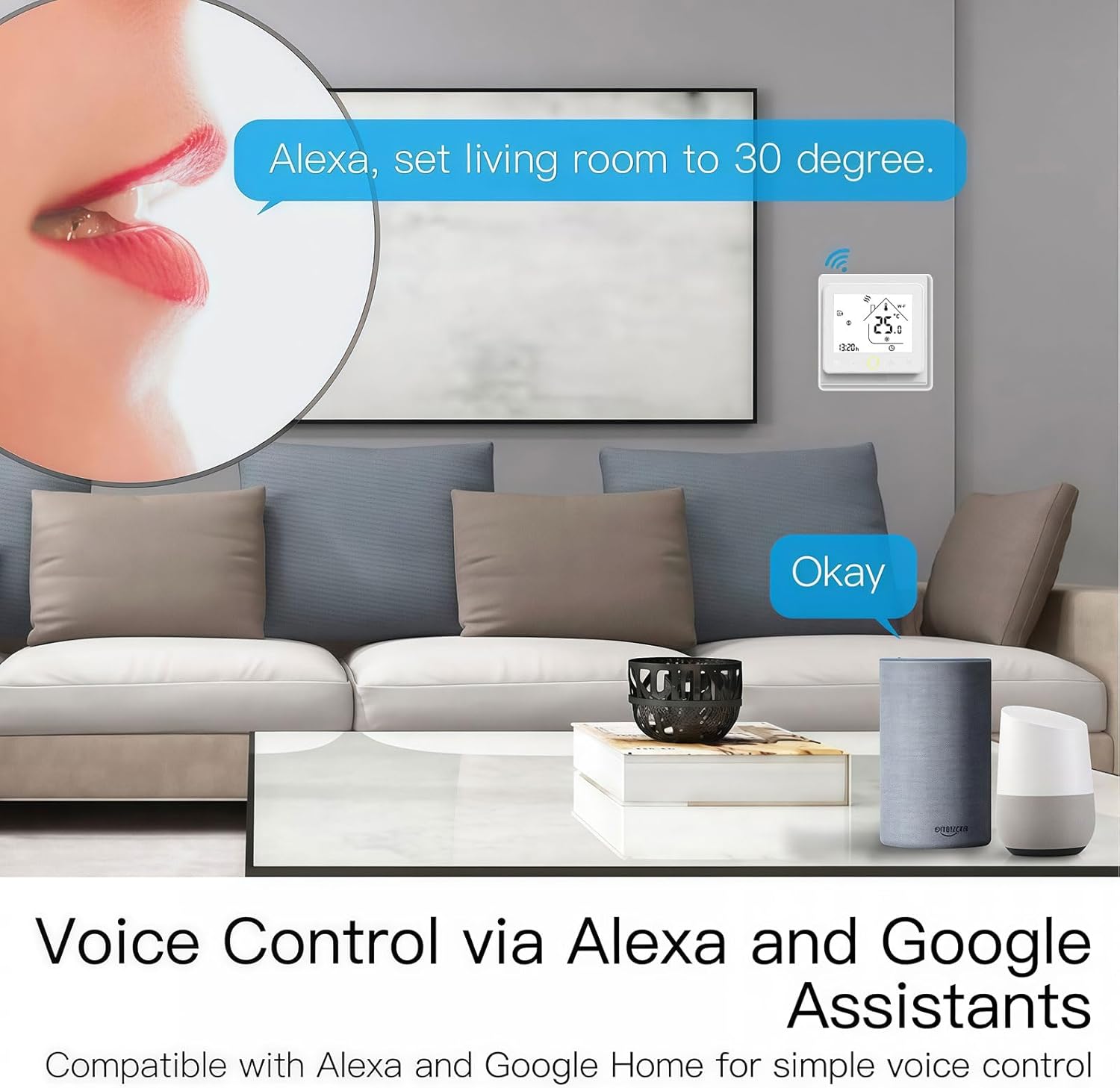 Termostat se brez težav poveže z Alexa in Google Home, kar omogoča glasovno upravljanje temperature. Vgrajena zaščita ob izpadu elektrike poveča zanesljivost delovanja.