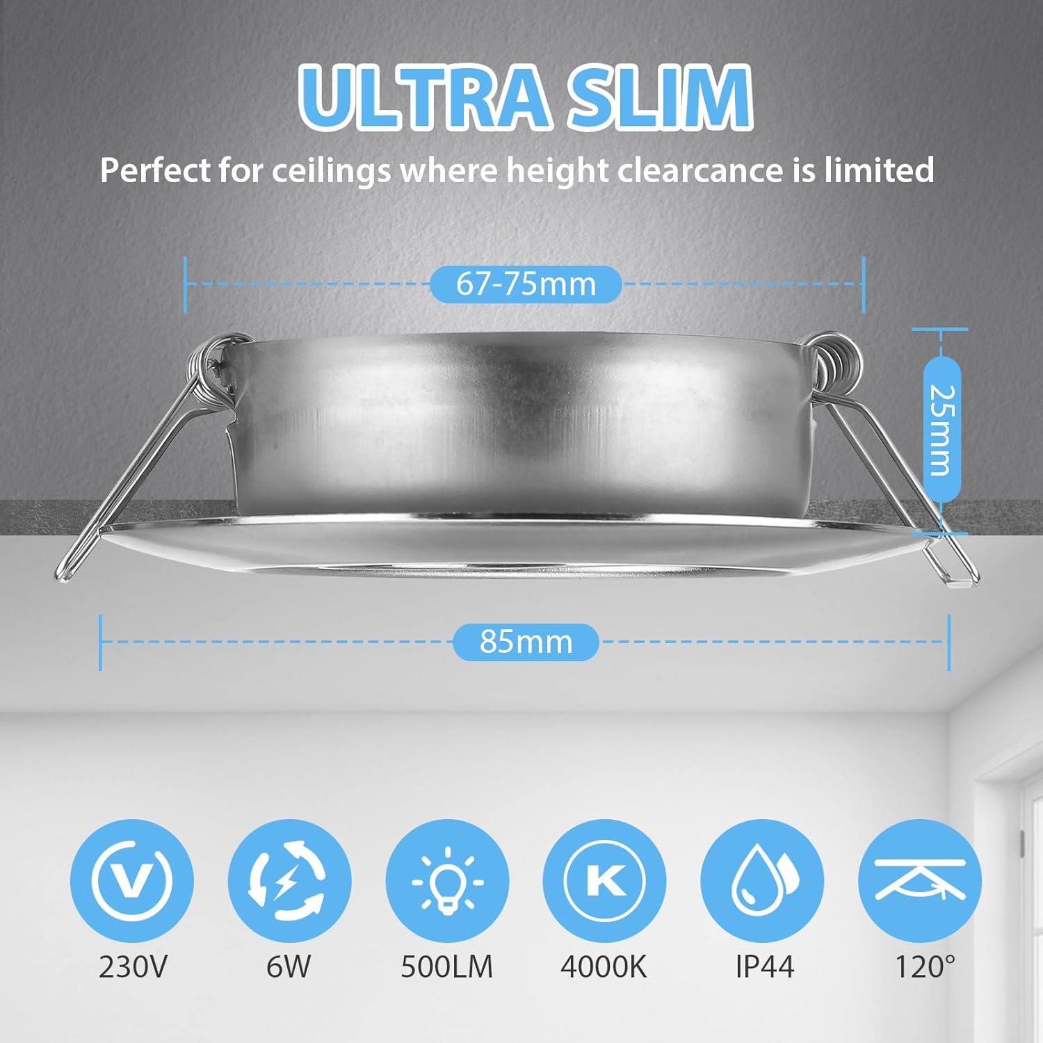 Vgradni LED stropni reflektorji cloksh so zasnovani za sodobno in energetsko učinkovito osvetlitev notranjih prostorov. Ultra ploska zasnova omogoča enostavno vgradnjo tudi pri omejeni globini stropa, vrtljiv mehanizem pa zagotavlja prilagodljivo usmerjanje svetlobe. Zaradi zaščite IP44 so primerni tudi za vlažne prostore, kot so kopalnice in kuhinje.