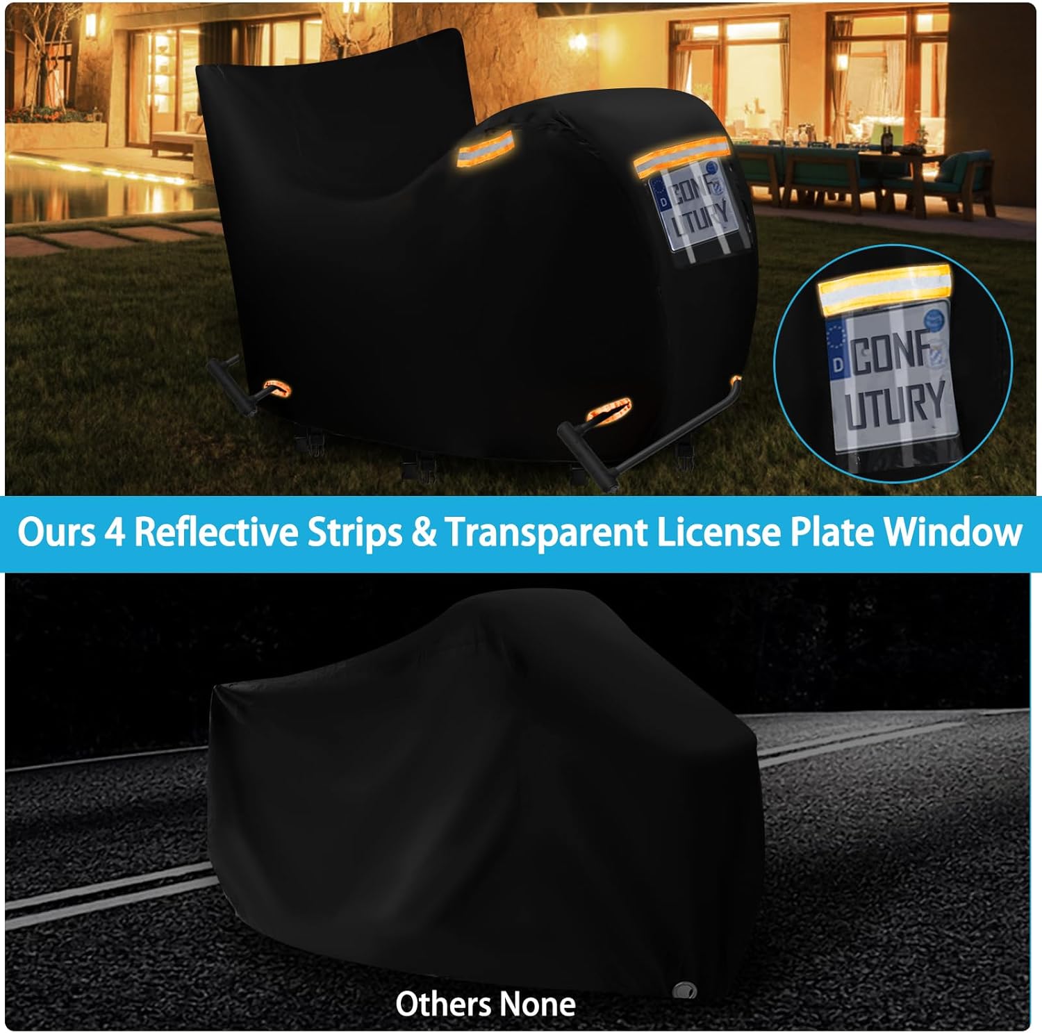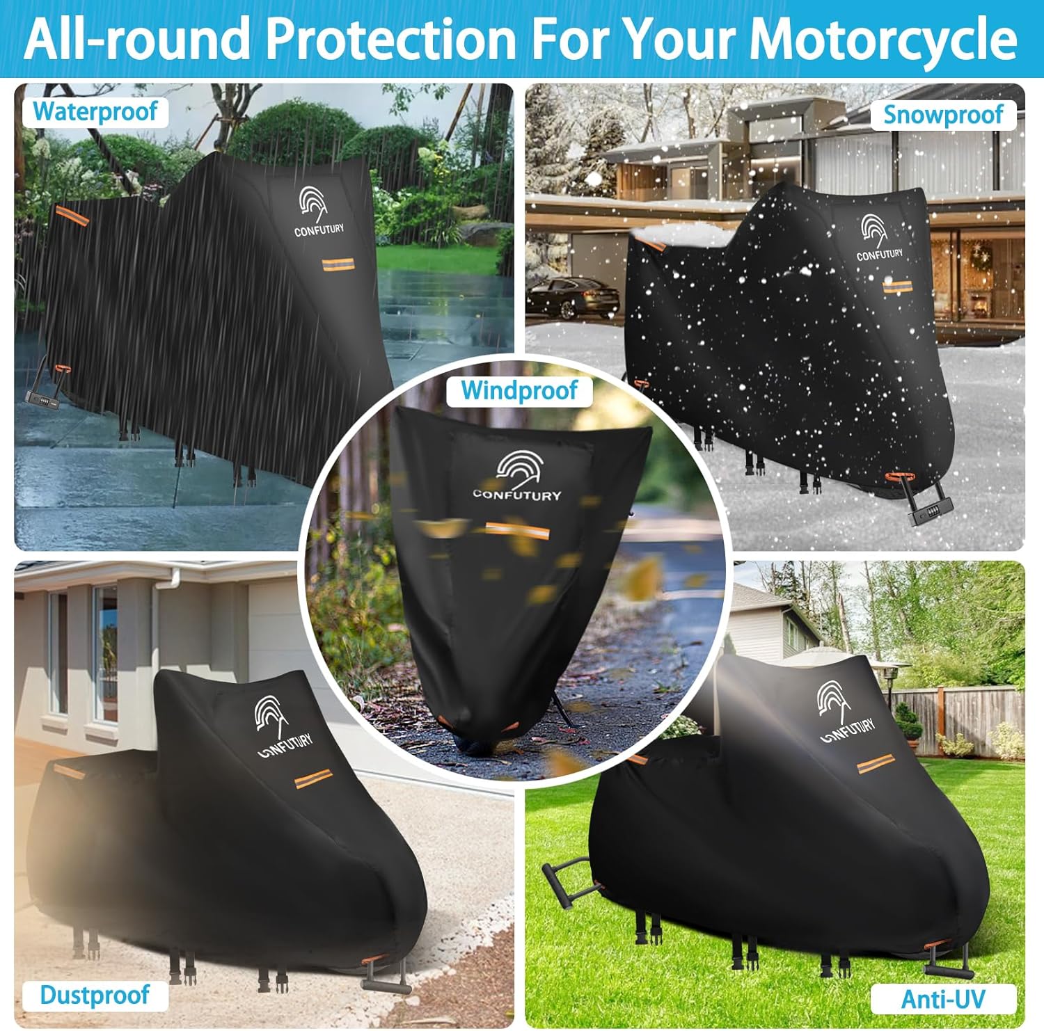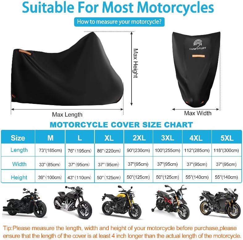 CONFUTURY motorna prevleka iz trpežne 600D nano Oxford tkanine zagotavlja popolno zaščito motocikla pred dežjem, UV žarki, prahom, praskami in ptičjimi iztrebki. Notranja nano prevleka in ojačani šivi s tesnilnimi trakovi preprečujejo vdor vode, medtem ko odsevni elementi in prozorno okence za registrsko tablico povečujejo varnost in preglednost. Namenjena je za motorna kolesa in skuterje različnih velikosti.