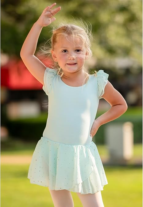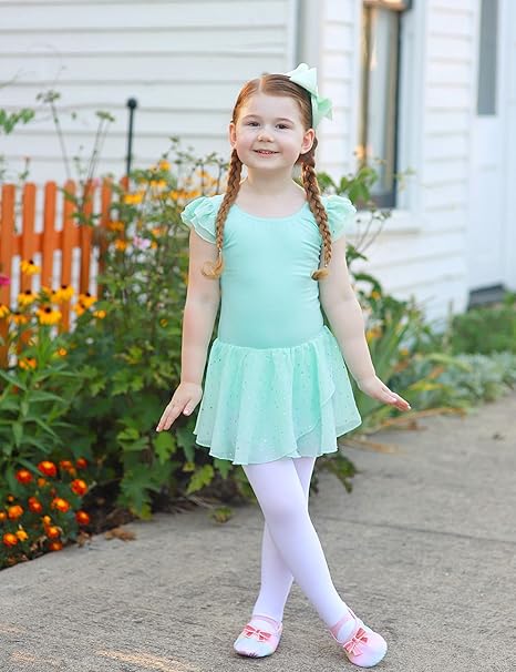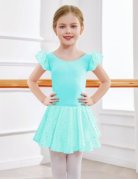 Arshiner baletna obleka za deklice z volančastimi rokavi, dvoslojnim šifonskim krilom in sijočimi detajli je popolna izbira za plesne nastope, vadbo ali posebne priložnosti.