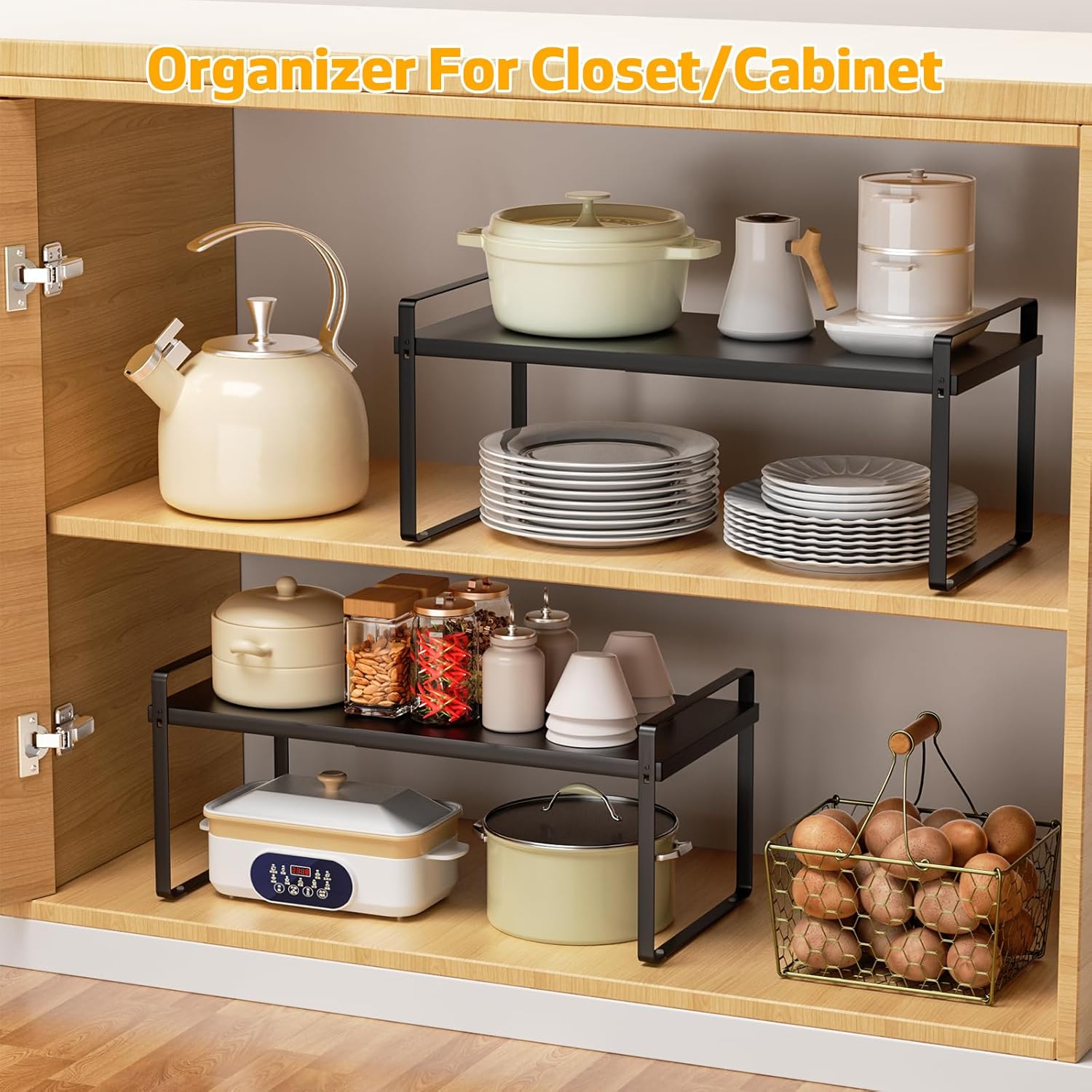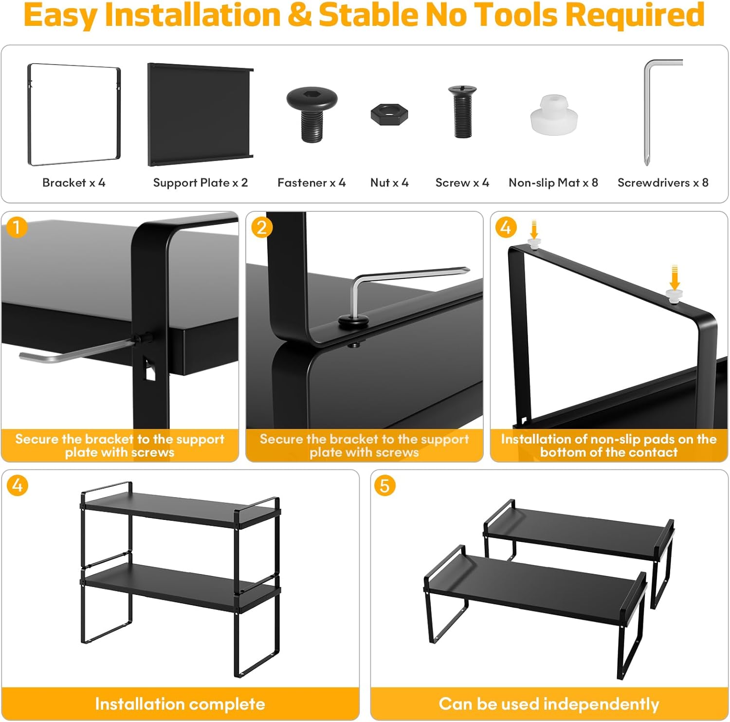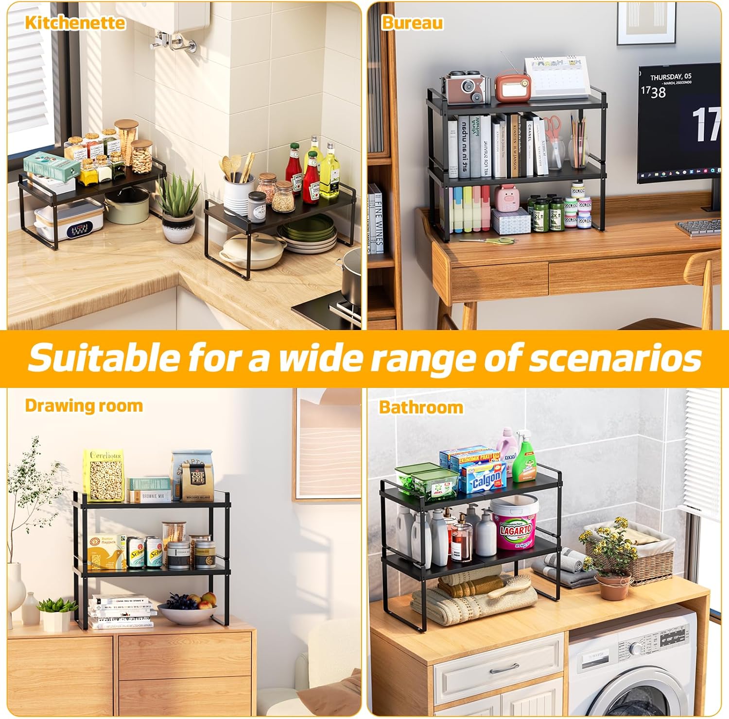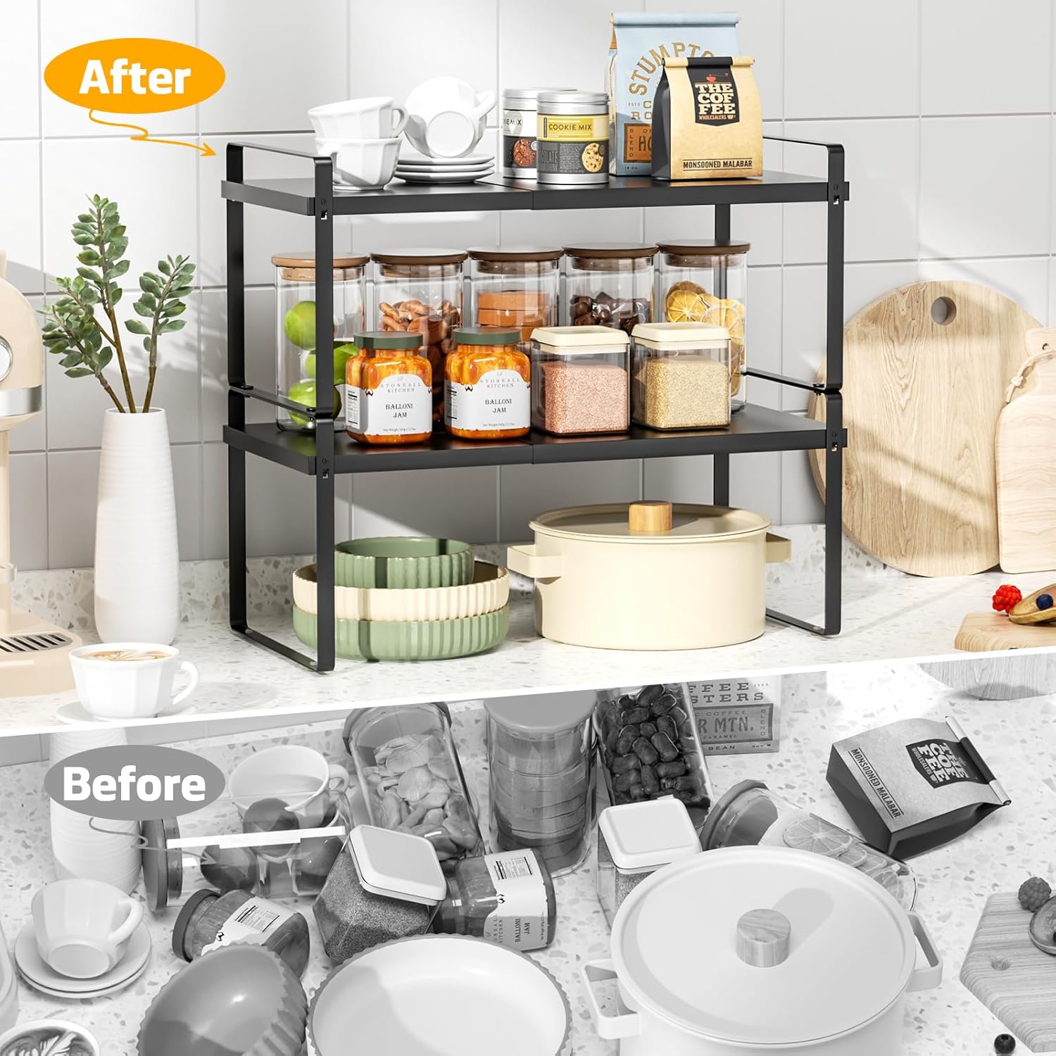 Komplet raztegljivih polic je praktična rešitev za več prostora v kuhinji, kopalnici ali omarah. Kovinske police z možnostjo raztegovanja in zlaganja omogočajo prilagoditev različnim dimenzijam omaric ter ustvarjajo dodatno površino za shranjevanje začimb, posod, steklenic in drugih kuhinjskih pripomočkov. Prašno barvana črna površina zagotavlja eleganten videz in odpornost proti rji.