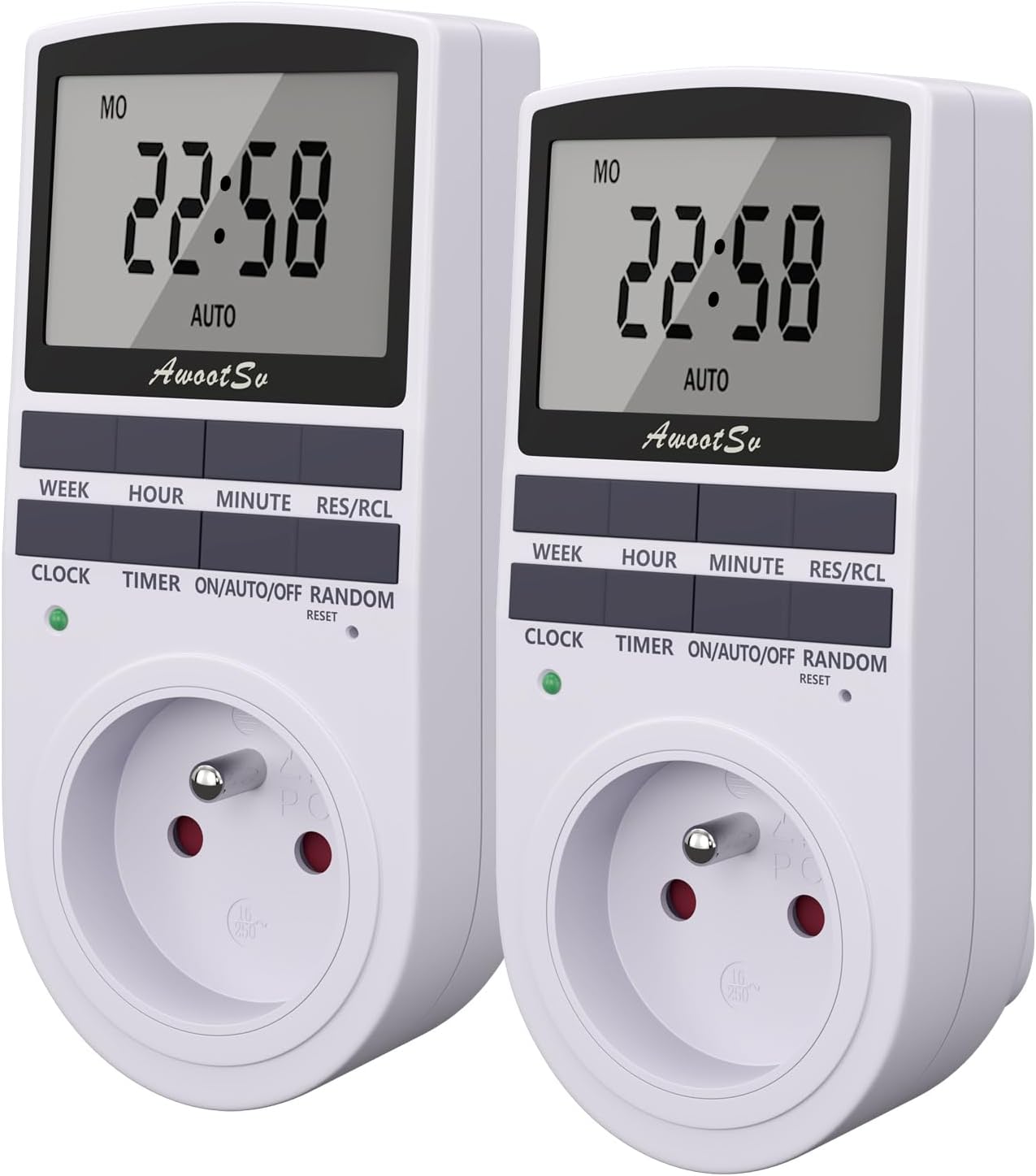 Digitalni časovni vtičnici omogočata natančno dnevno ali tedensko programiranje vklopov in izklopov naprav. LCD zaslon omogoča jasen prikaz nastavitev in tiho delovanje brez motečega klikanja. Vgrajen naključni način simulira prisotnost v prostoru in odganja nepridiprave.