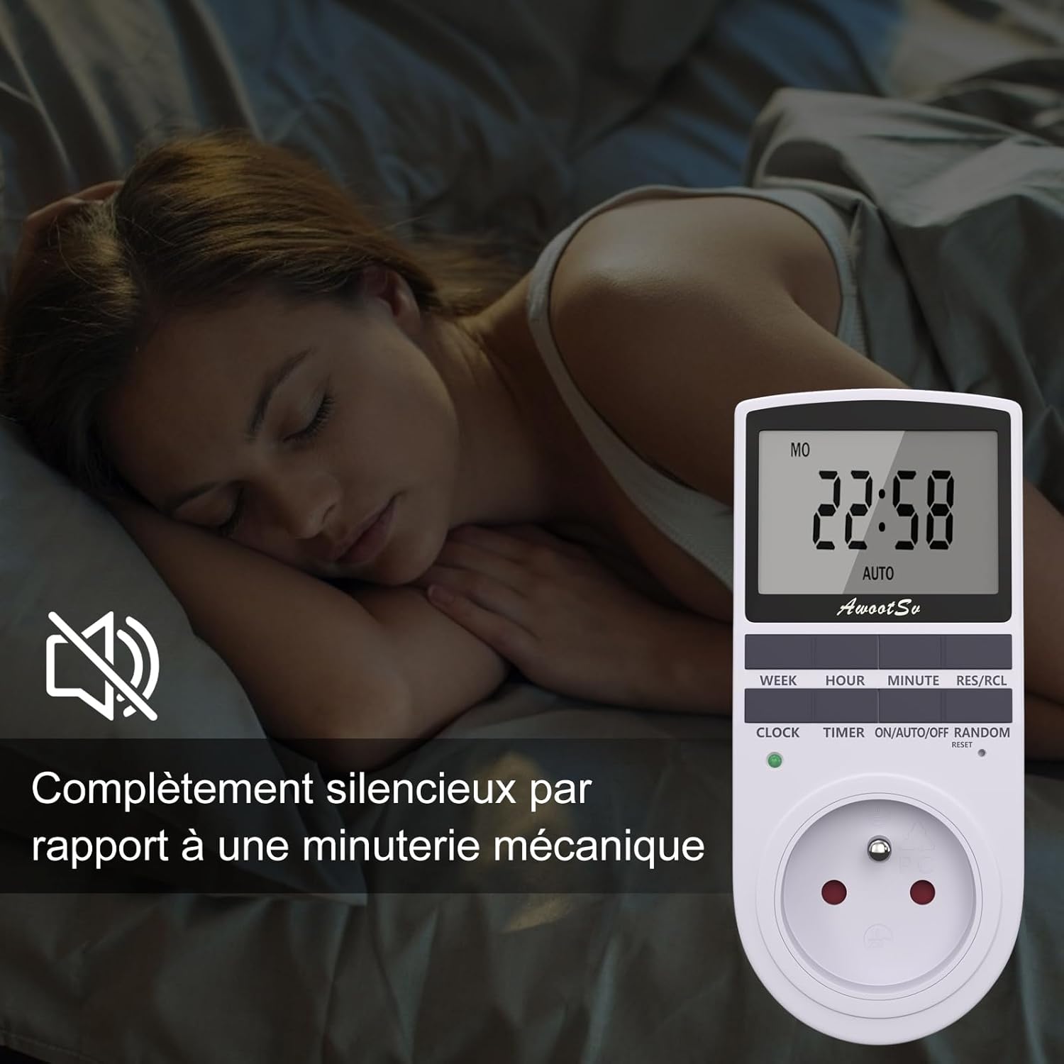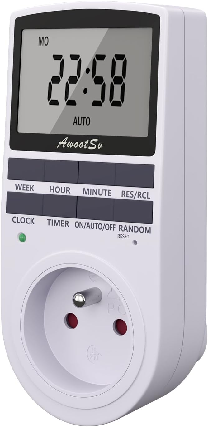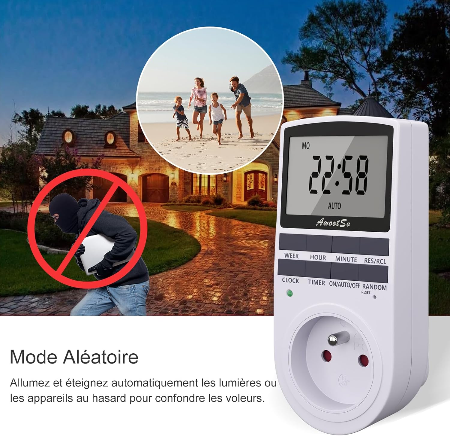 Digitalni časovni vtičnici omogočata natančno dnevno ali tedensko programiranje vklopov in izklopov naprav. LCD zaslon omogoča jasen prikaz nastavitev in tiho delovanje brez motečega klikanja. Vgrajen naključni način simulira prisotnost v prostoru in odganja nepridiprave.