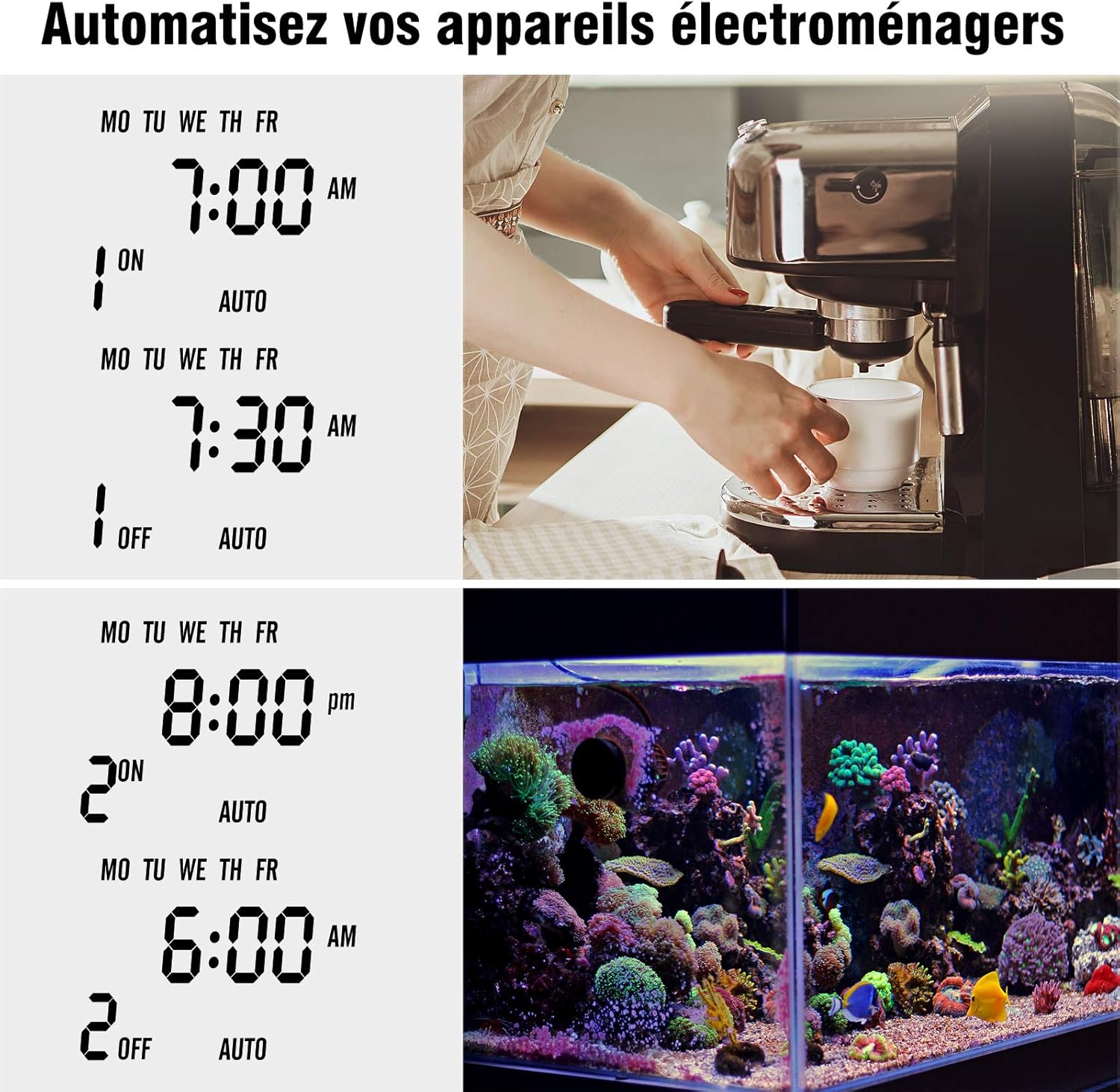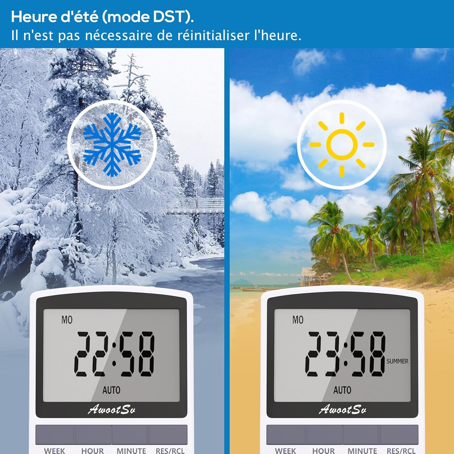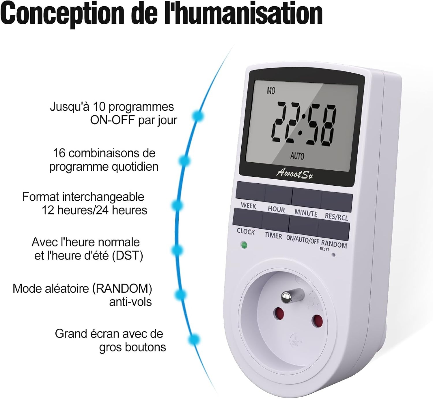 Digitalni časovni vtičnici omogočata natančno dnevno ali tedensko programiranje vklopov in izklopov naprav. LCD zaslon omogoča jasen prikaz nastavitev in tiho delovanje brez motečega klikanja. Vgrajen naključni način simulira prisotnost v prostoru in odganja nepridiprave.
