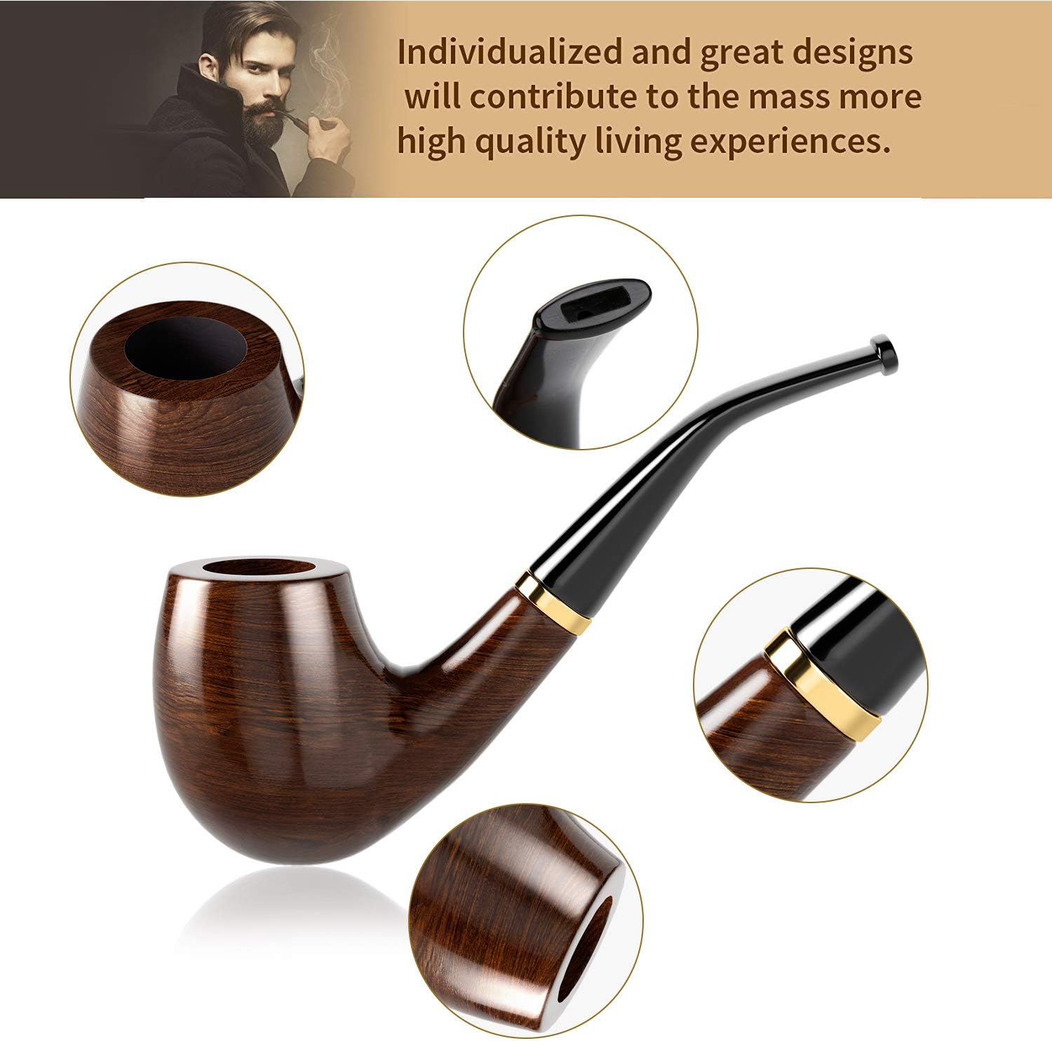 Estetski detajl: zlat obroč med leseno glavo in akrilnim ustnikom poudari eleganten videz in daje pipi klasičen značaj.