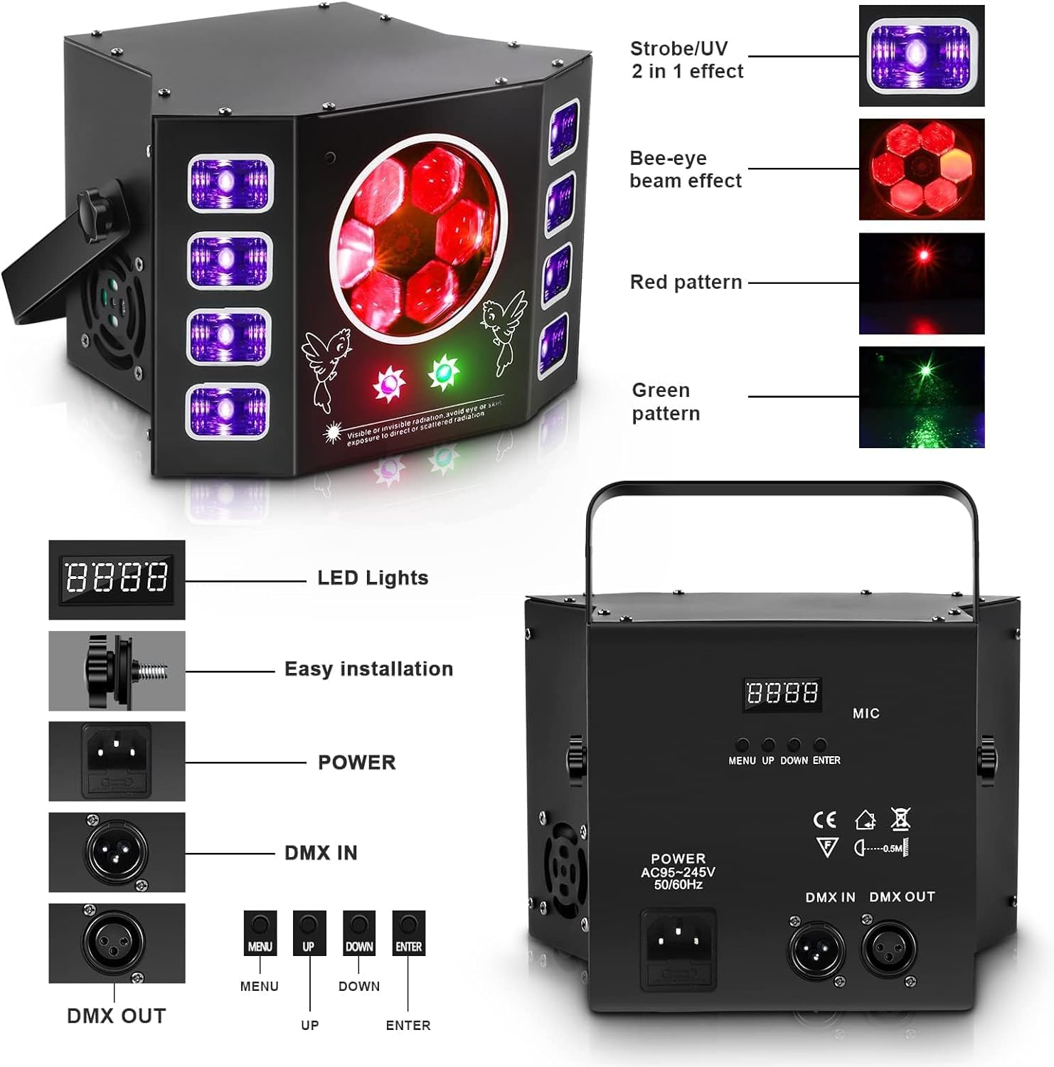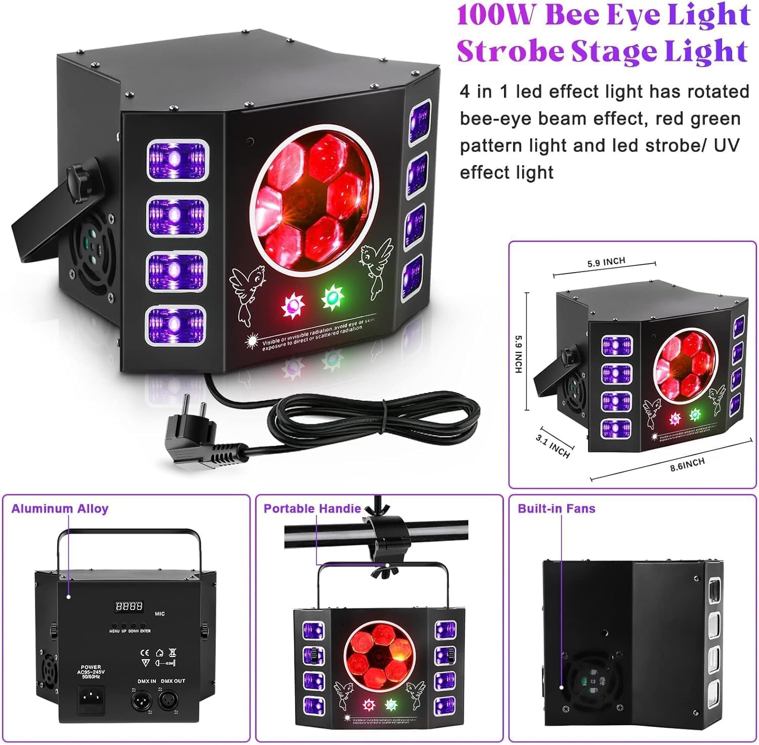 Profesionalna disco svetilka z močjo 100 W združuje več svetlobnih učinkov v eni napravi. Ponuja rotacijski »bee’s eye« snop, UV stroboskop, laserske učinke in RGB LED osvetlitev. Naprava je zasnovana za raznolike dogodke, kot so zabave, poroke, klubi ali domača uporaba.