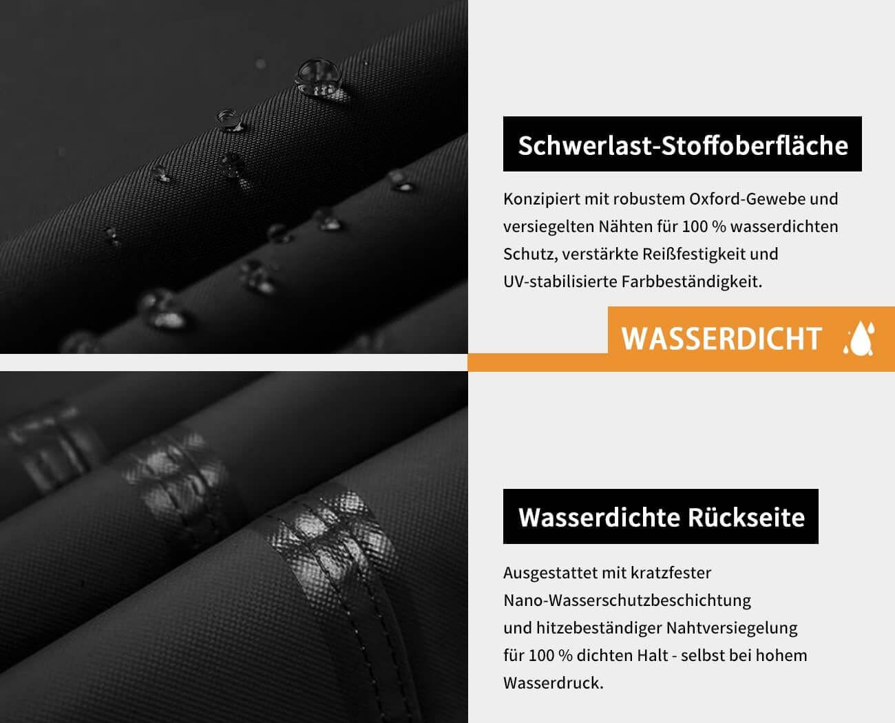 Popolnoma vodoodporna: izdelana iz težke Oxford tkanine z visoko temperaturno zatesnjenimi šivi, ki preprečujejo zamakanje tudi ob dolgotrajnem stiku z vodo. Vaše pohištvo ostane suho v vseh vremenskih pogojih.