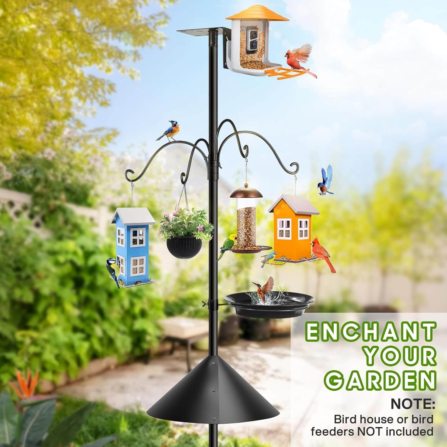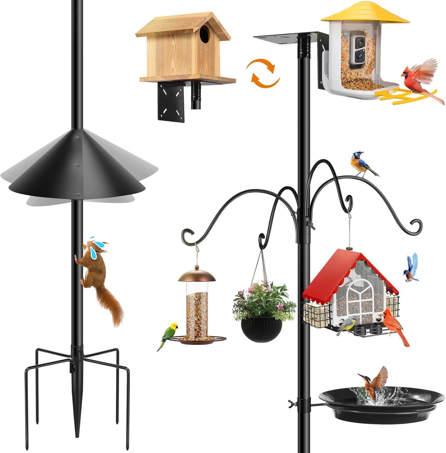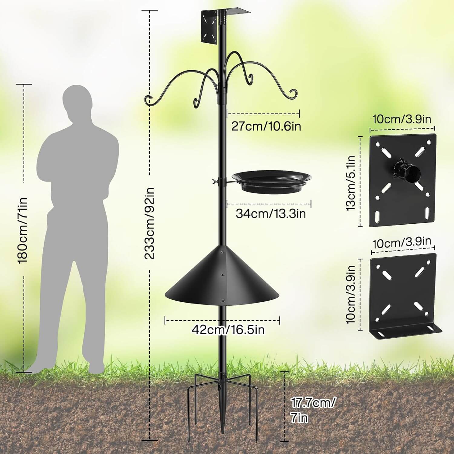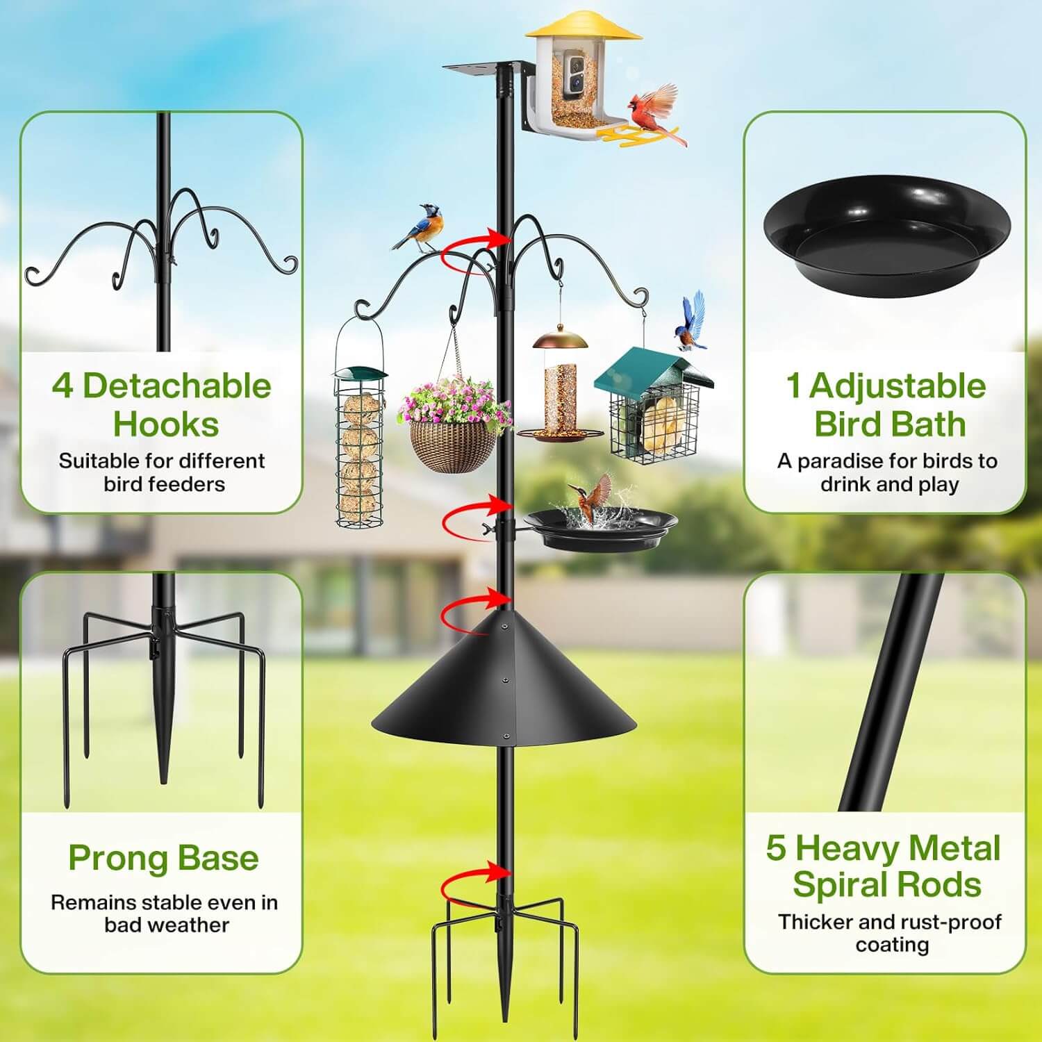 Robustno 234 cm visoko kovinsko stojalo z 5-krako talno konico ponuja izjemno stabilno in prilagodljivo postajo za hranjenje ptic. S kovinsko konstrukcijo, zaščito proti vevericam in več obešalnimi kavlji je popolna izbira za vrt, teraso ali dvorišče. Opomba: krmilnica ni priložena.