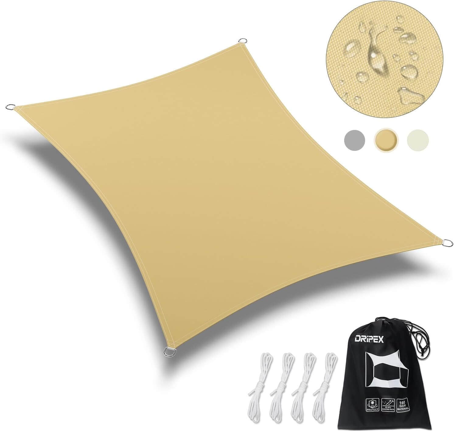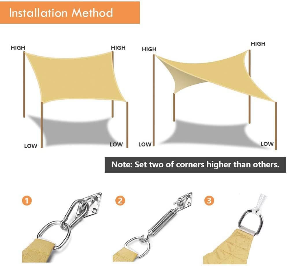 Komplet vključuje: 1 × senčno jadro, 4 × pritrditvene vrvi (dolžina posamezne vrvi 1,5 m)
