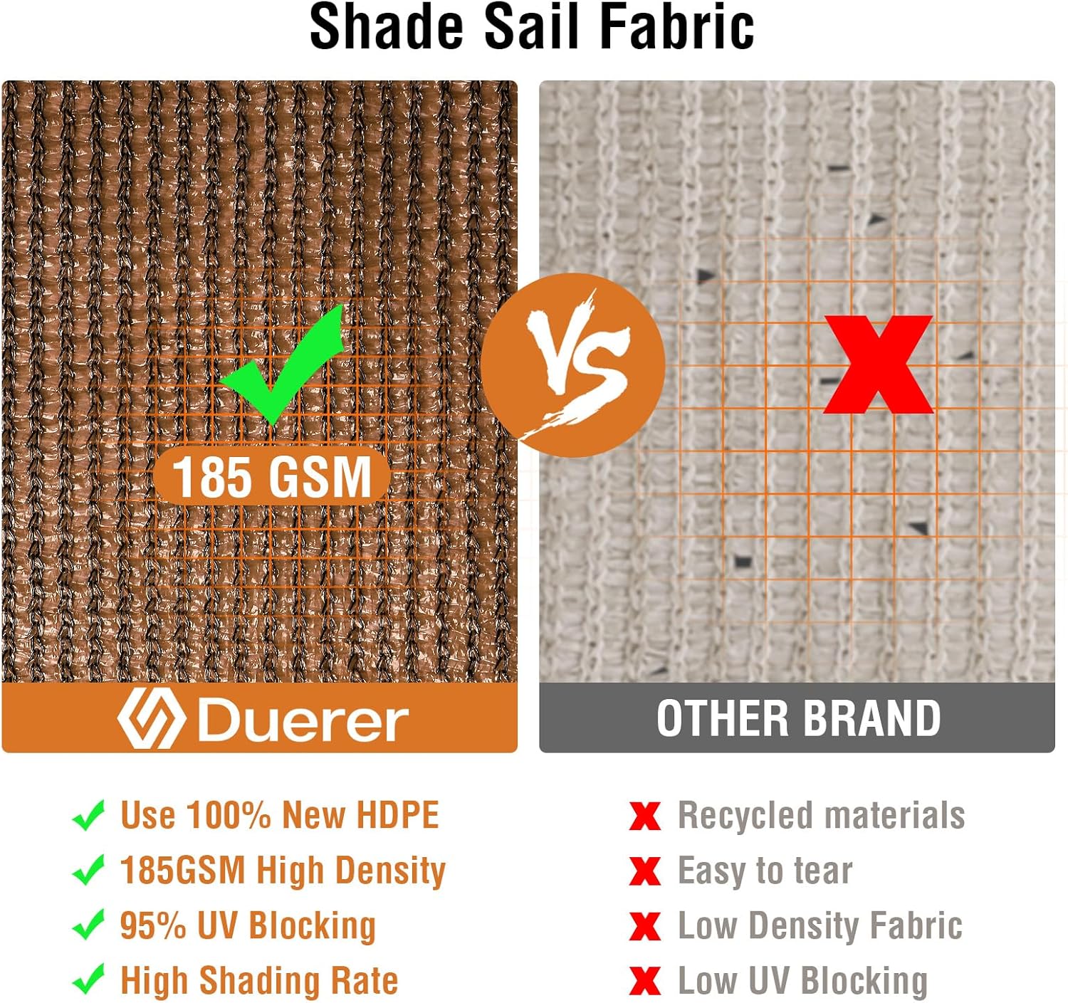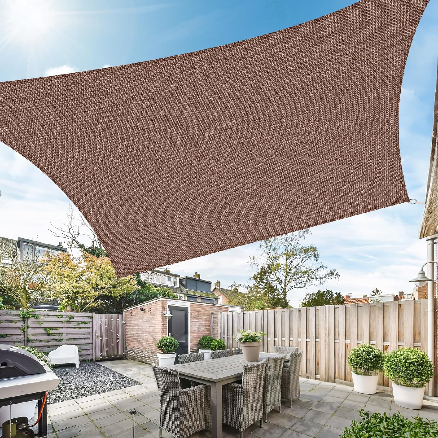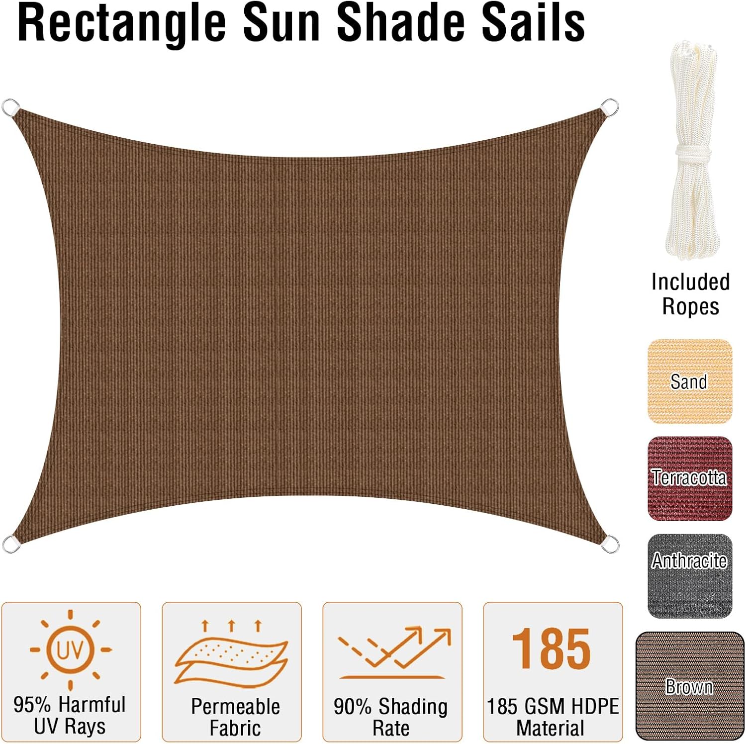 Senčno jadro je izdelano iz visokokakovostnega polietilena z visoko gostoto (HDPE), ki zagotavlja učinkovito zaščito pred soncem in hkrati omogoča prehod zraka za prijetno hladen in zračen prostor. Zasnova pravokotne oblike z ojačanimi robovi in jeklenimi D-obročki zagotavlja stabilnost in dolgo življenjsko dobo izdelka.