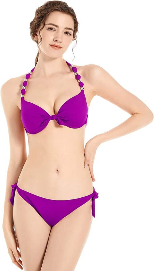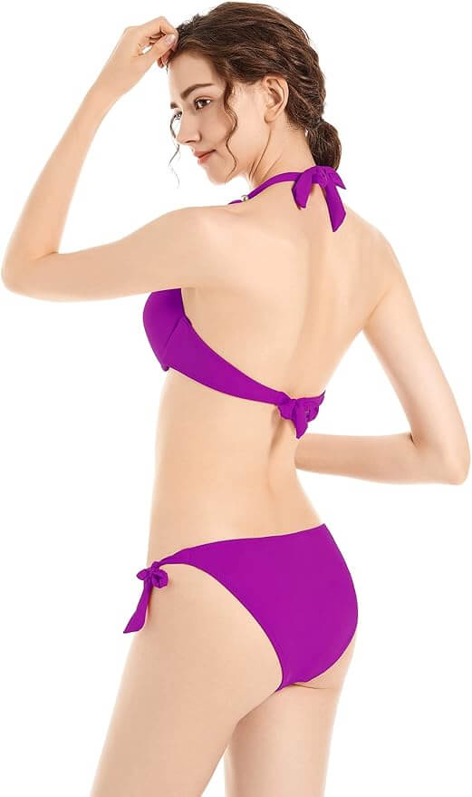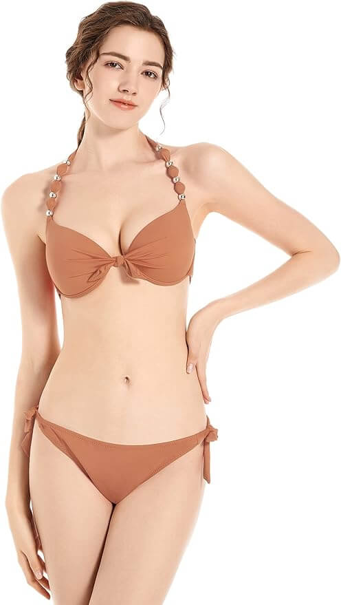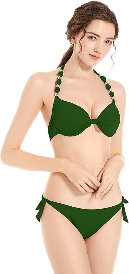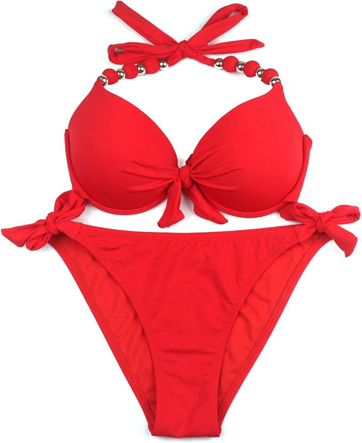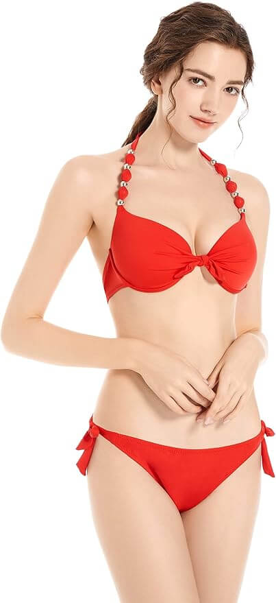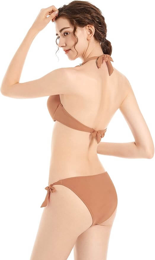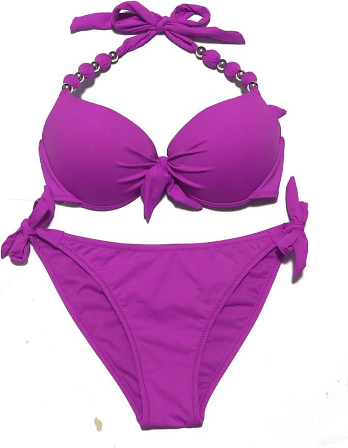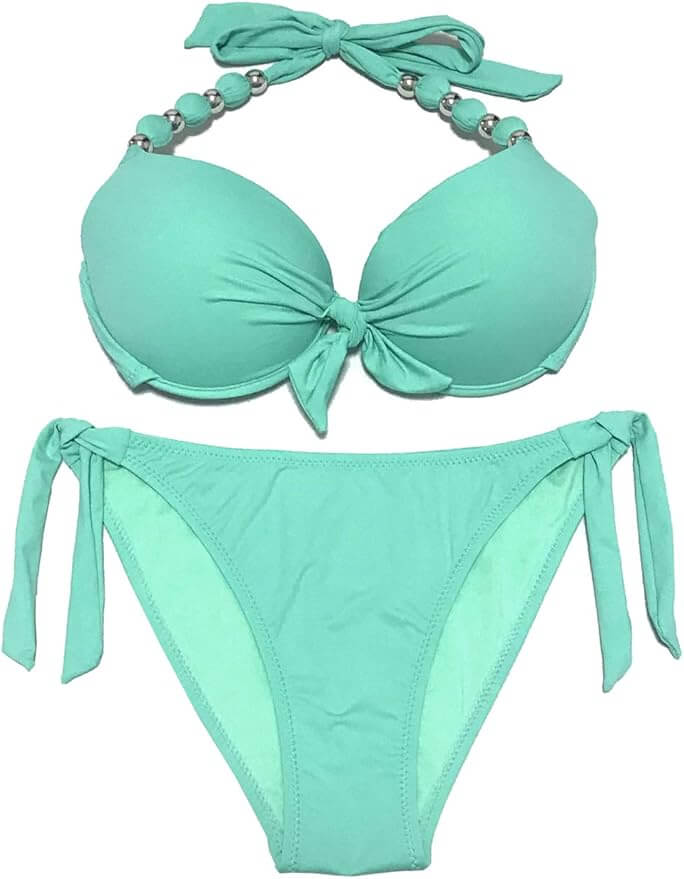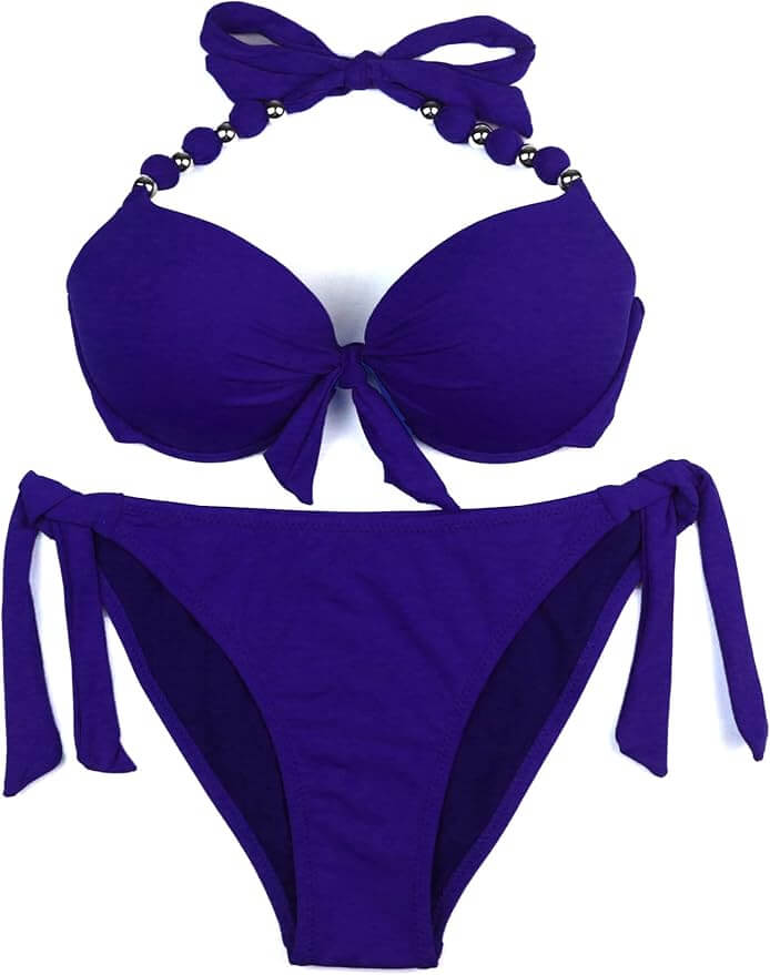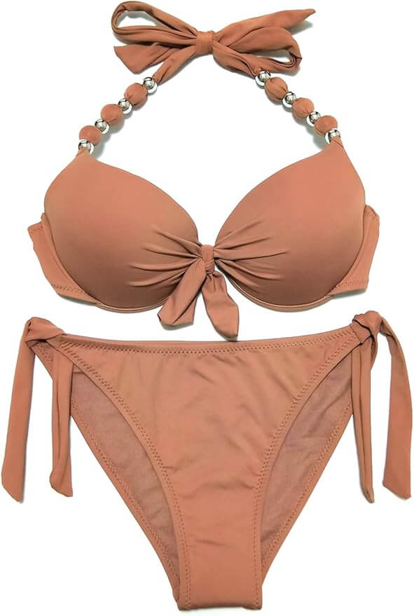 Elegantne in zapeljive dvodelne kopalke z globokim halter izrezom, odstranljivimi push-up blazinicami ter spodnjim delom s stranskimi vezalkami, ki omogočajo popolno prileganje vsaki postavi. Model je idealen za vse, ki želijo poudariti svoje obline.