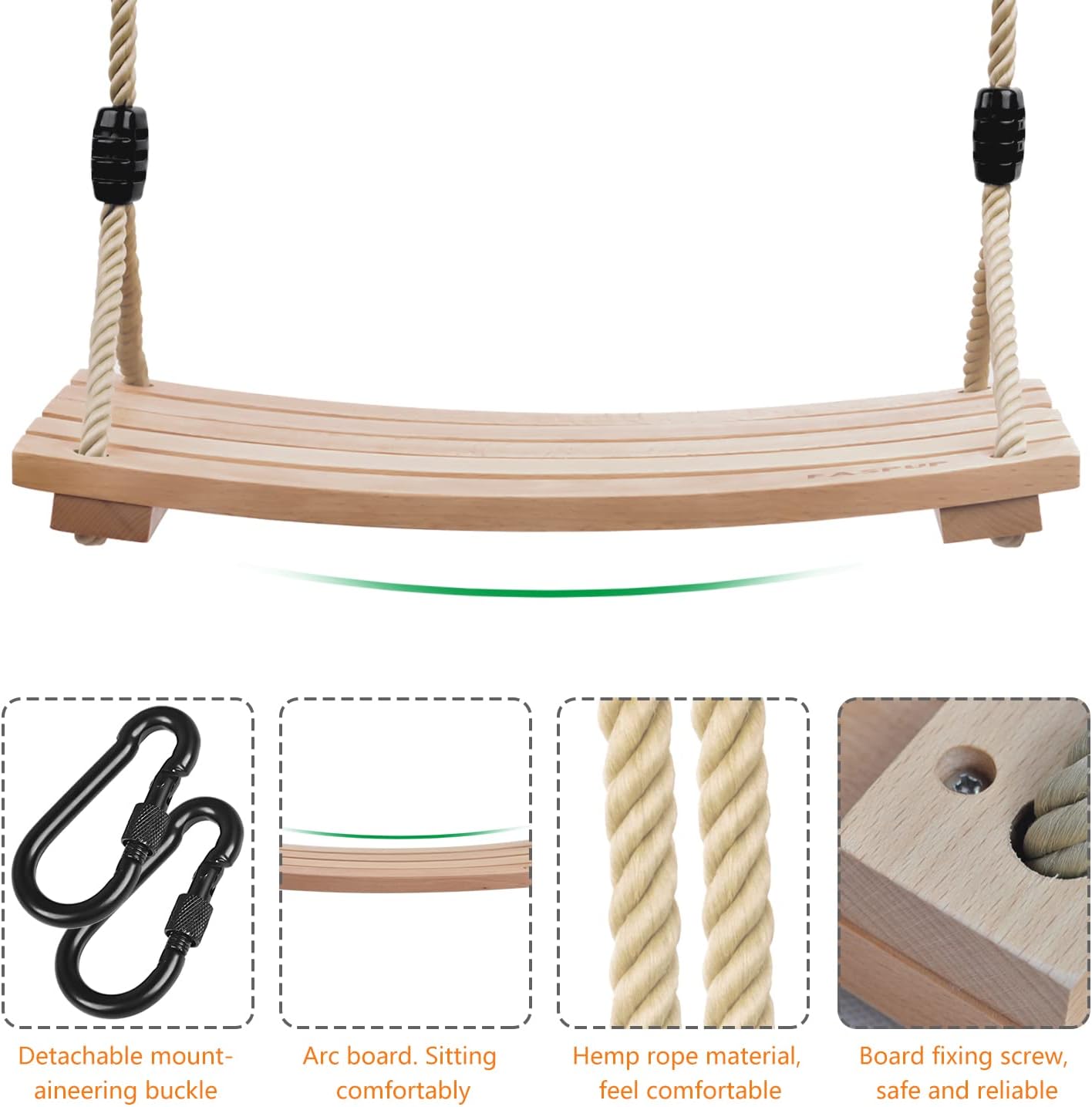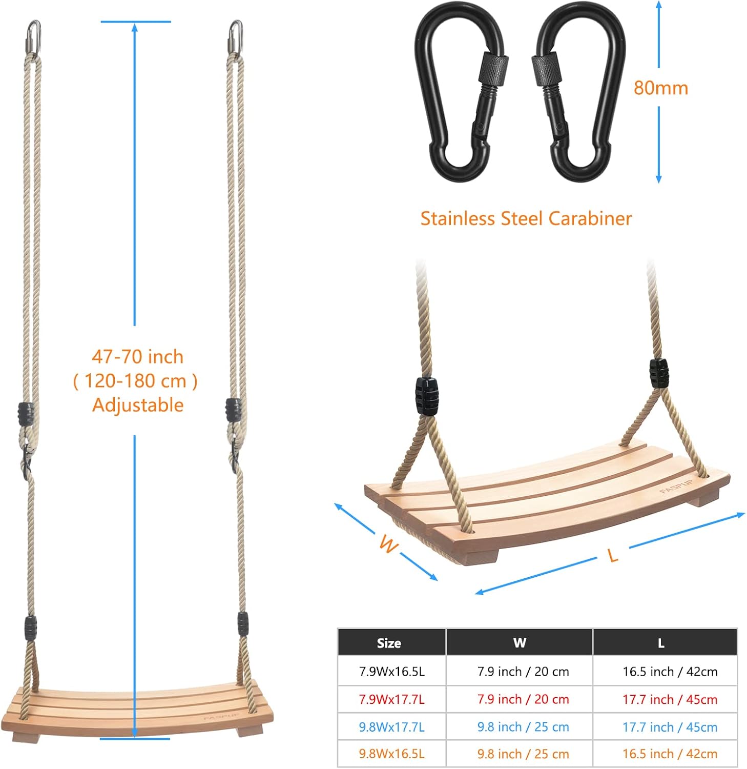 Robustna lesena gugalnica je izdelana iz trdnega bukovega lesa in zasnovana za varno ter udobno uporabo na prostem. Z nastavljivo konopljino vrvjo in nerjavnimi jeklenimi karabini omogoča enostavno namestitev na vejo, tram ali gugalni okvir. Primerna je za otroke starejše od 3 let in odrasle do 100 kg.