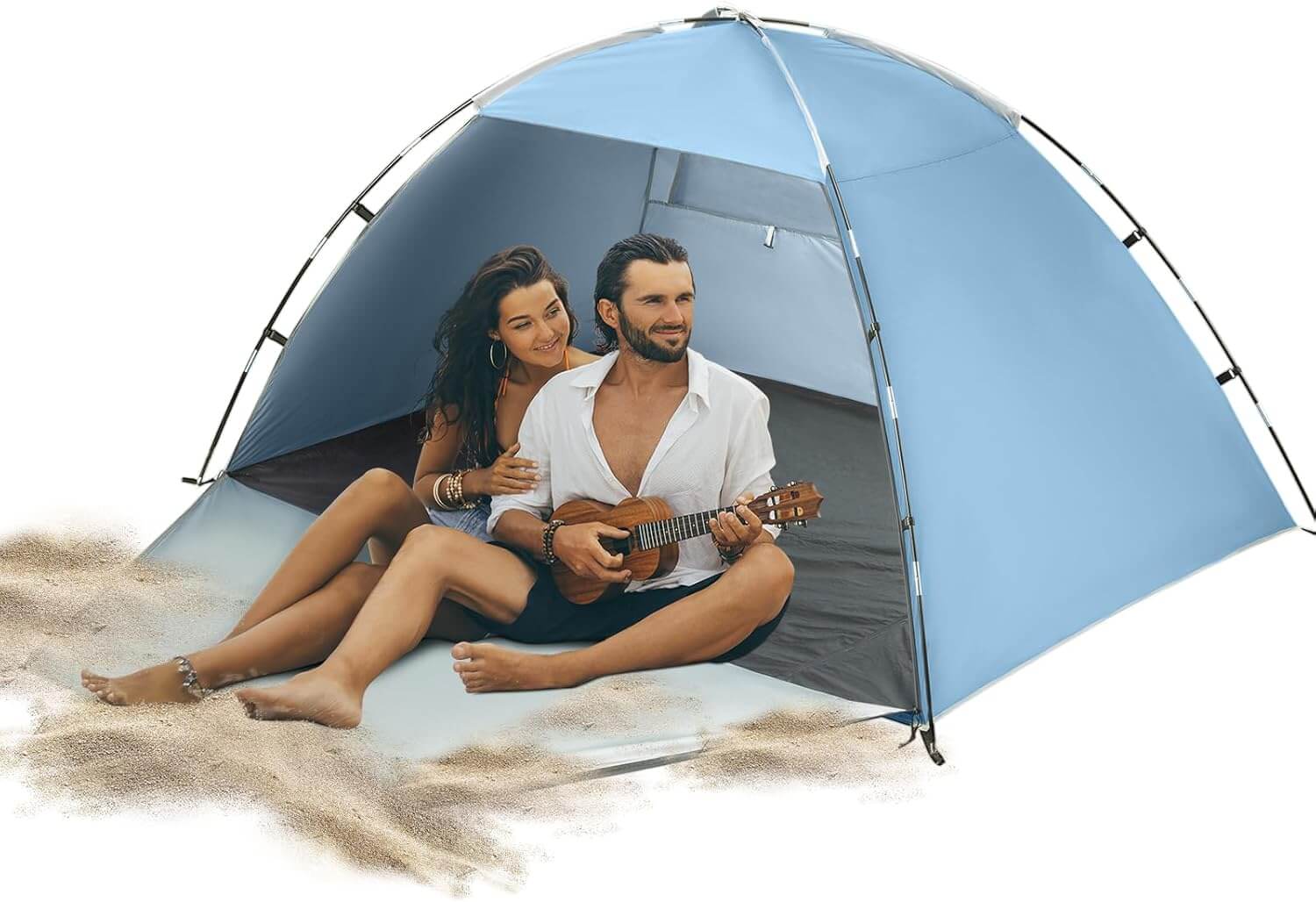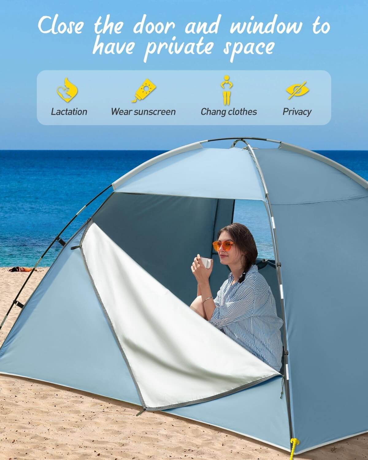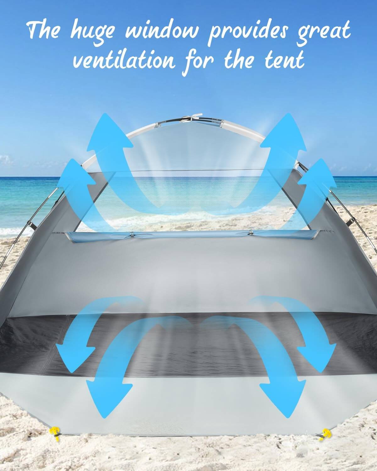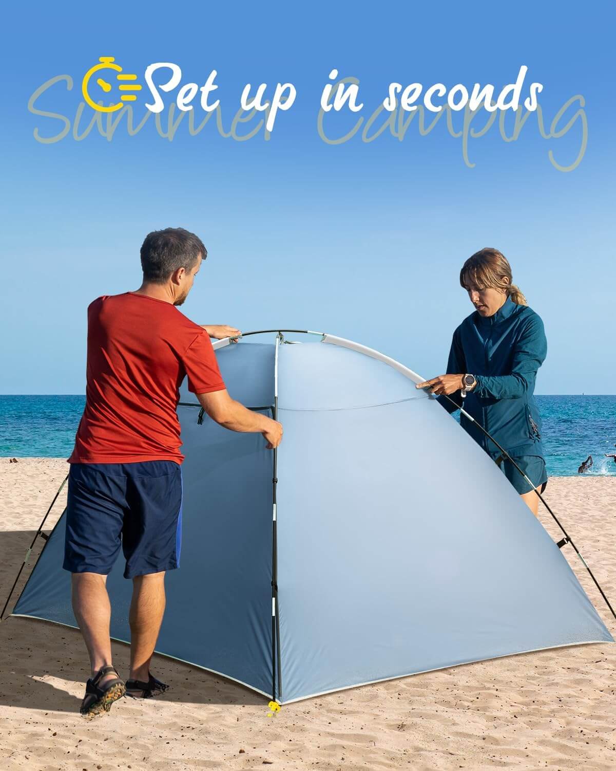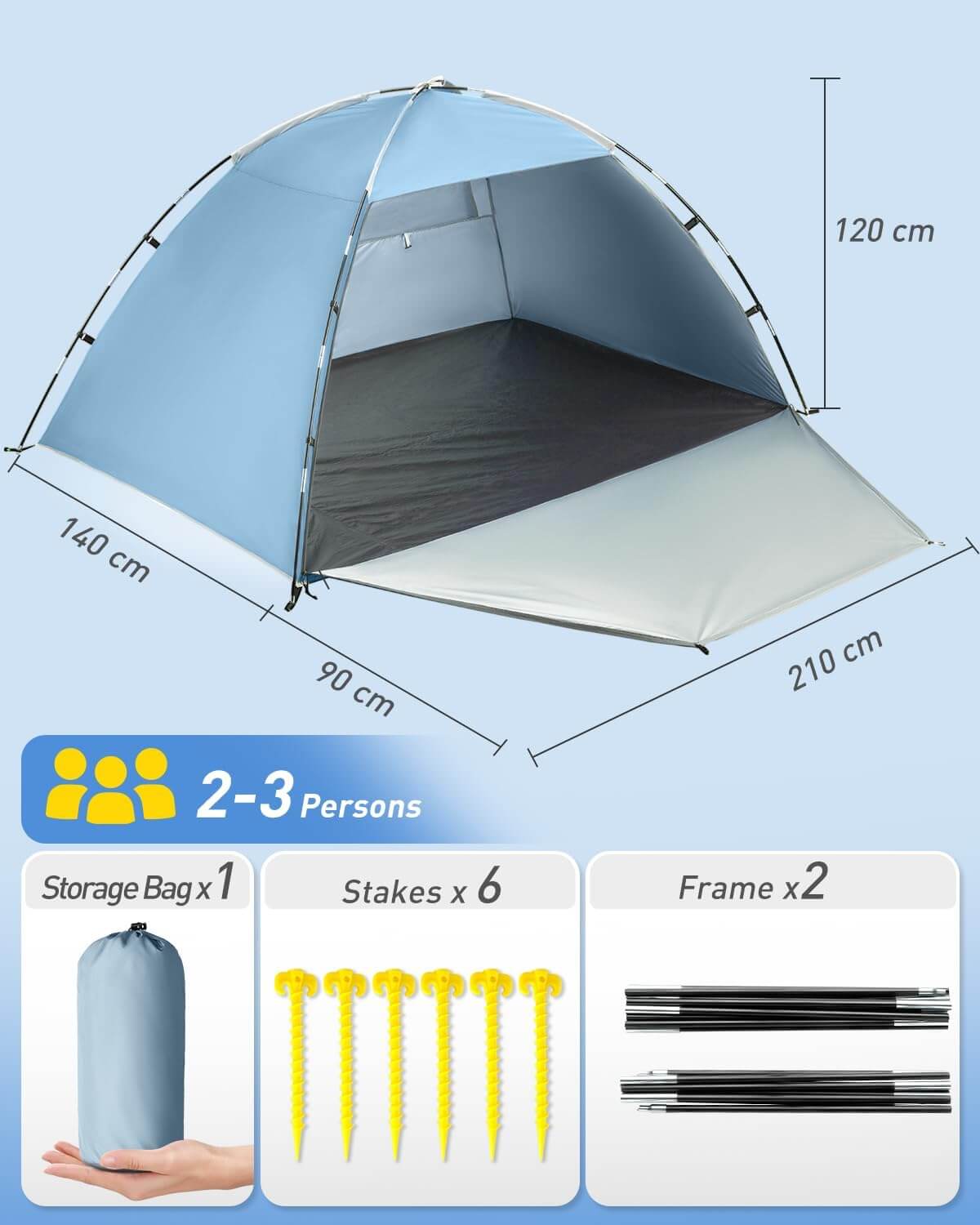 Lahkotna plažna senca iz nudi zanesljivo zaščito pred soncem in začasno zaščito pred dežjem. Srebrna notranja prevleka dosega UV zaščito UPF 50+, ki zmanjšuje prehod škodljivih UV žarkov, kompaktna teža in priročno pakiranje pa omogočata enostavno prenašanje na plažo, v kamp ali na vrt.
