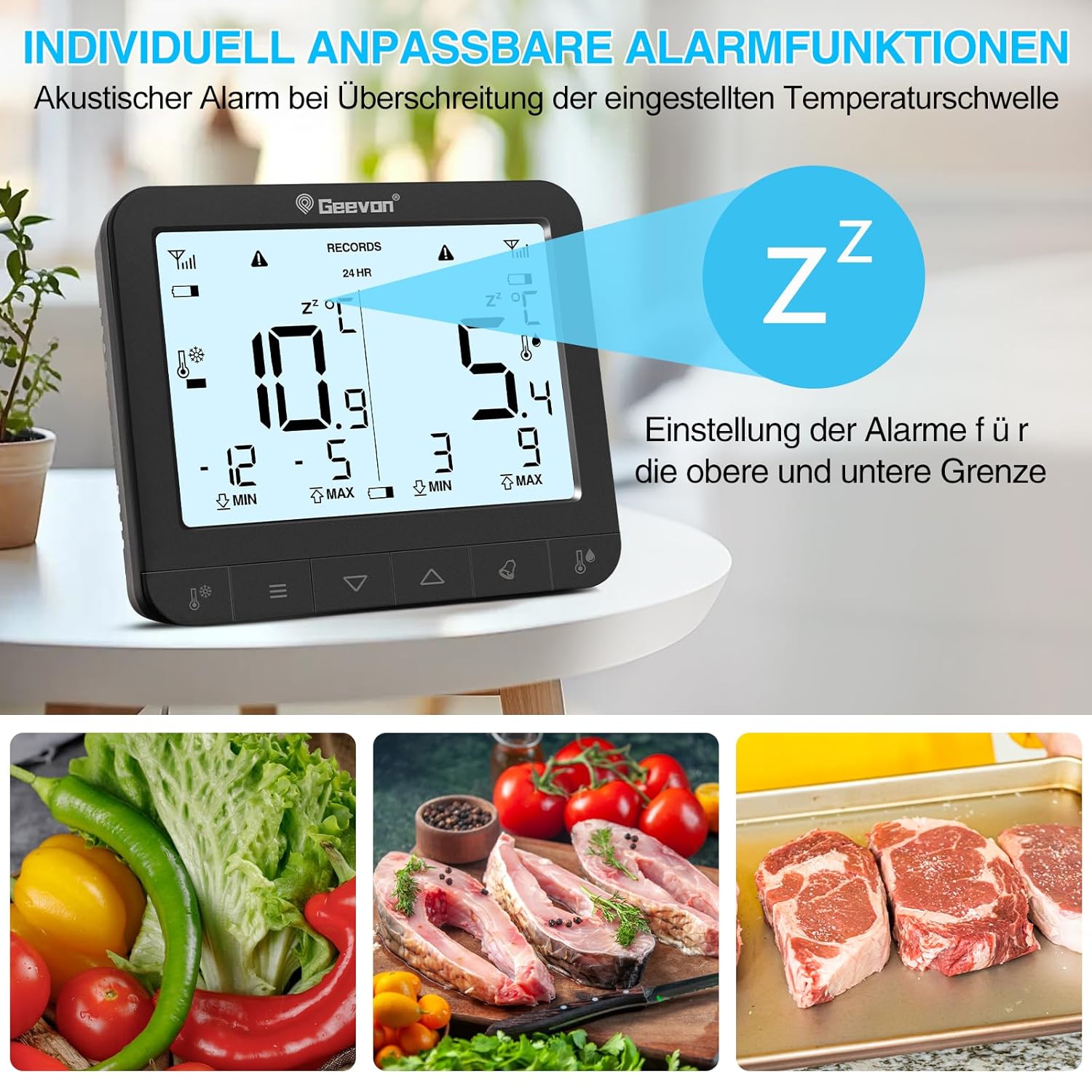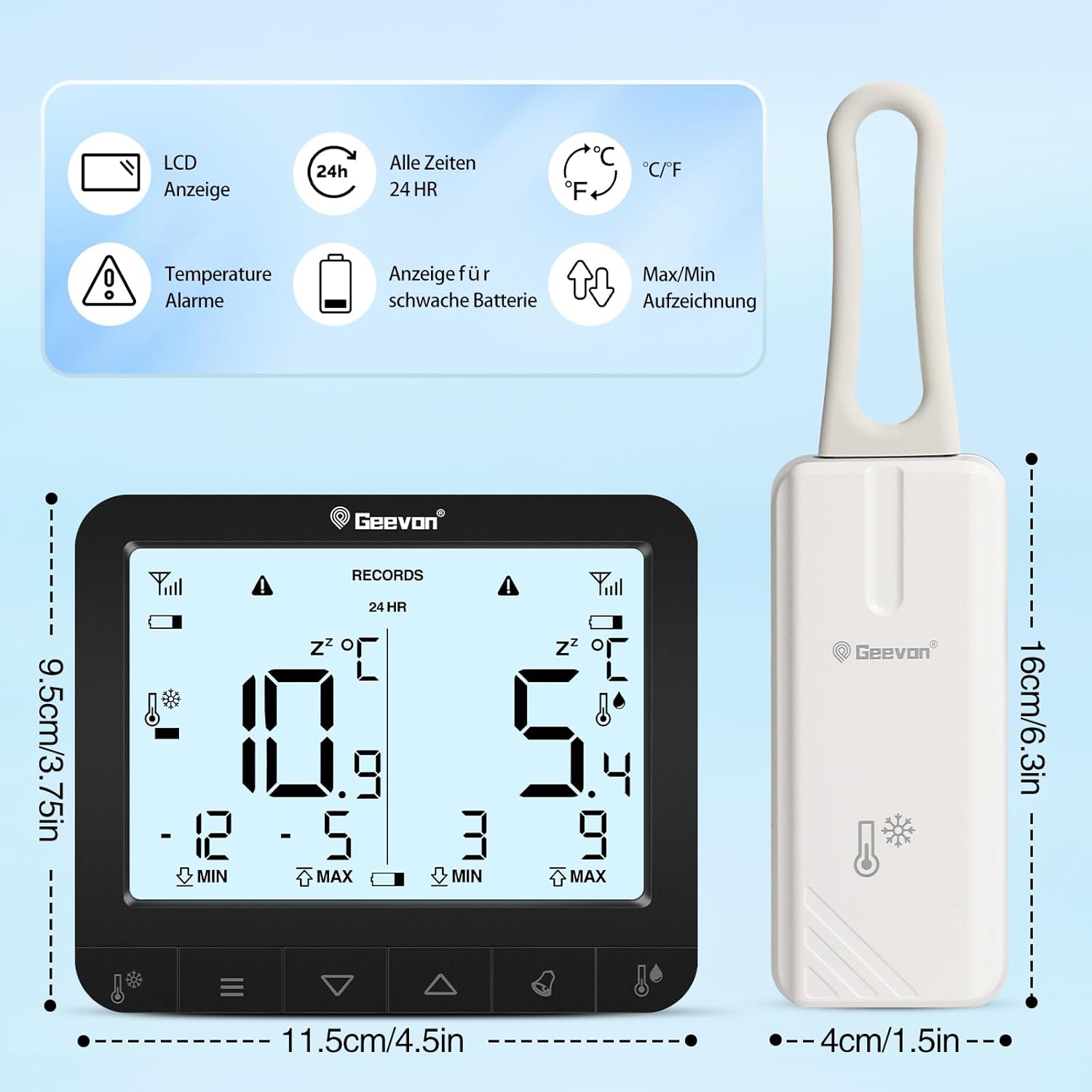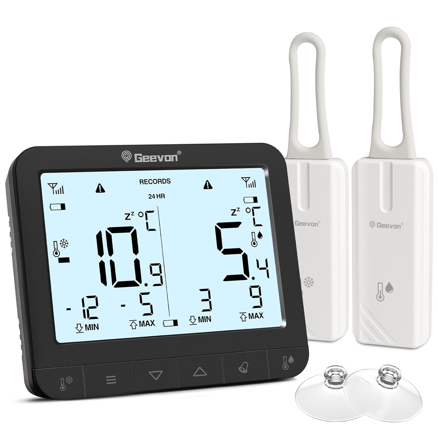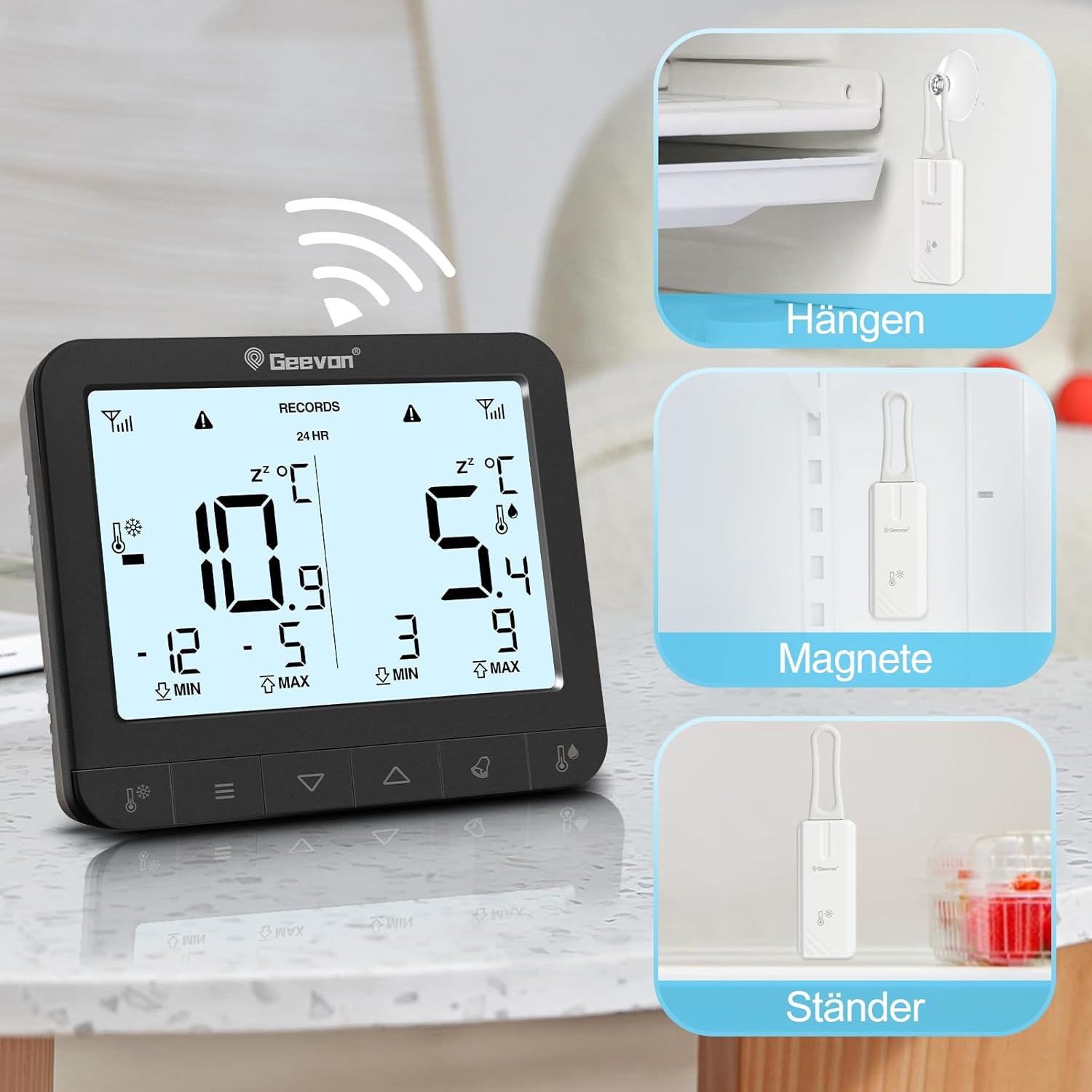Digitalni termometer Geevon z dvema brezžičnima senzorjema omogoča natančen nadzor temperature v hladilniku ali zamrzovalniku. Z osvetljenim zaslonom, opozorilnim alarmom in zapisom najvišjih ter najnižjih vrednosti v 24 urah zagotavlja popoln pregled nad pogoji shranjevanja hrane.