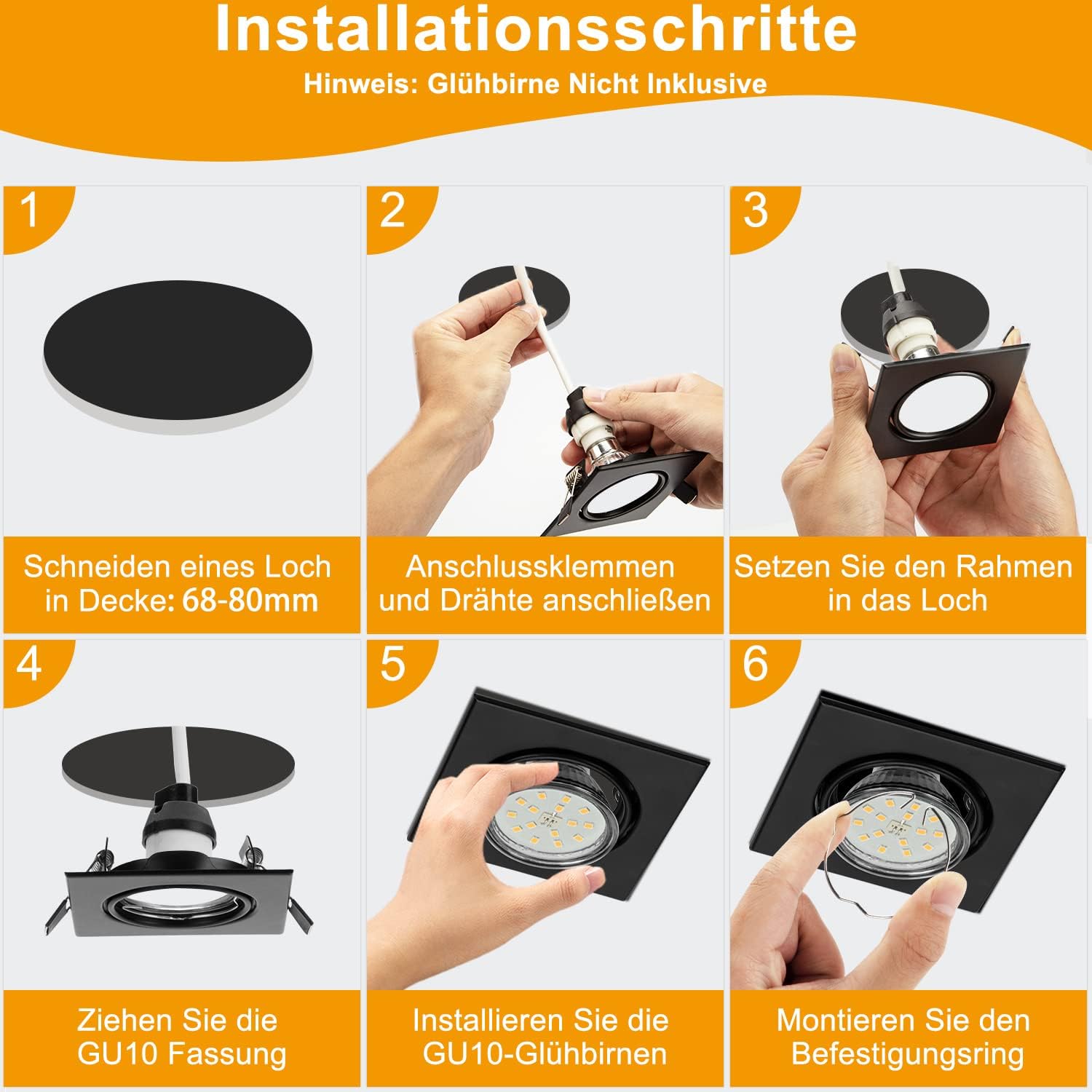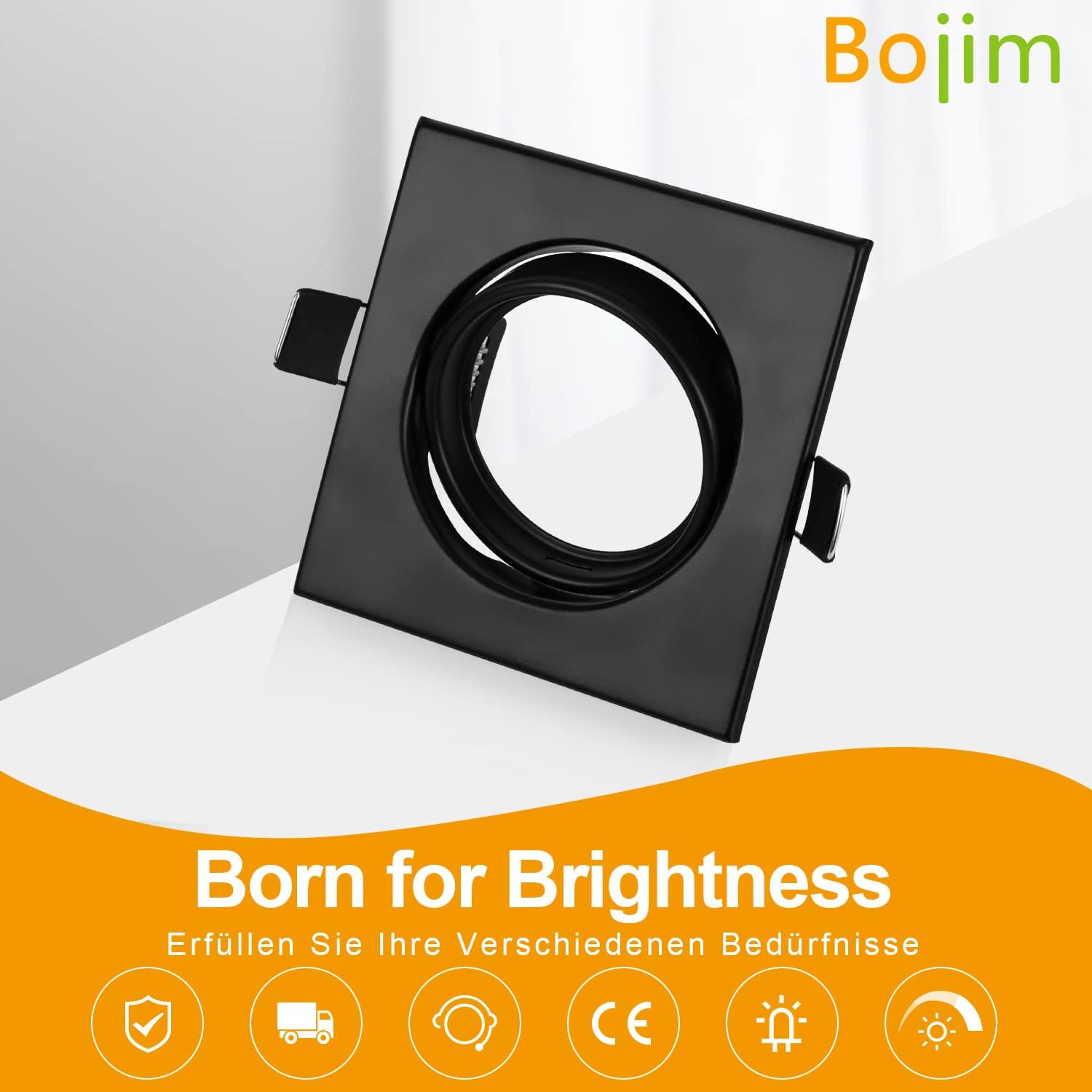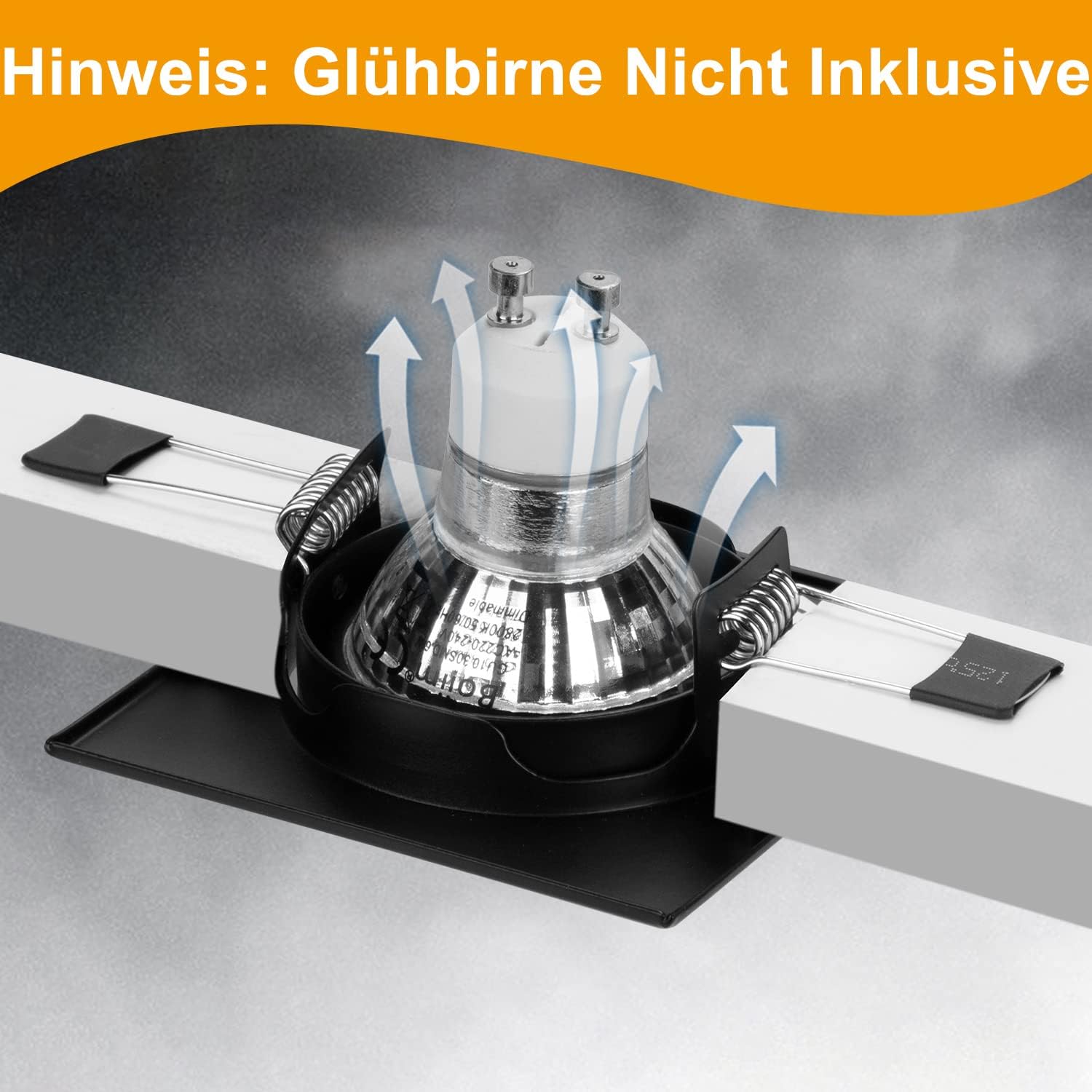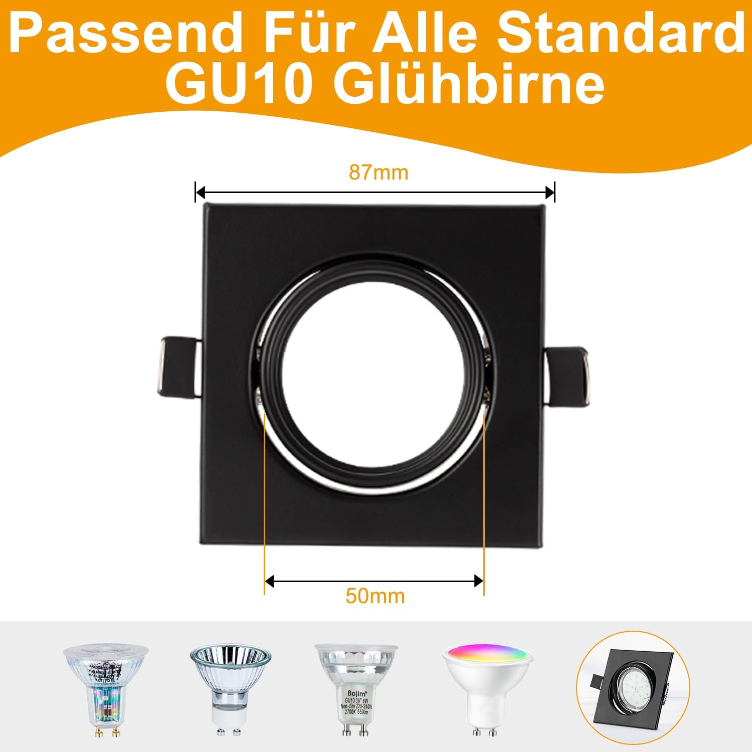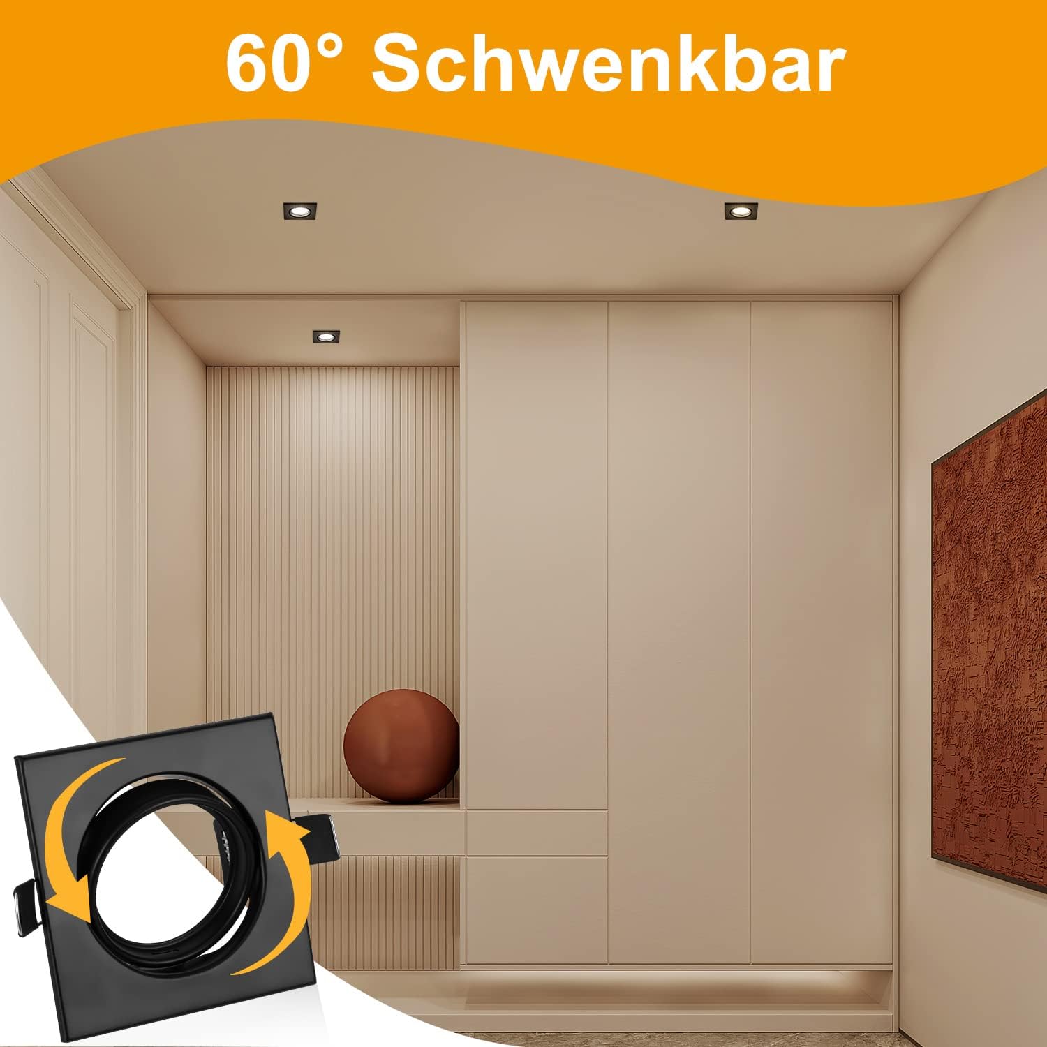 Set 10 elegantnih vgradnih svetil v mat črni barvi, s kvadratnim dizajnom in nastavljivim (nagibnim) kotom osvetlitve do 30°. Komplet vključuje okvire in GU10 keramična podnožja, brez žarnic. Zasnovano za LED in halogenske žarnice GU10 premera 50 mm.