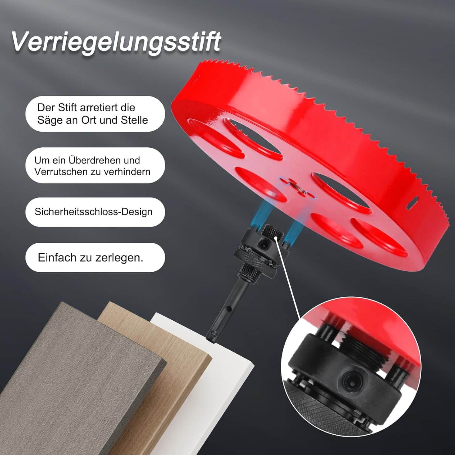Vsebina kompleta: 1x luknjač Ø 300 mm, 1x SDS Plus nastavek, 1x šesterokotni nastavek, 2x vodilni sveder, 1x imbus ključ
