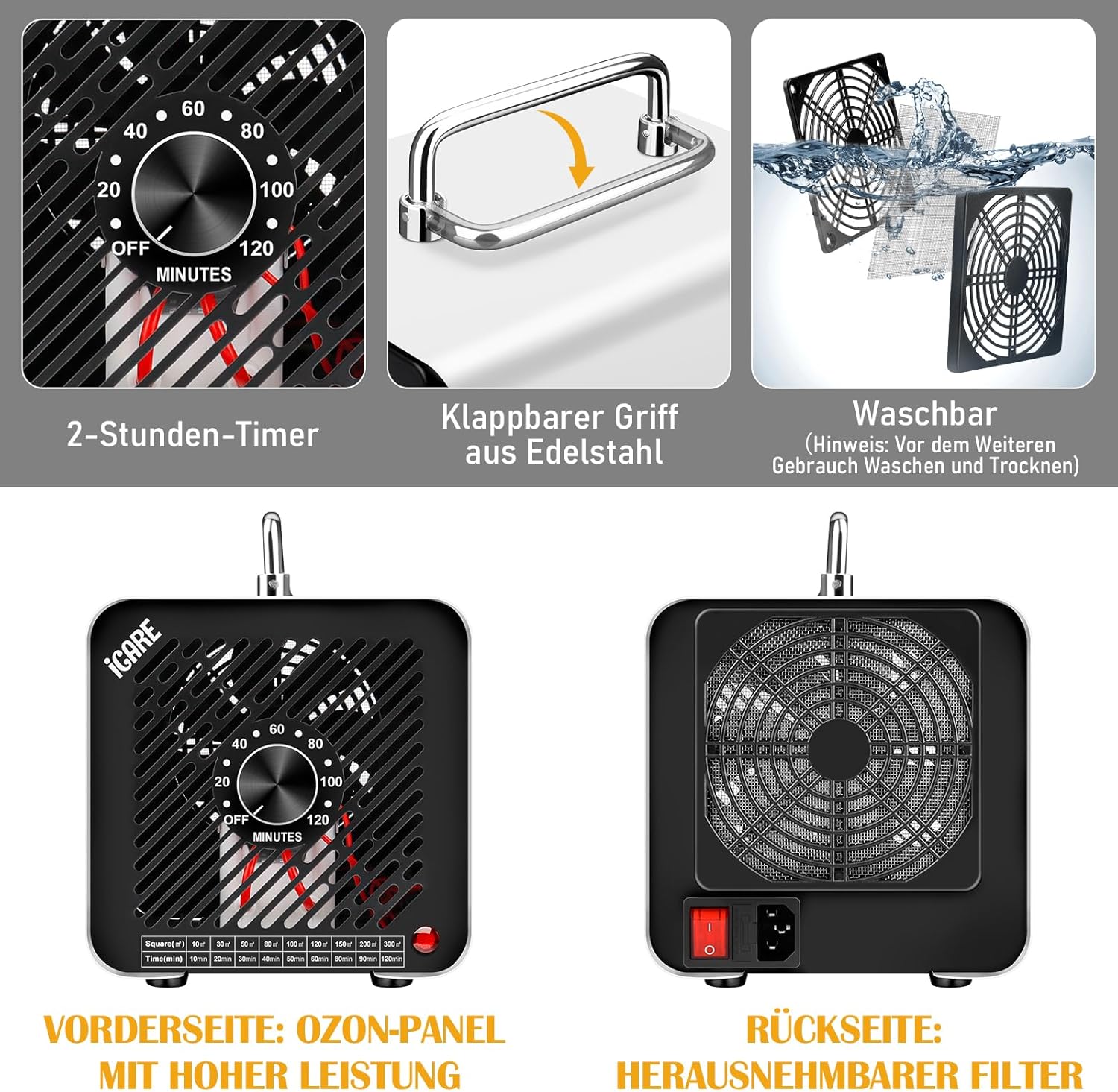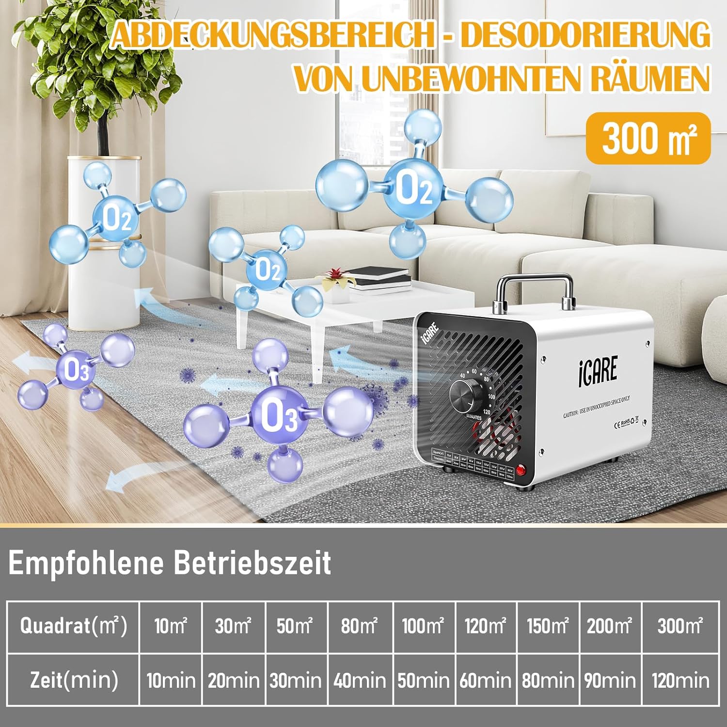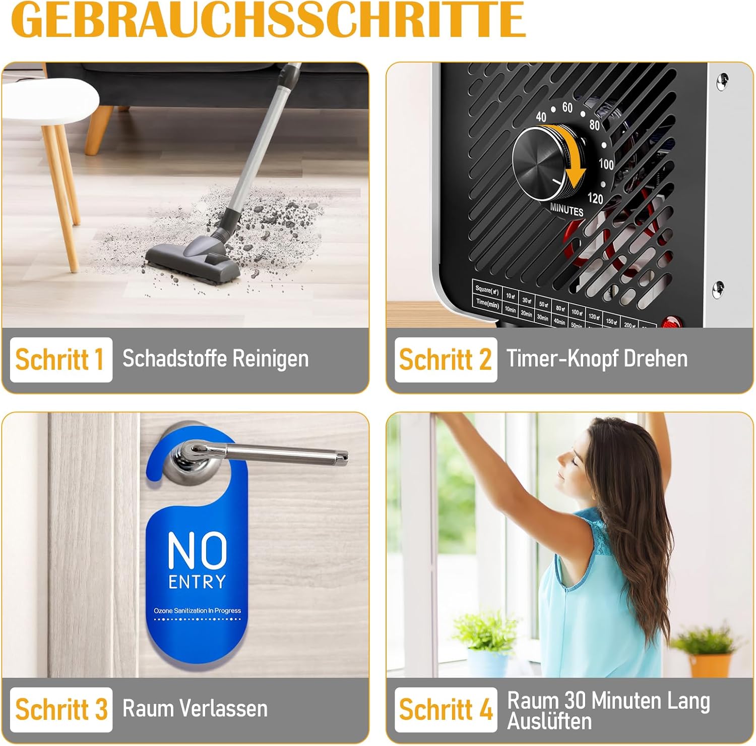 Visoka učinkovitost čiščenja: proizvaja 30.000 mg ozona na uro, kar omogoča hitro in temeljito odstranjevanje neprijetnih vonjav (dim, živali, kuhinjski vonji, plesen ipd.).