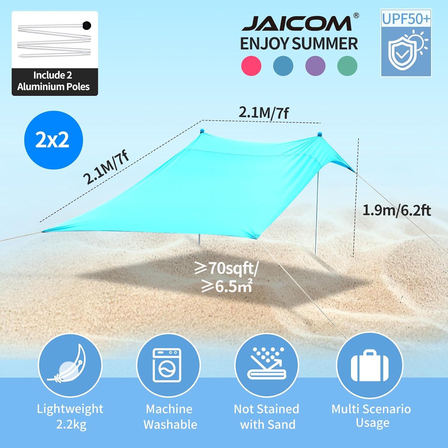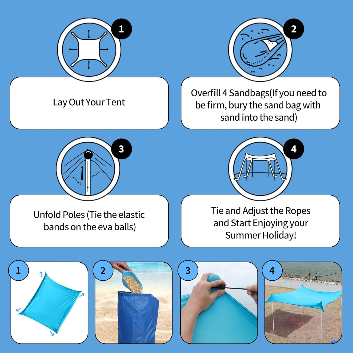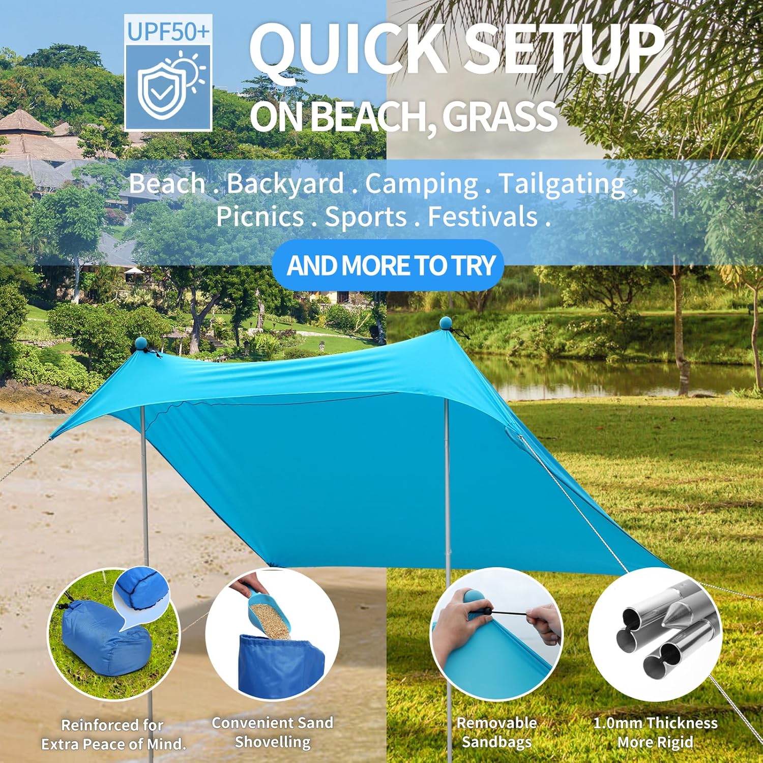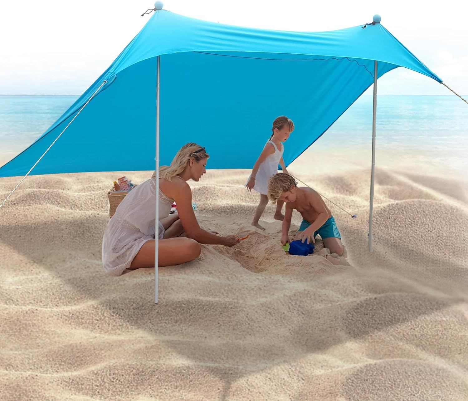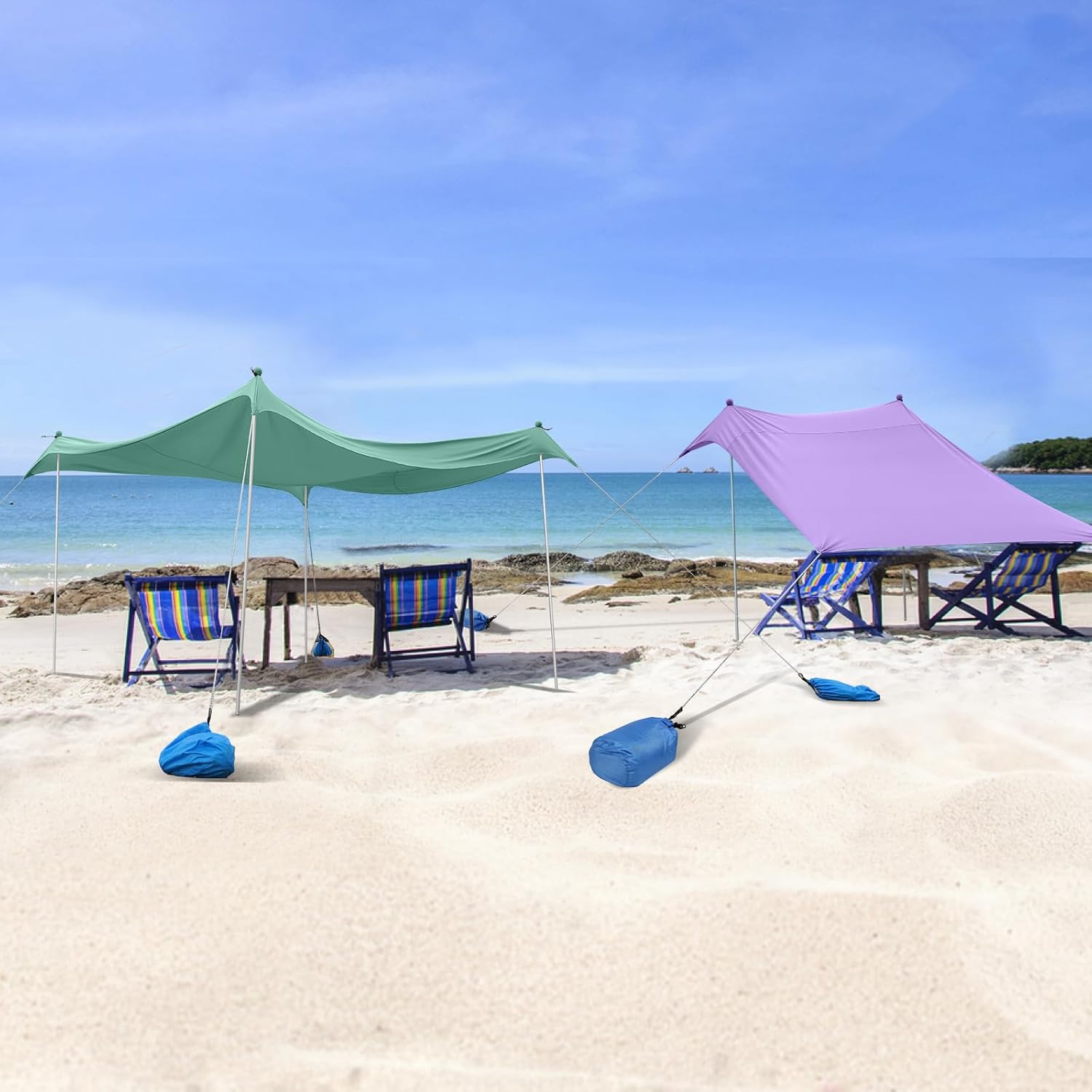 Kompaktna in stabilna plažna tenda nudi učinkovito zaščito pred soncem, vetrom in rahlim dežjem. Izdelana je iz elastične tkanine Lycra z UV zaščito UPF 50+, ki blokira do 98 % škodljivih sončnih žarkov. Zahvaljujoč aluminijskim palicam in odstranljivim vrečam za pesek je montaža hitra, struktura pa trdna tudi ob vetrovnem vremenu.