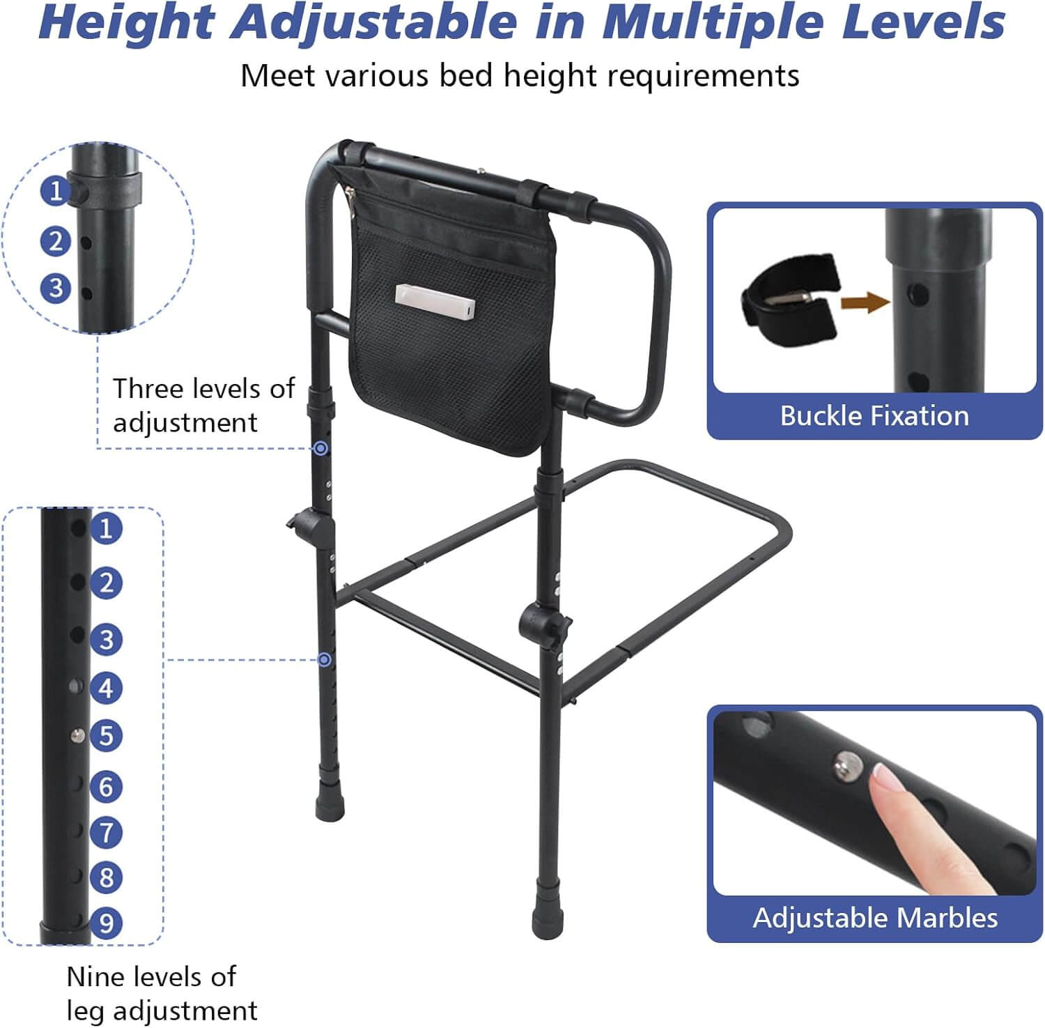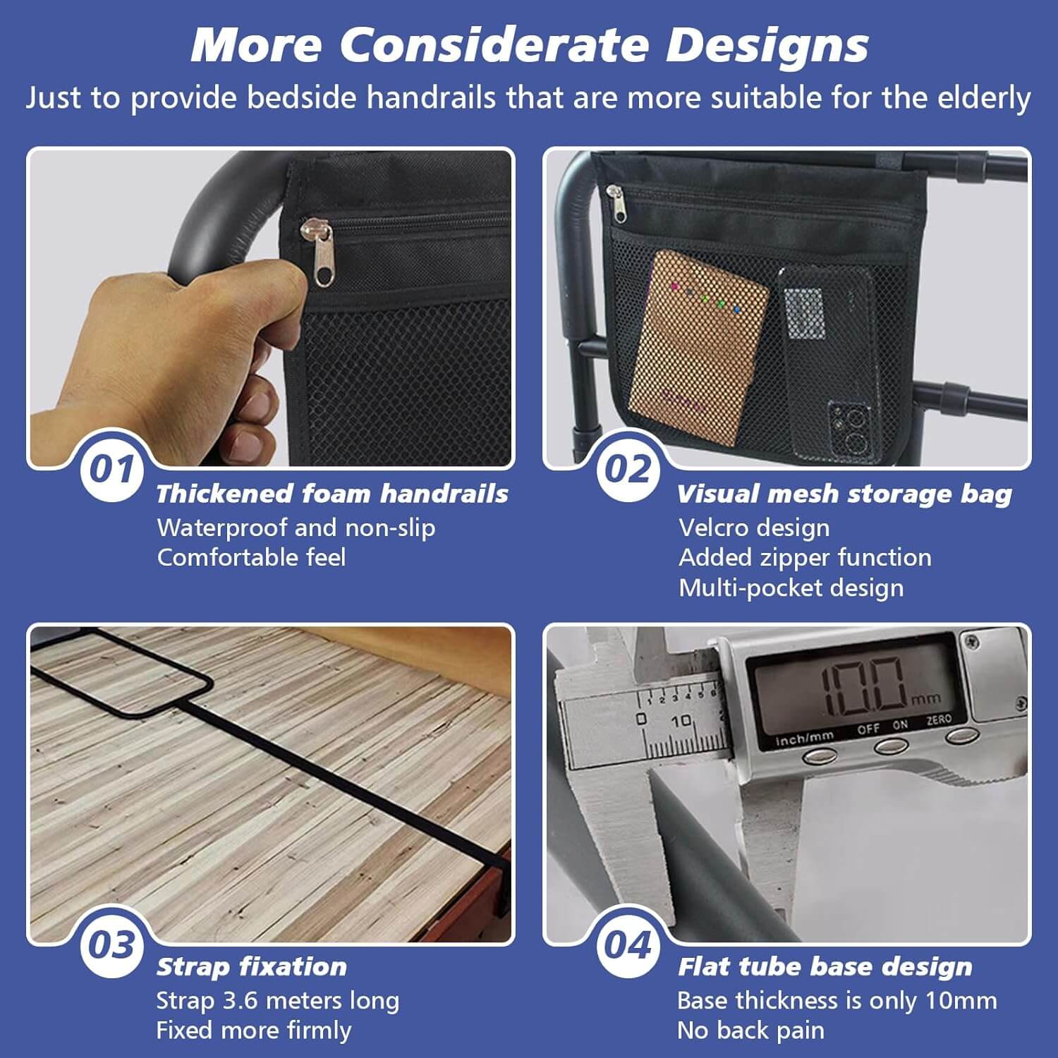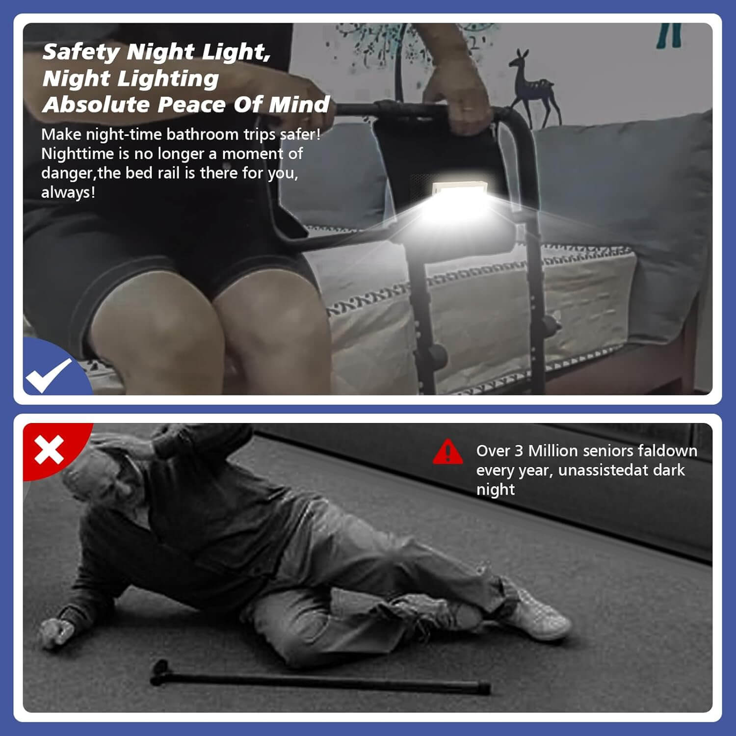 Stabilna in vsestransko nastavljiva posteljna ograja z razširjenimi ročaji nudi učinkovito podporo pri vstajanju, obračanju in preprečevanju padcev med spanjem. Nastavljiva po višini, z nedrsečim oblazinjenjem, varnostnimi trakovi ter vgrajeno senzor LED lučko, ki se samodejno prižge v temi, je idealna za starejše, osebe v rehabilitaciji ali vsakogar, ki potrebuje dodatno varnost ob postelji.