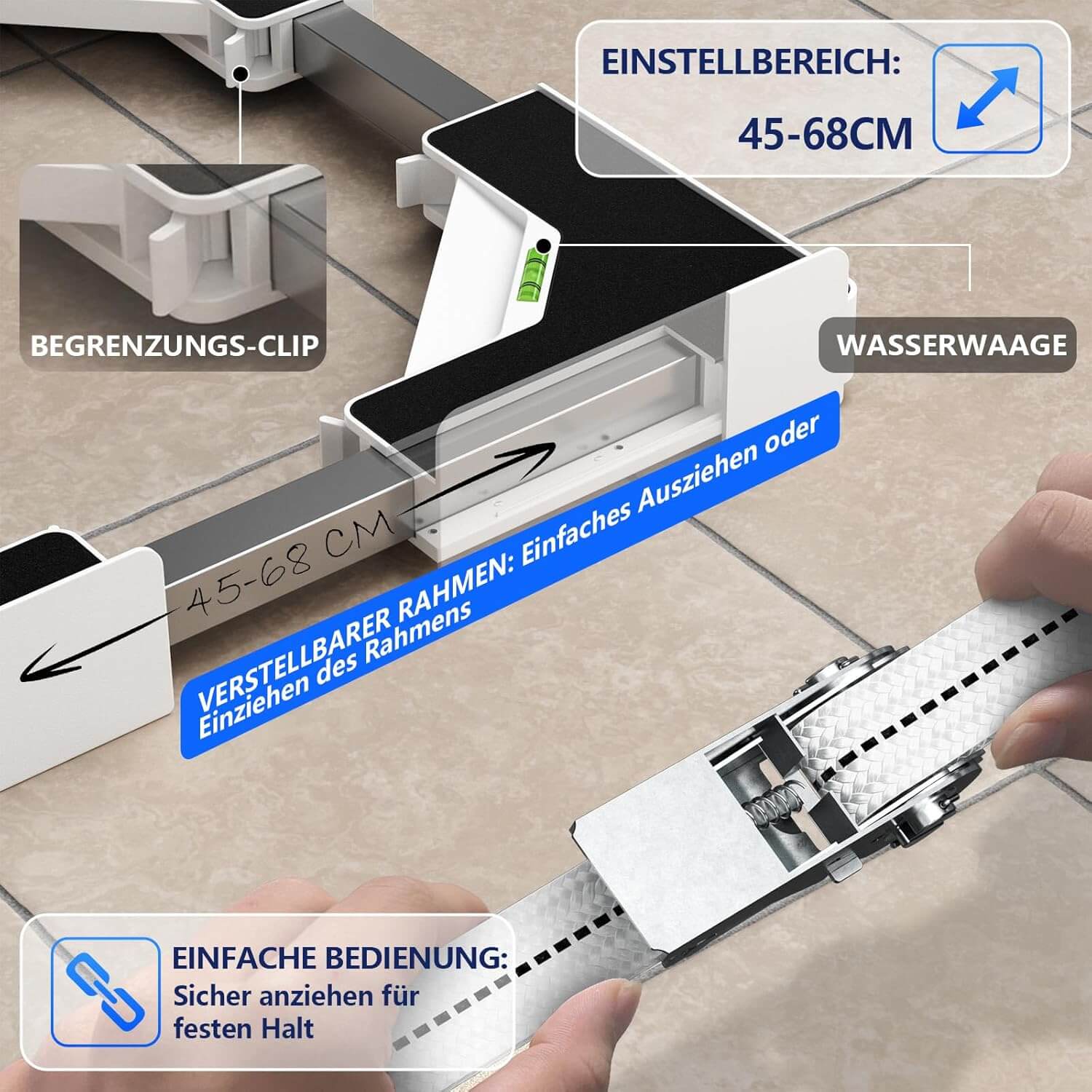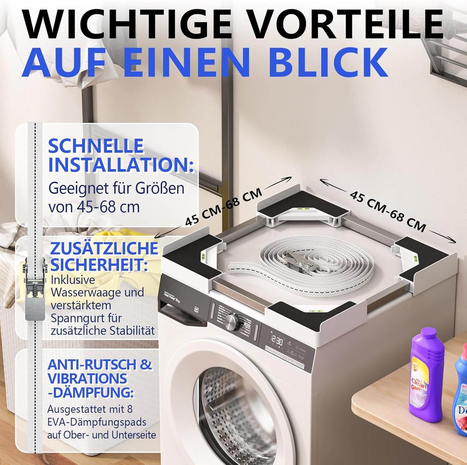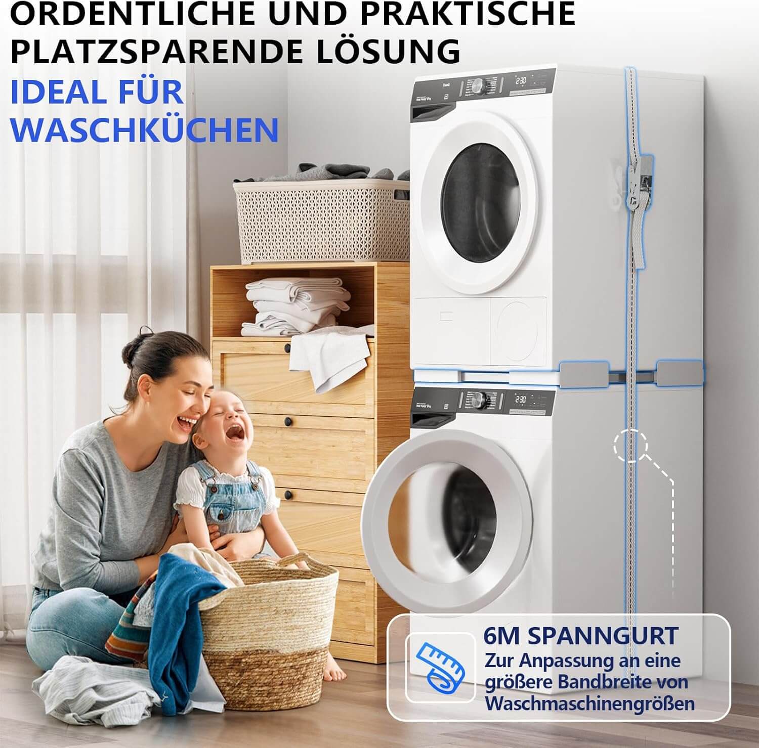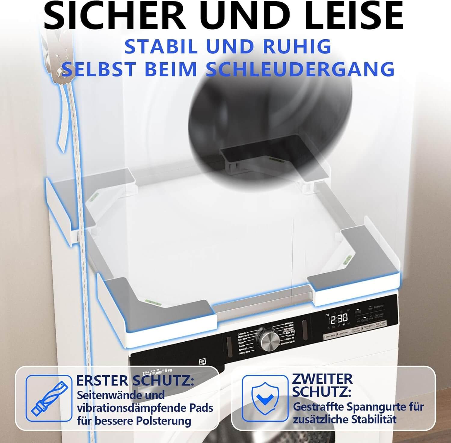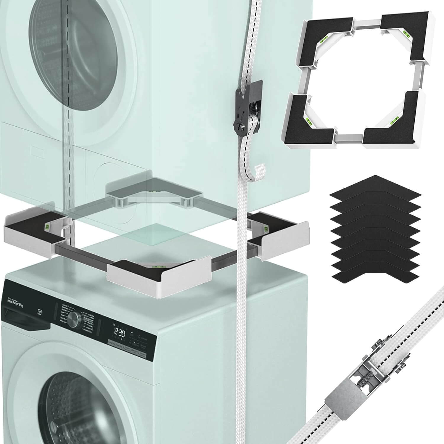 Praktičen univerzalni vmesni okvir omogoča varno postavitev sušilnega stroja na pralni stroj in tako prihrani dragoceni prostor v pralnici. Z nastavljivo širino od 45 do 68 cm je primeren za večino modelov in blagovnih znamk. Montaža je hitra, brez vrtanja, komplet pa vključuje tudi dodatne varnostne trakove za maksimalno stabilnost.
