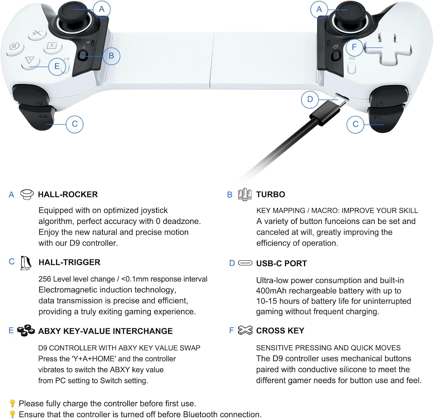 Večnamenski brezžični krmilnik Joso D9 ponuja izjemno natančnost, odzivnost in prilagodljivost za različne naprave. Z naprednimi funkcijami, kot so Hall joystick, dvosmerni vibracijski sistem in programabilni zadnji gumbi, omogoča vrhunsko igralno izkušnjo na mobilnih napravah, konzolah in računalnikih.