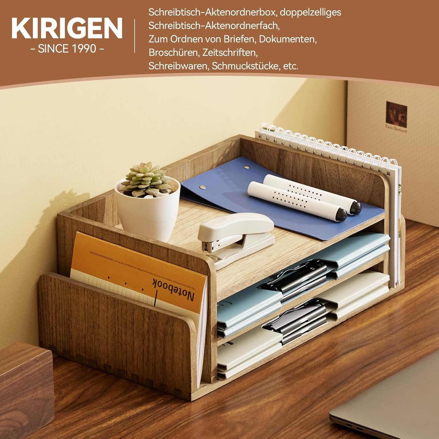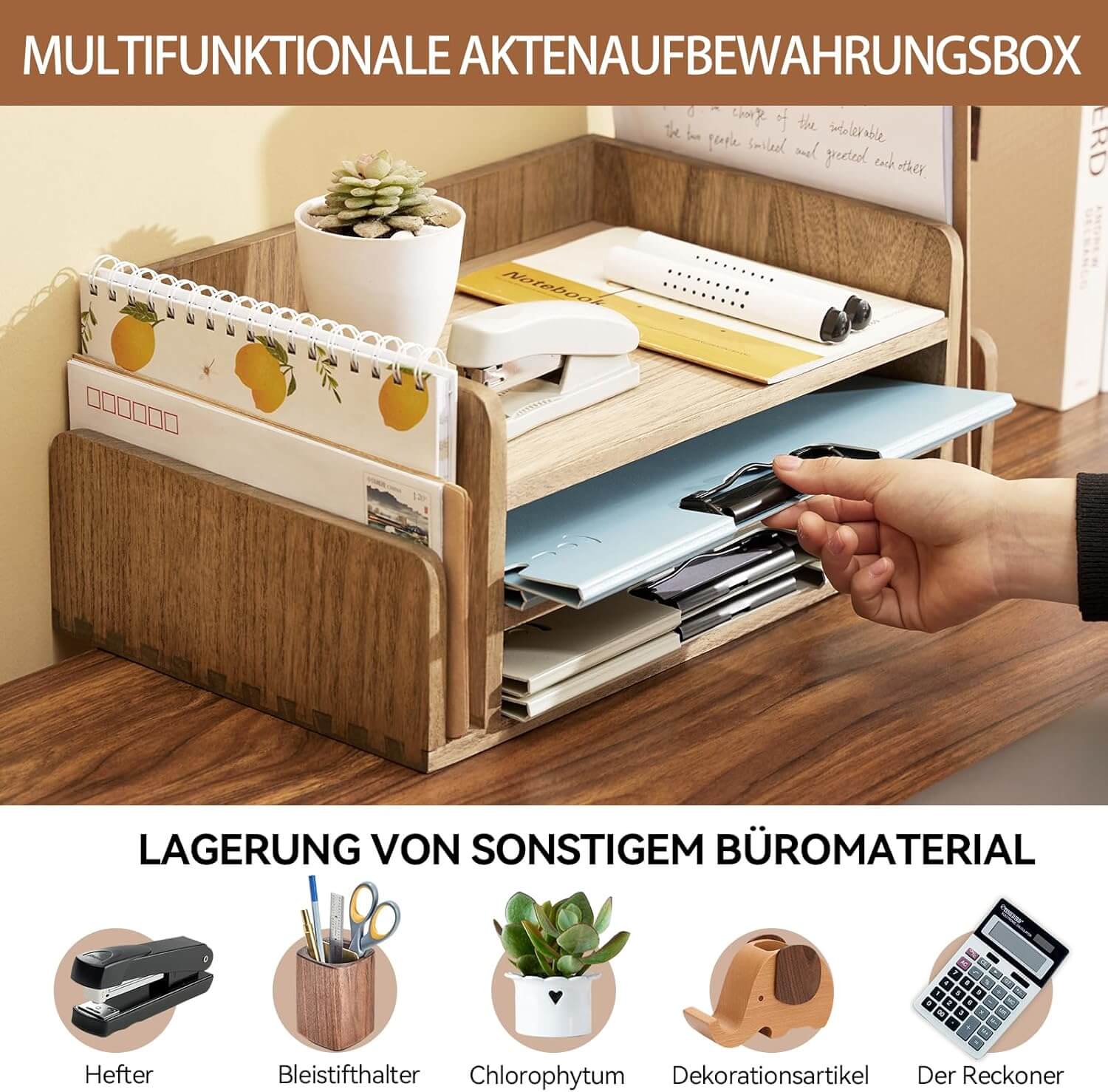 Eleganten in funkcionalen namizni organizator iz naravnega lesa poskrbi za urejen in estetsko dovršen delovni prostor. Zasnovan z naravno toplino lesa in trdno konstrukcijo ponuja popolno ravnovesje med uporabnostjo in dekorativnostjo. Primeren za pisarne, domače delovne kotičke ali študentske mize.