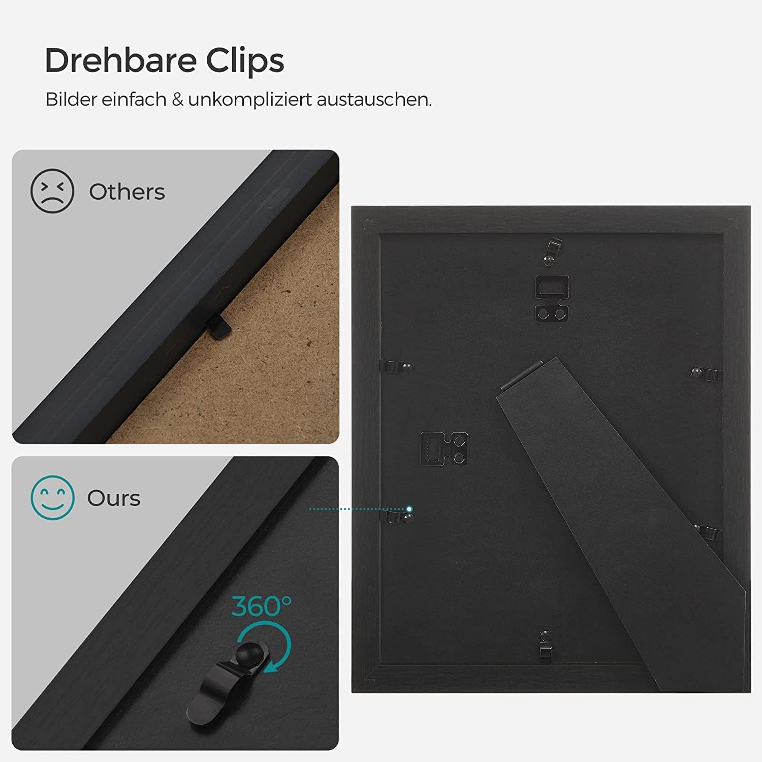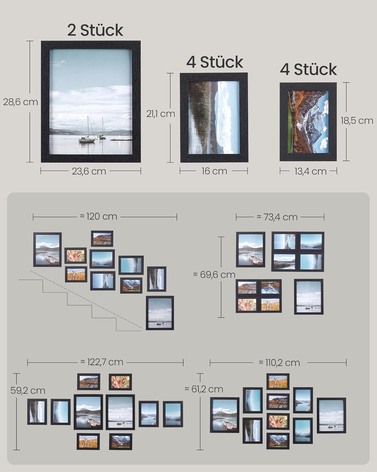 Komplet okvirjev za slike je idealen za ustvarjanje osebnega kolaža v dnevni sobi, hodniku ali pisarni. Vključuje različne velikosti okvirjev, ki omogočajo postavitev na steno ali polico. Okvirji so izdelani iz trpežnega MDF-ja z zaščitnimi plastičnimi stekli za dolgotrajno uporabo.