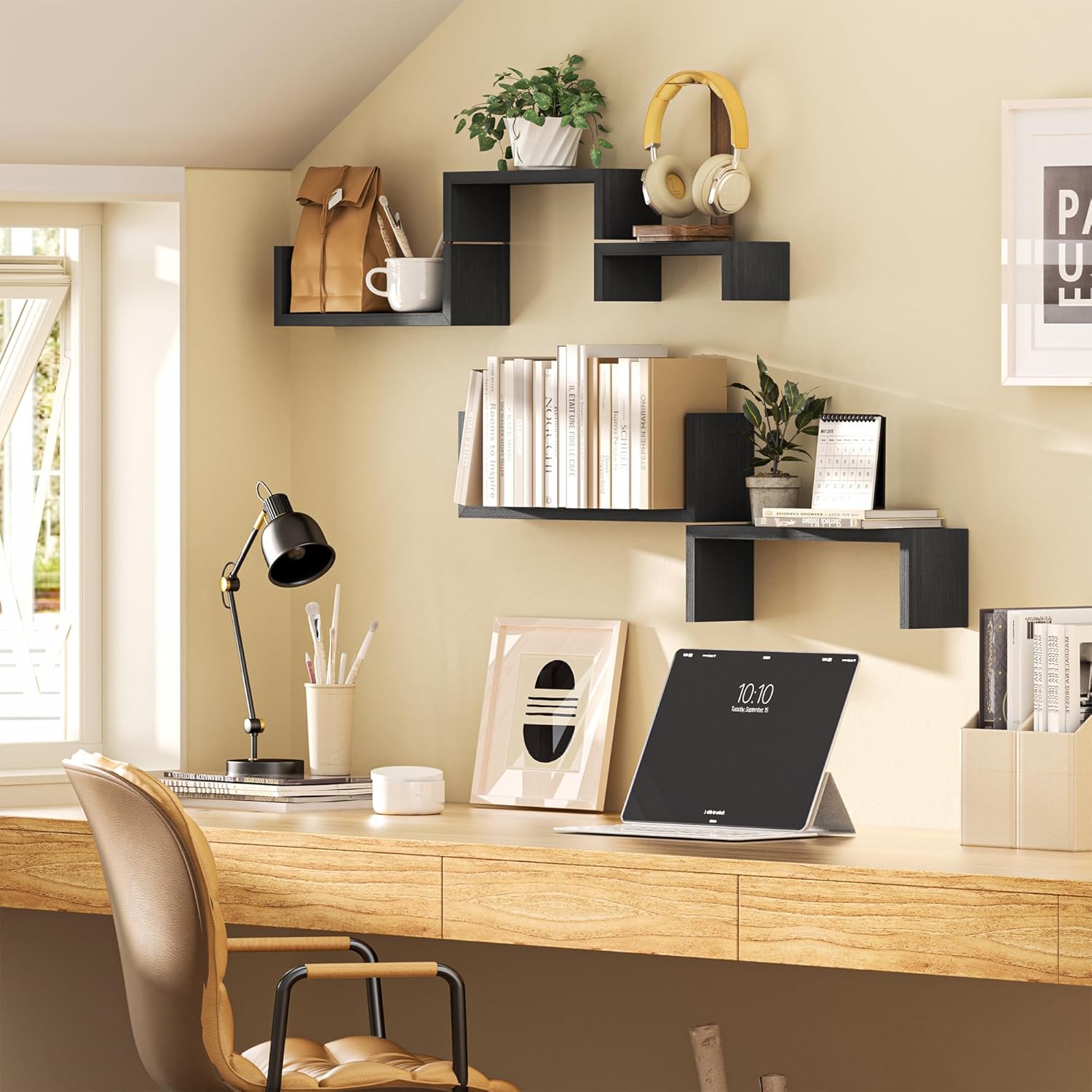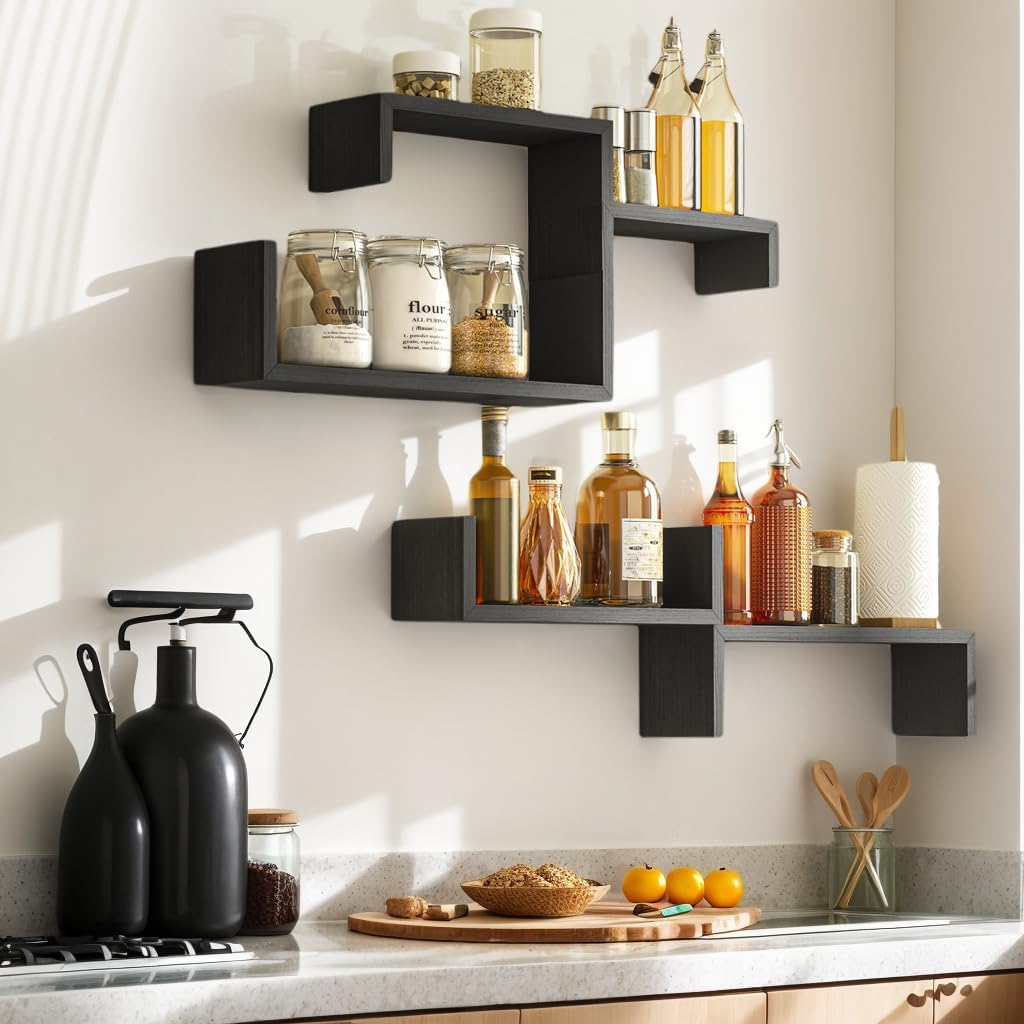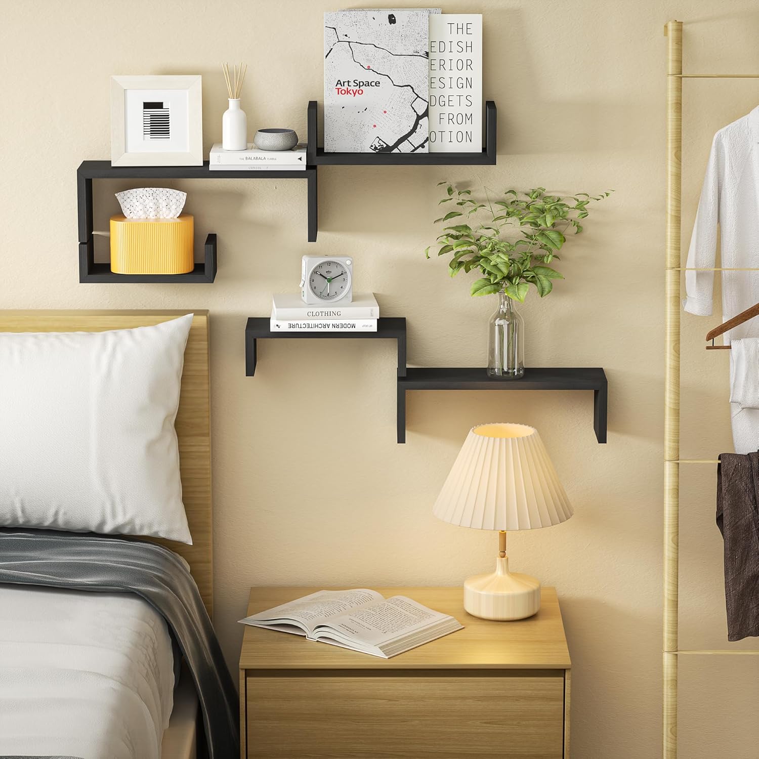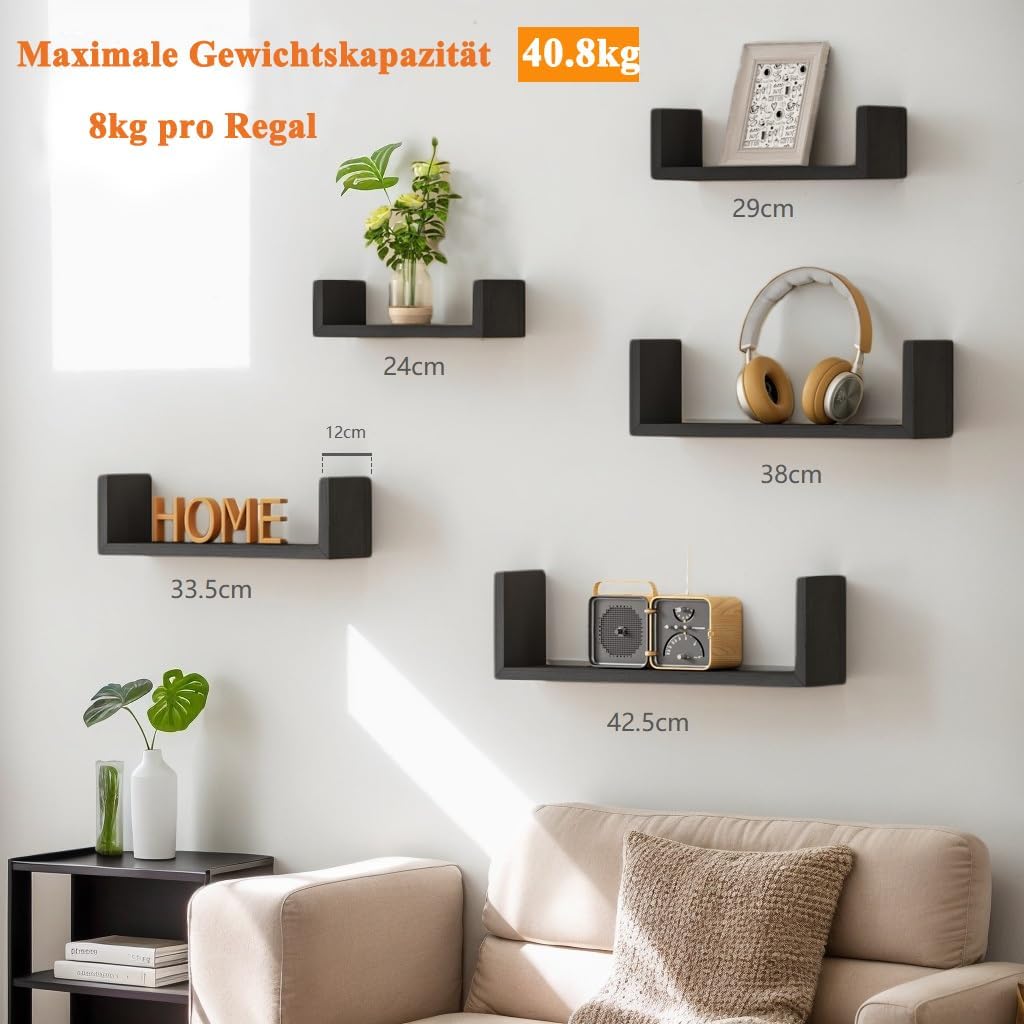 Komplet petih plavajočih polic omogoča učinkovito shranjevanje in estetski videz prostora. Masiven les in moderna oblika poskrbita za vzdržljivost in eleganco. Police so prilagodljive za različne postavitve glede na potrebe prostora.