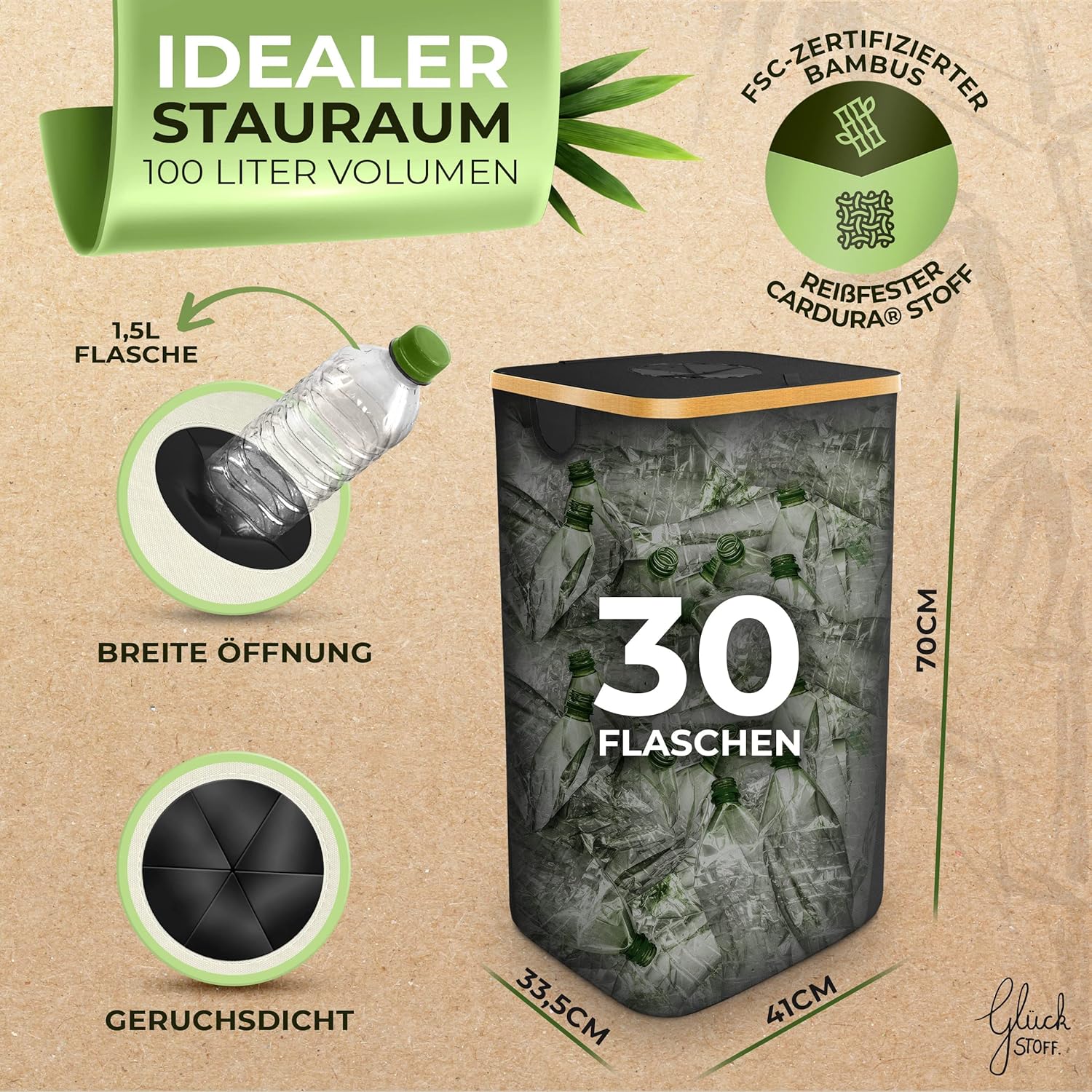 Velika prostornina 100 litrov omogoča praktično zbiranje povratnih steklenic in steklenih odpadkov. Pokrov z gumijastimi loputami omogoča vstavljanje brez odpiranja, hkrati pa učinkovito zadržuje neprijetne vonjave. Odstranljiva torba je pralna v pralnem stroju in idealna za enostaven prenos steklenic.