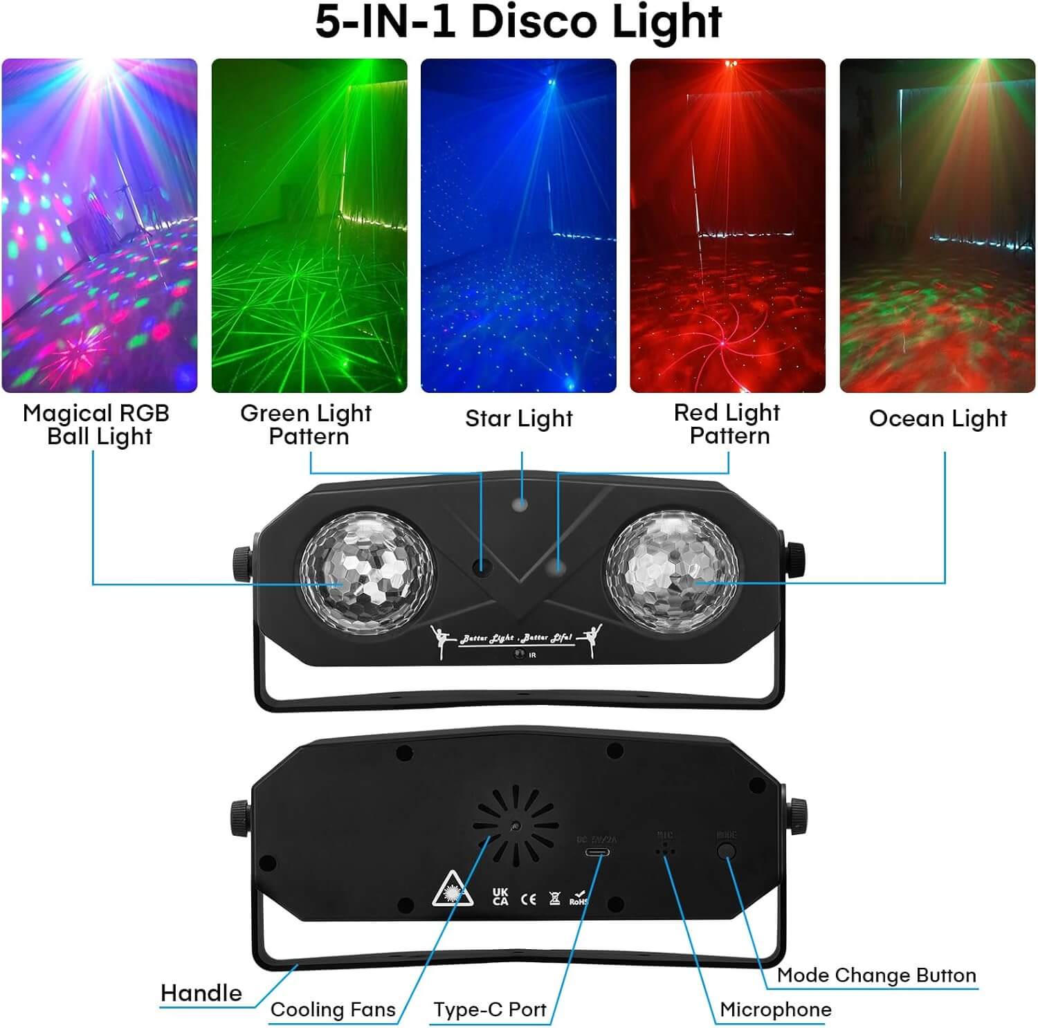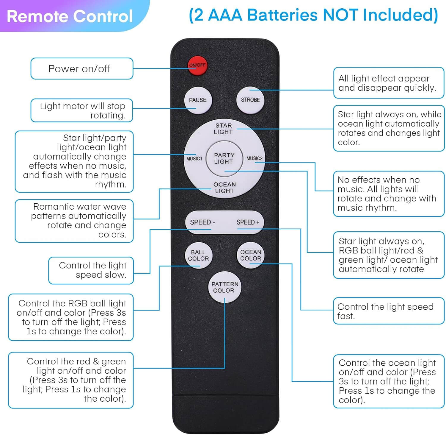 5-v-1 svetlobni učinki: Kombinacija zvezdnih učinkov, rdeče-zelene svetlobe, RGB kalejdoskopa in oceanskih projekcij za raznolike vizualne vzorce.