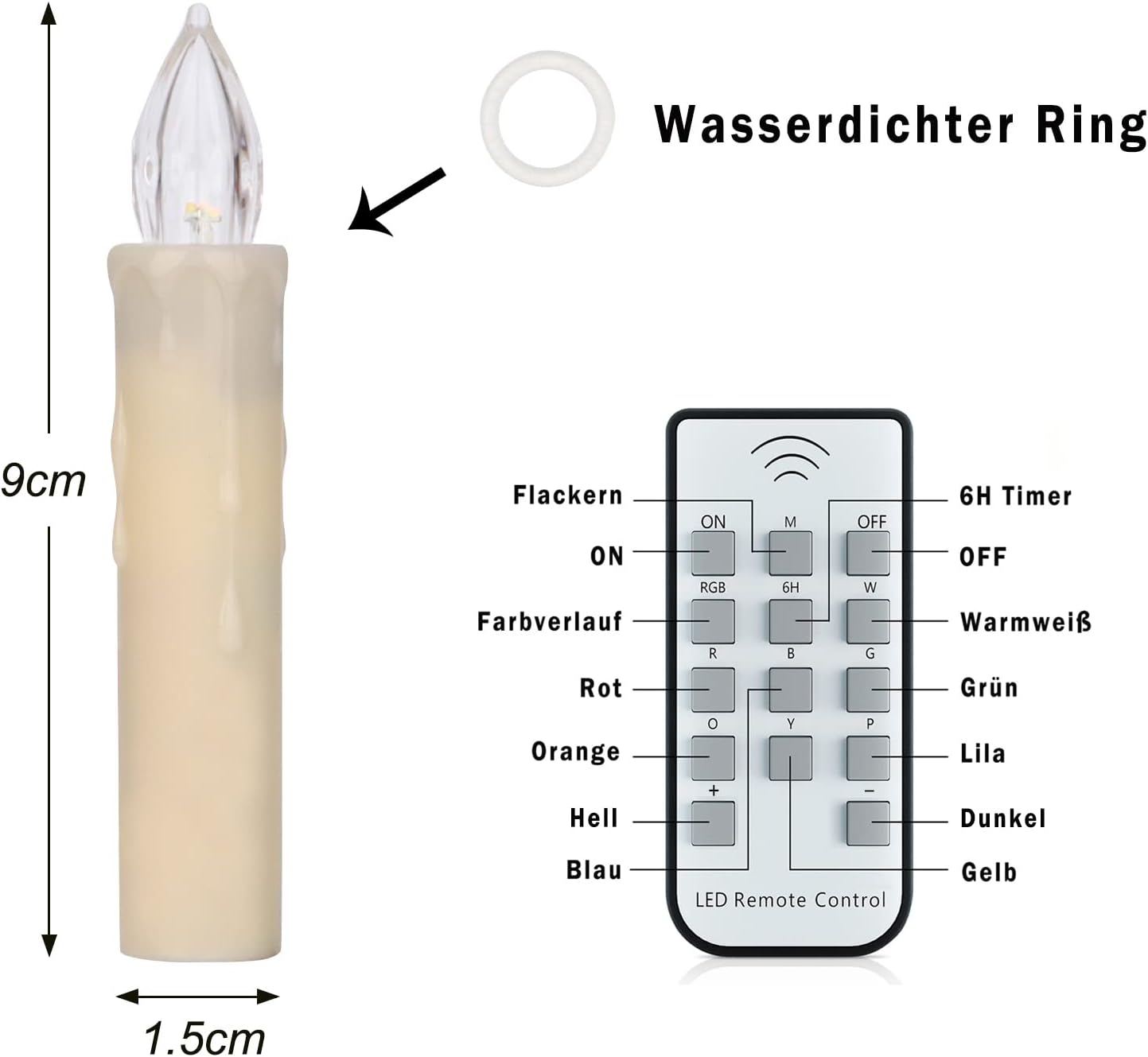 LED božične sveče z realističnim utripanjem ustvarijo prijetno praznično vzdušje. Daljinsko upravljanje in 6-urni časovnik omogočata enostavno uporabo. Vodoodporne sveče so primerne za notranjo in zunanjo uporabo.