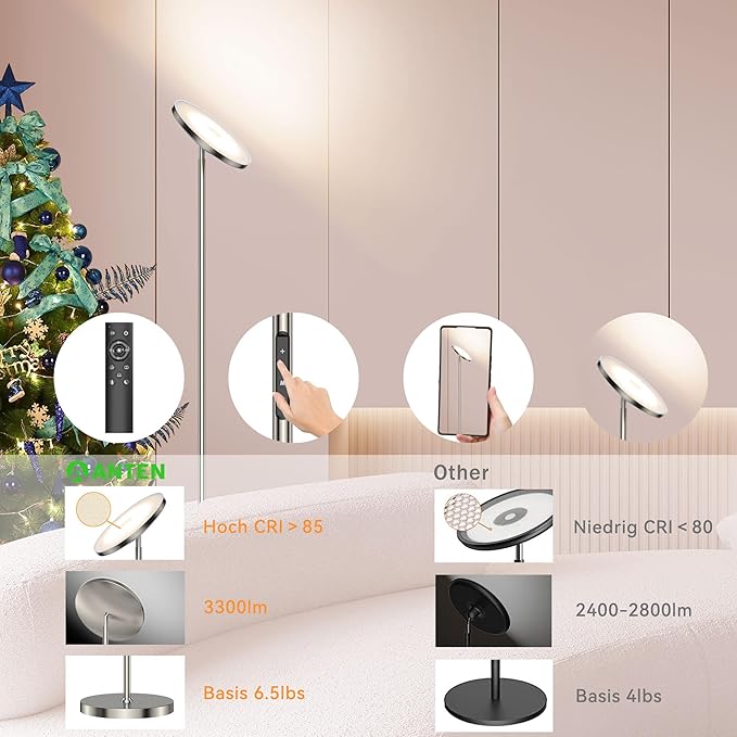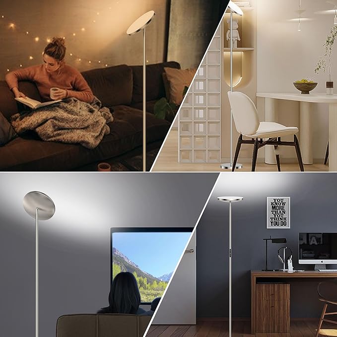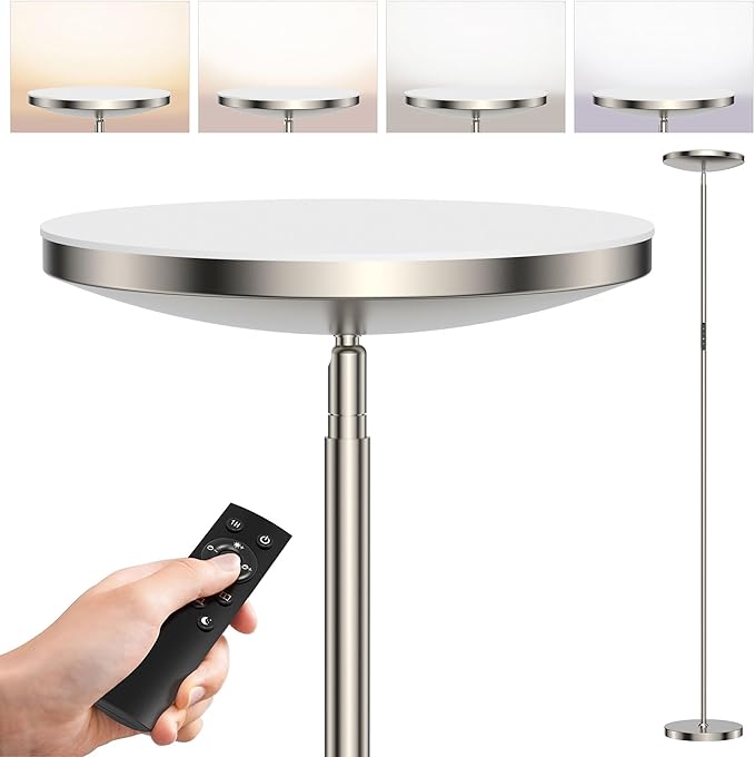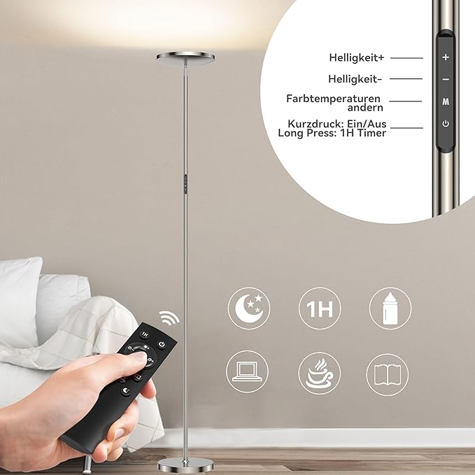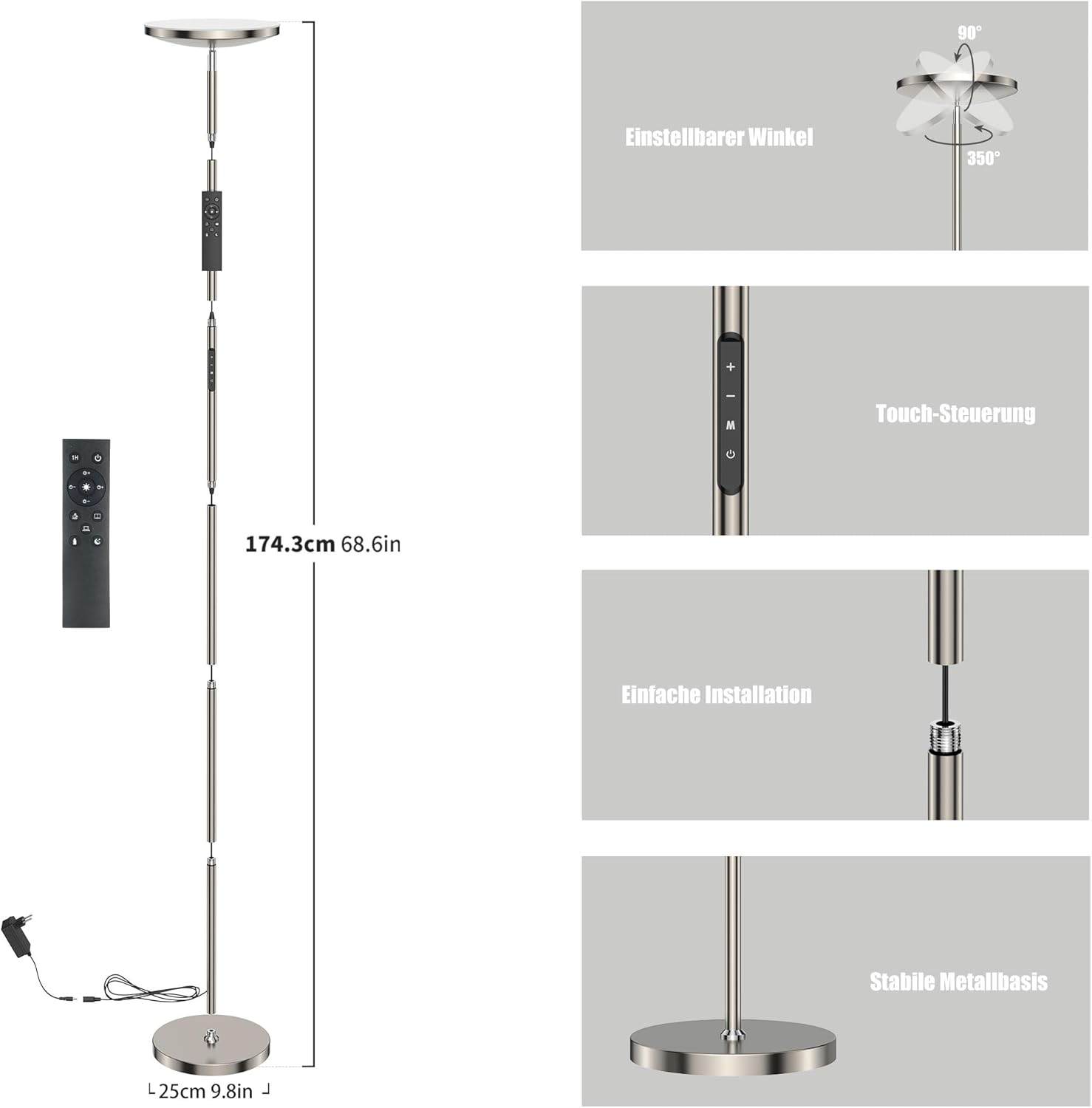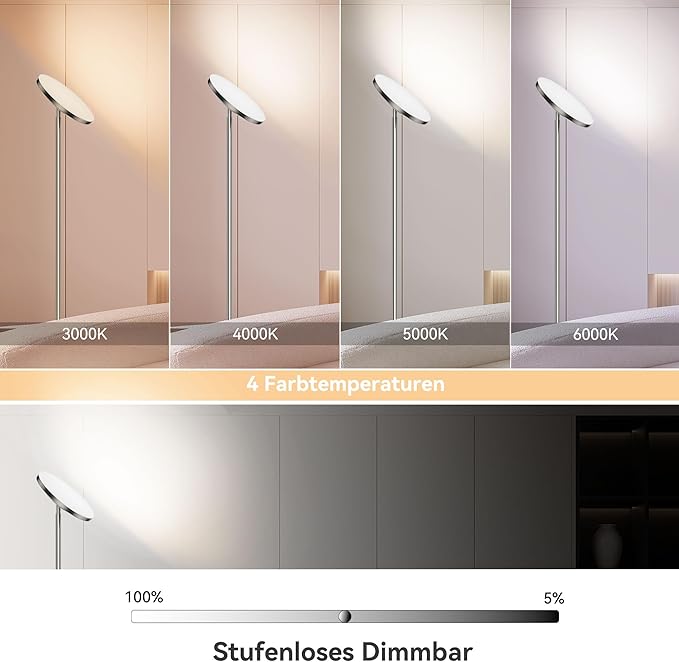 Sodobna LED stoječa svetilka z dimabilno svetlobo in štirimi barvnimi temperaturami omogoča prilagojeno osvetlitev za vsak prostor. Upravljanje na dotik in z daljinskim upravljalnikom ponuja enostavno uporabo. Svetilka ima dolgo življenjsko dobo in energijsko učinkovitost ter se elegantno poda v dnevne sobe, spalnice ali pisarne.