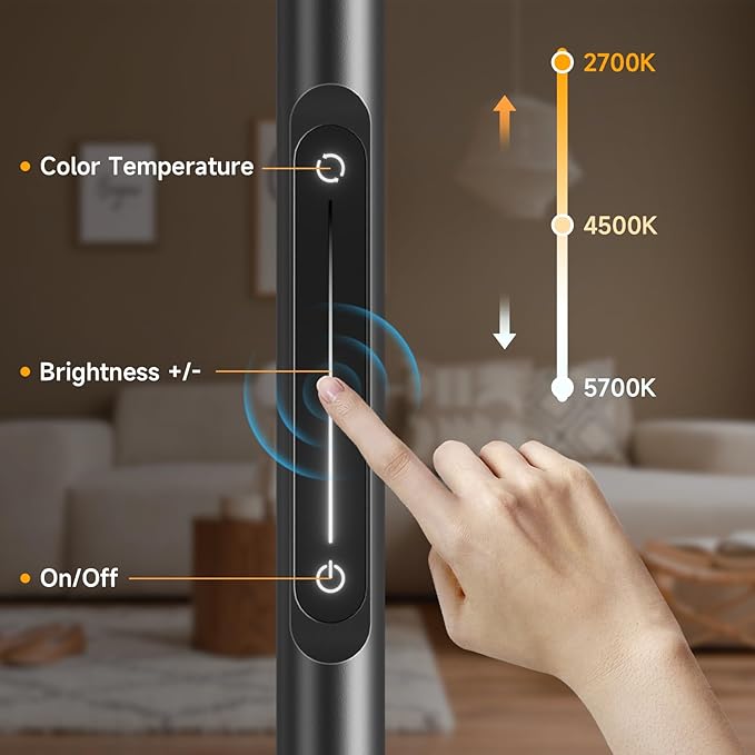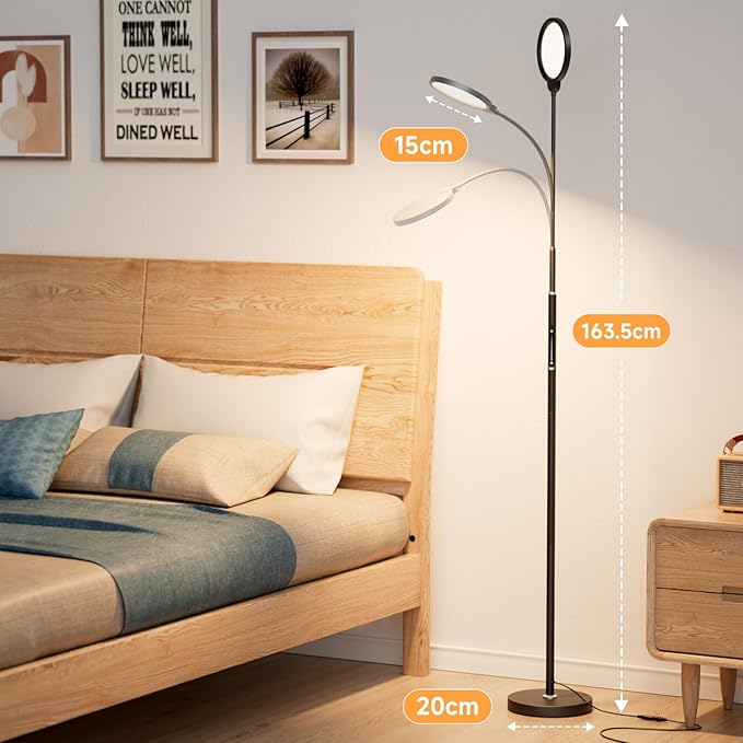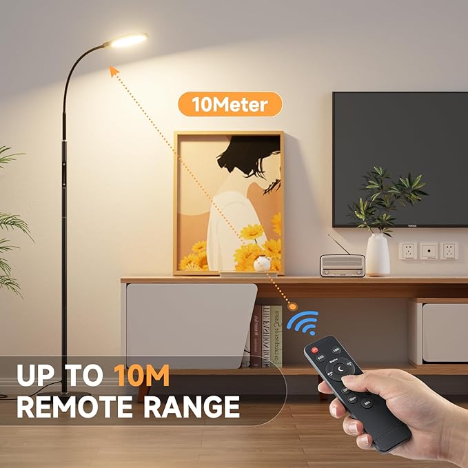 LED stoječa svetilka s prilagodljivim vratom nudi usmerjeno svetlobo za branje, delo ali sprostitev. Zatemnjevanje in barvna temperatura se nastavljata prek dotika ali daljinskega upravljalnika. Sodobna oblika in višina 170 cm sta idealni za dnevne sobe, spalnice ali pisarne.