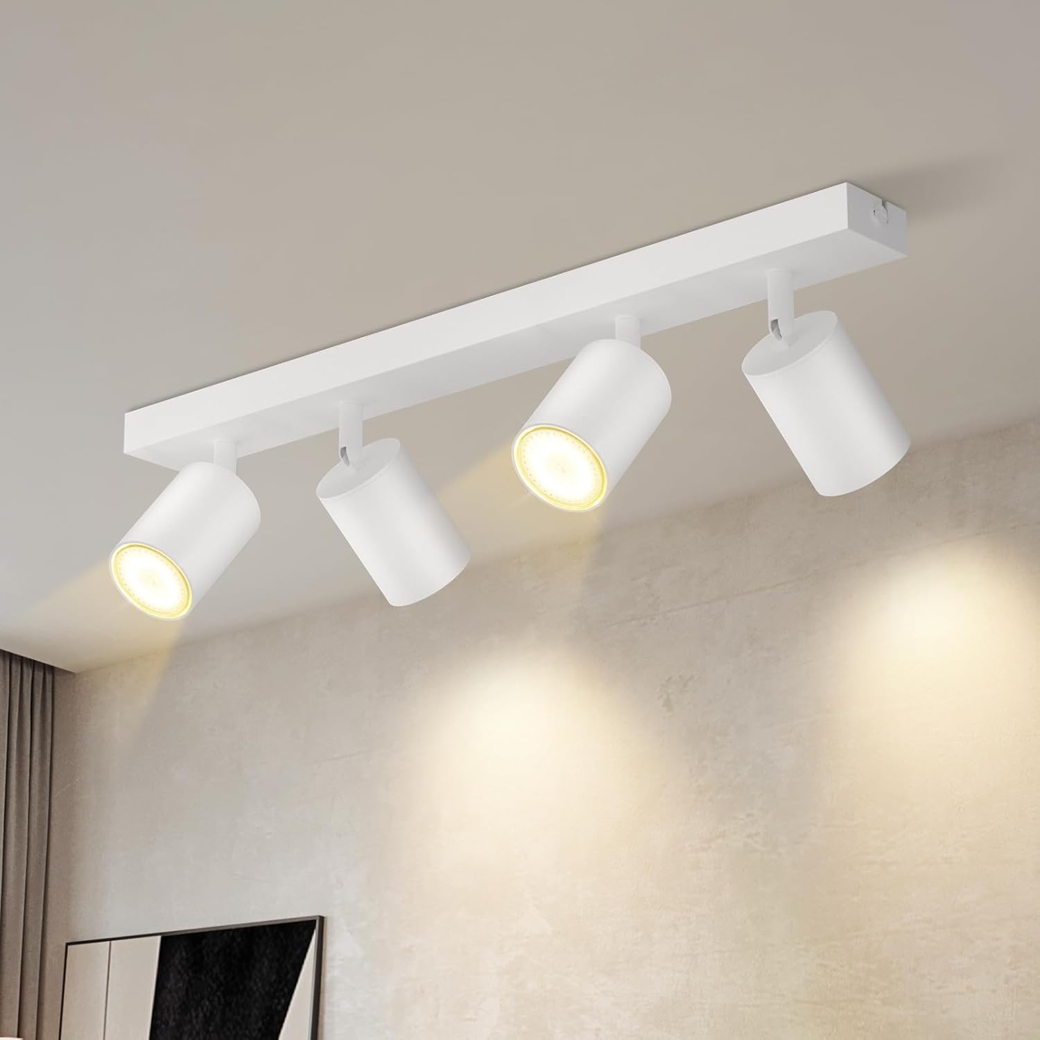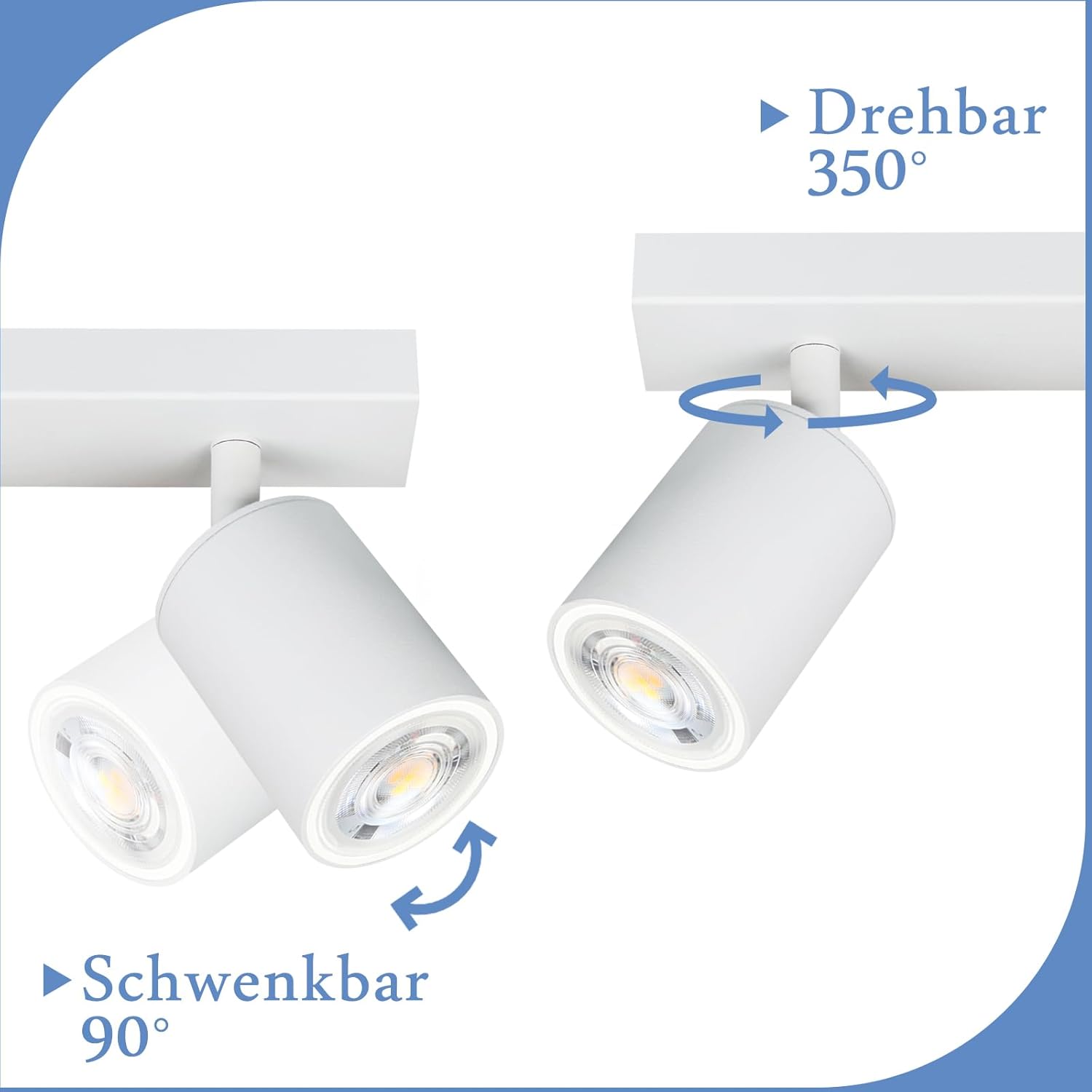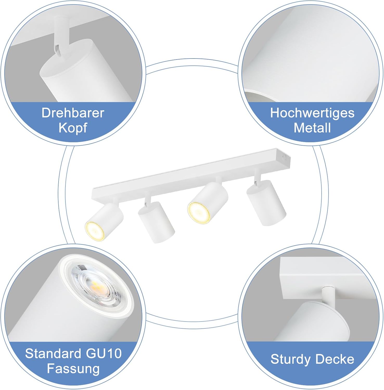 Sodobna zasnova stropne svetilke z 4 reflektorji v minimalističnem videzu doda eleganten pridih vašemu domu. Vrtljiva glava omogoča prilagoditev svetlobe do 350° v levo in desno ter 90° gor in dol. Univerzalna GU10 grla omogočajo uporabo različnih svetlobnih virov.