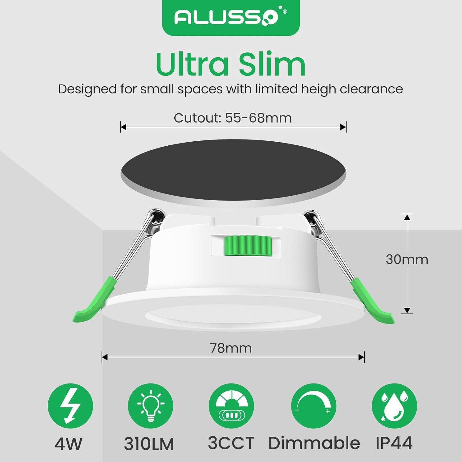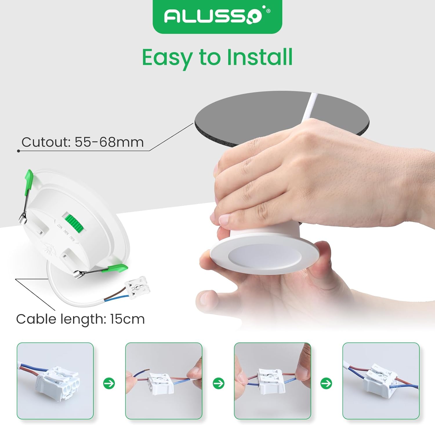 Zunanjost in izrez: Ø78 mm zunaj, izrez Ø55–68 mm