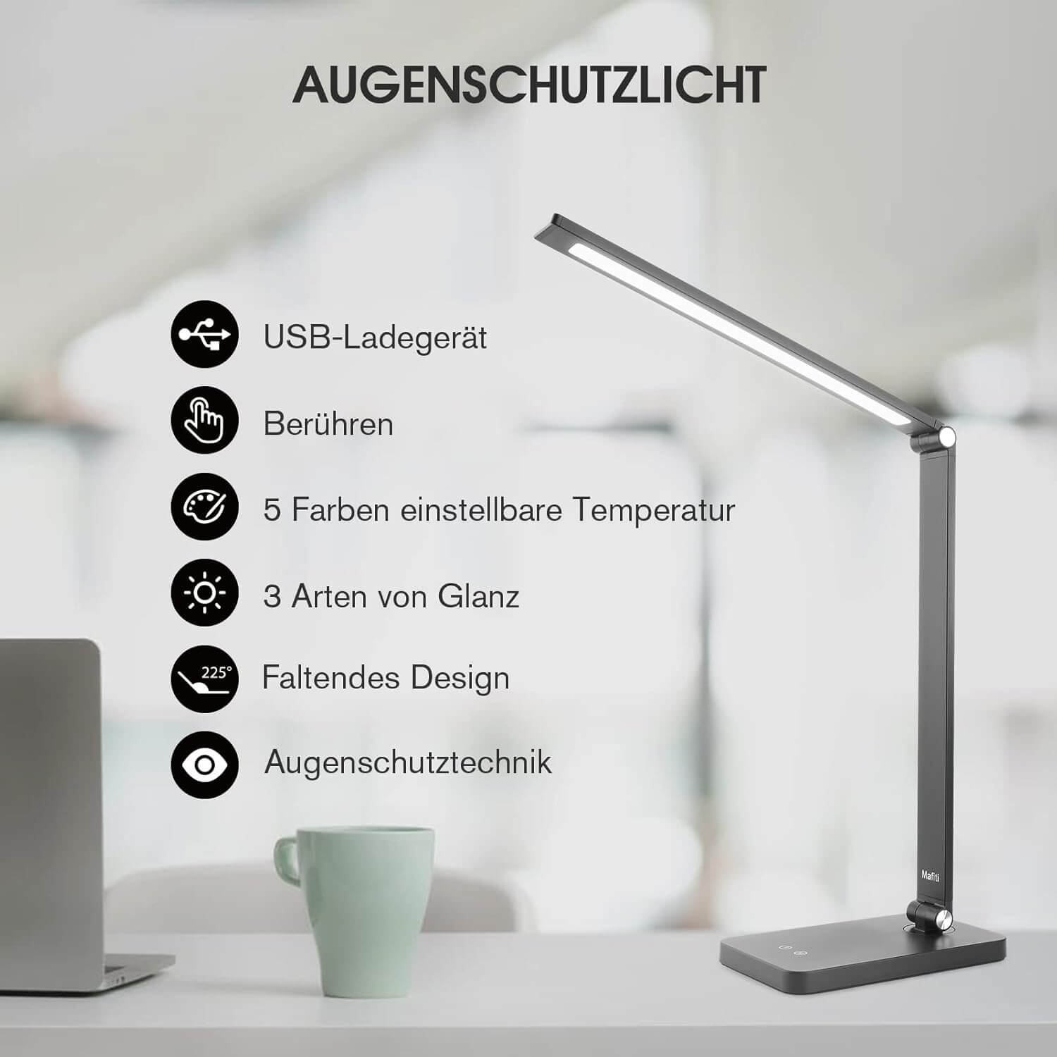 Namizna svetilka mafiti združuje prilagodljivo osvetlitev, moderno zasnovo in energijsko učinkovitost, kar jo naredi idealno za delo, branje in sprostitev.