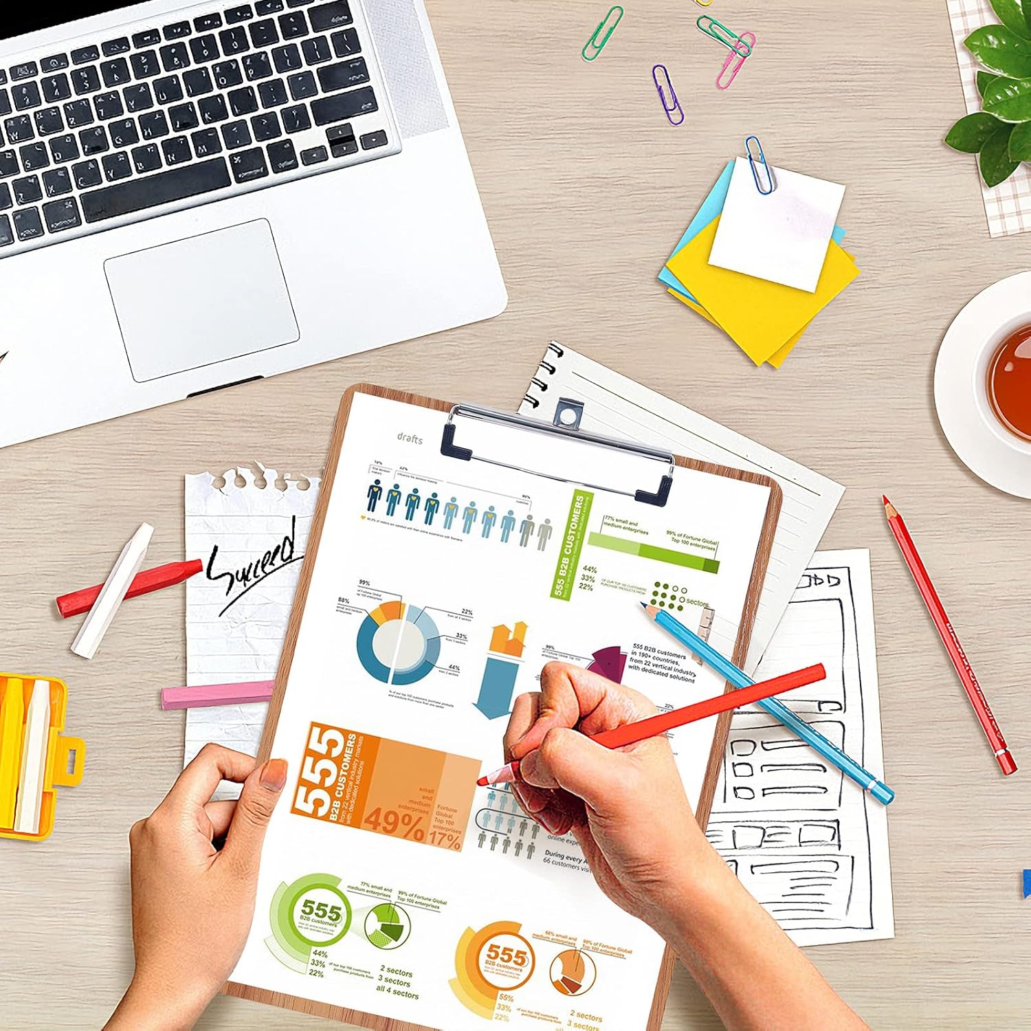 Komplet 6 lesnih podlag formata A5 z močnim kovinskim vpenjalom omogoča udobno pisanje in varno pritrditev papirja. Gladke površine in zaobljeni robovi skrbijo za prijetno uporabo. Idealno za uporabo v pisarnah, šolah in drugih delovnih okoljih.