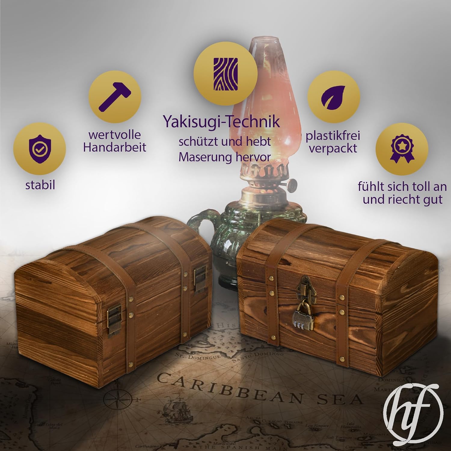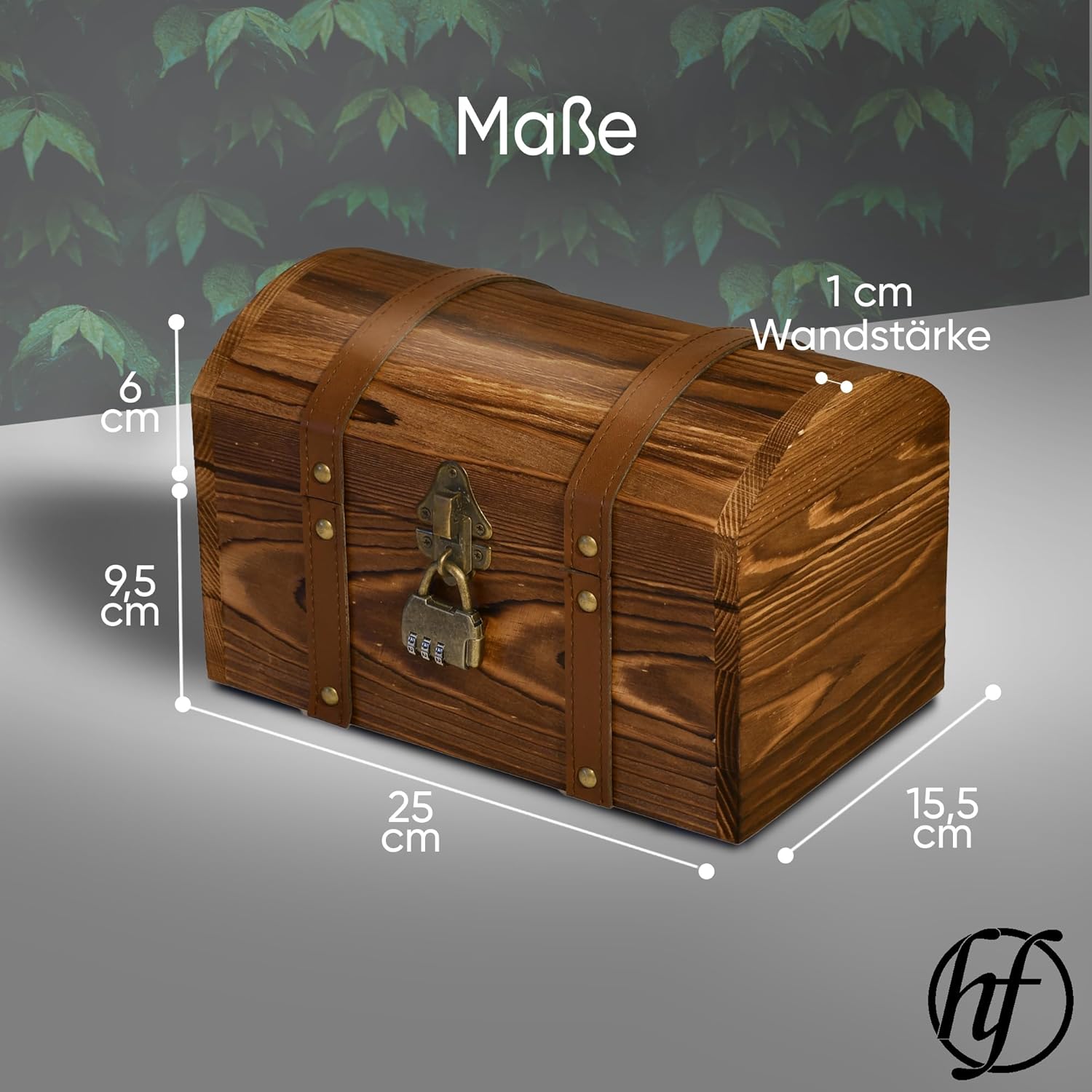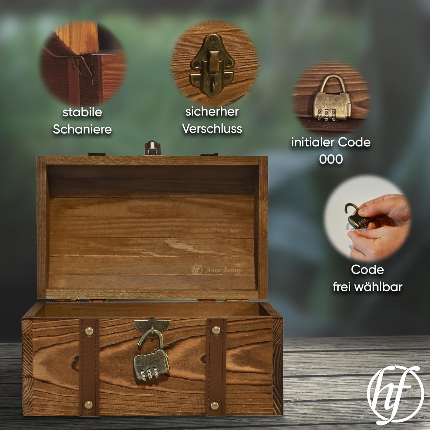 Ročno izdelana skrinjica iz masivnega bora v rustikalnem videzu. Služi kot čudovit dekorativen element ali praktična škatla za shranjevanje. Vključuje ključavnico s kombinacijo za dodatno varnost.